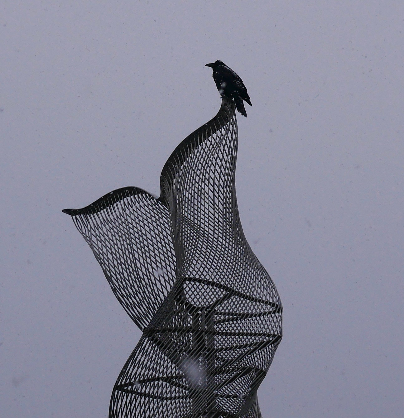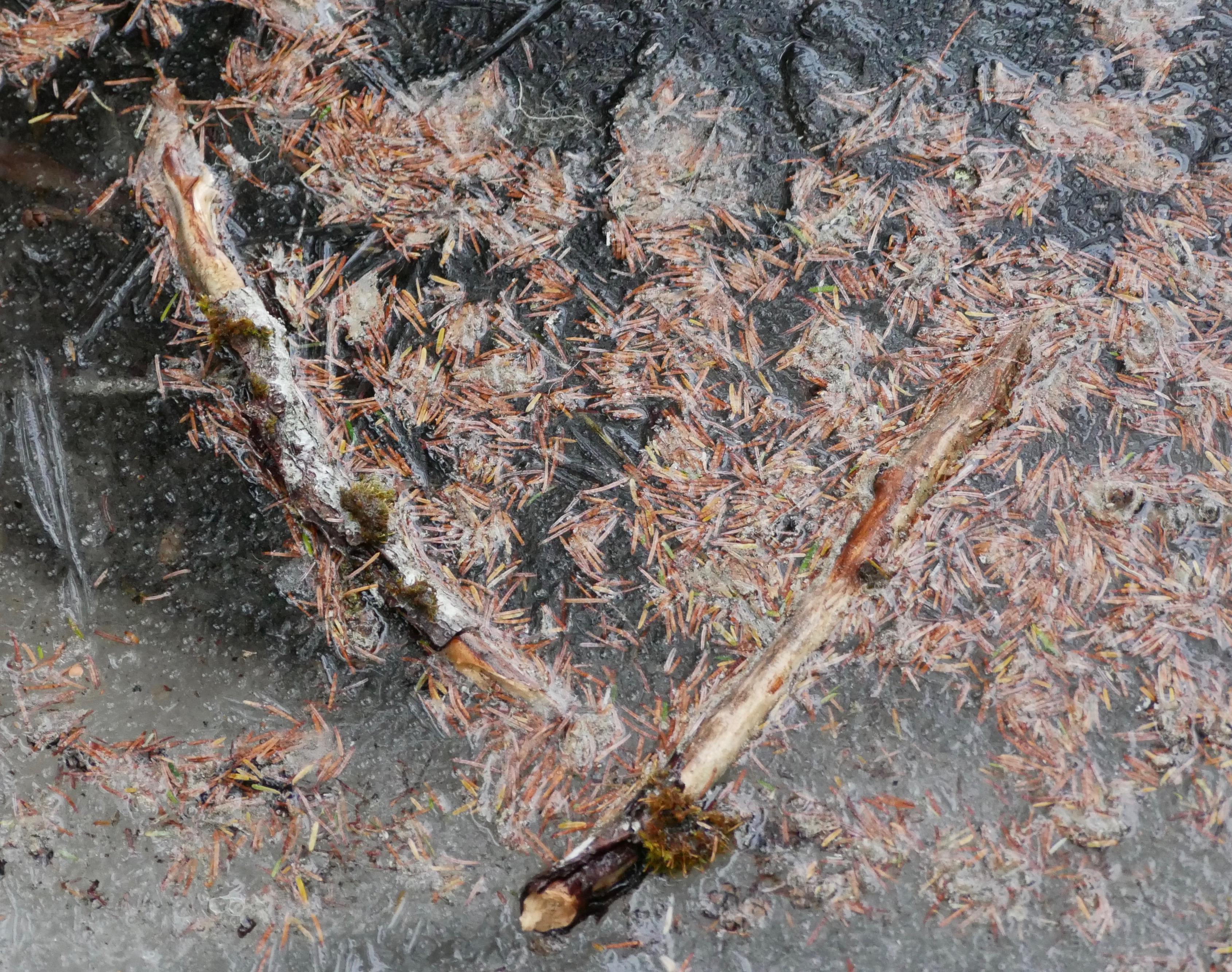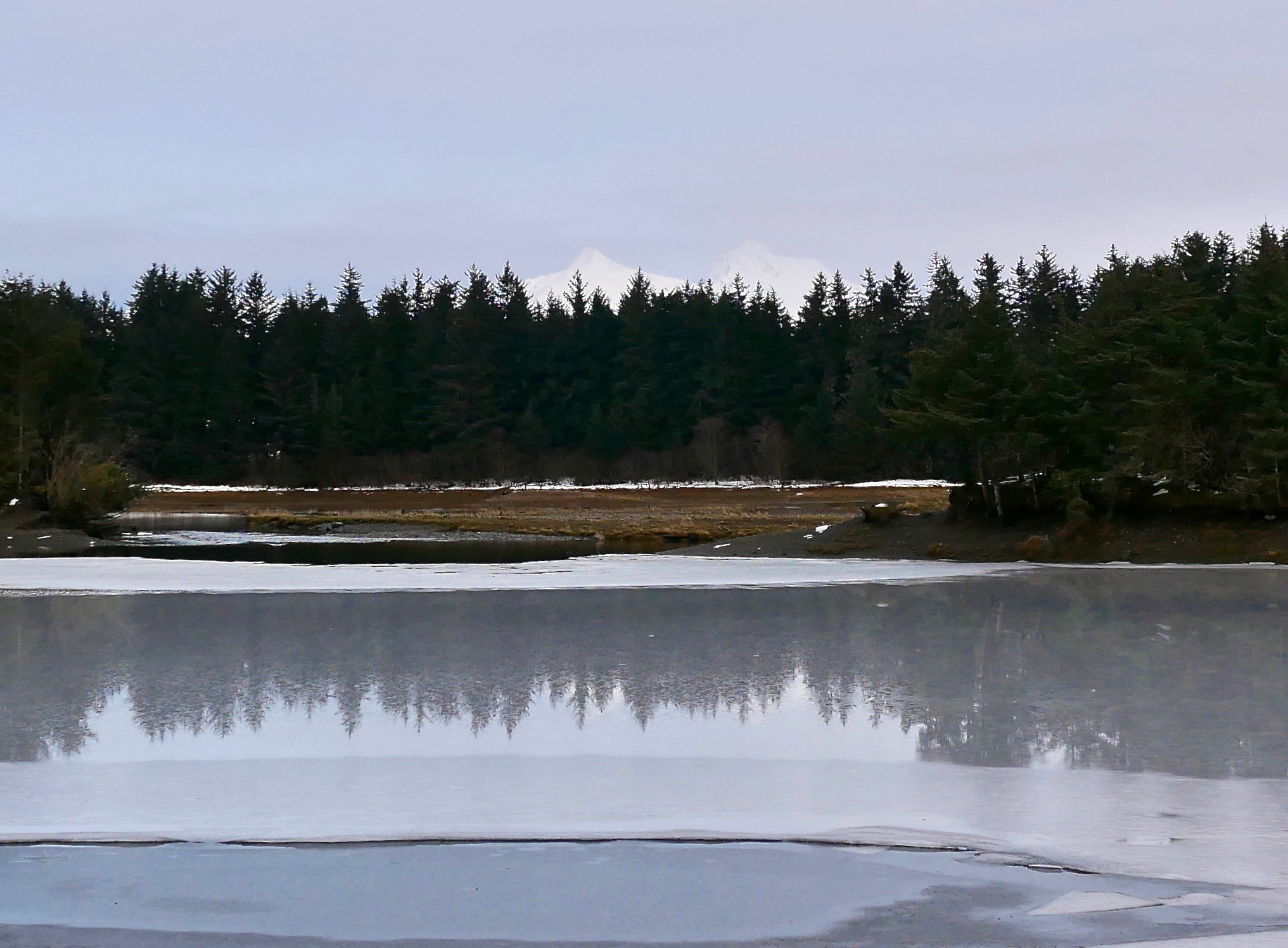 Every once in a while, Aki and I spot filtered sunlight through snow-burdened spruce trees. A full moon would cast more light in these woods. But hoping to see it reflected in salt water, I lead Aki to the beach. We have to be careful to move down the trail. I have to keep my eyes on the trail to avoid the dangerously icy bits.