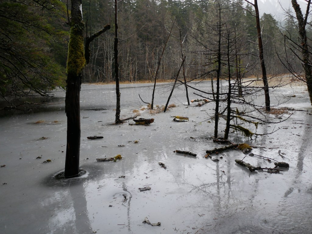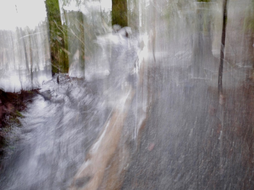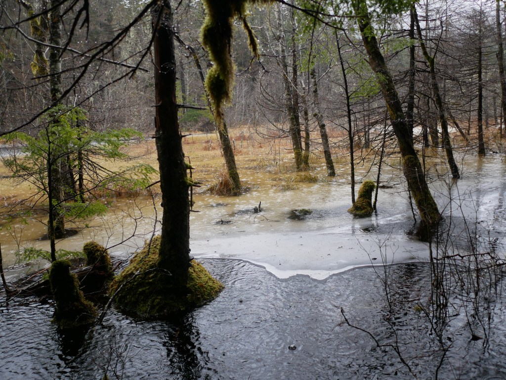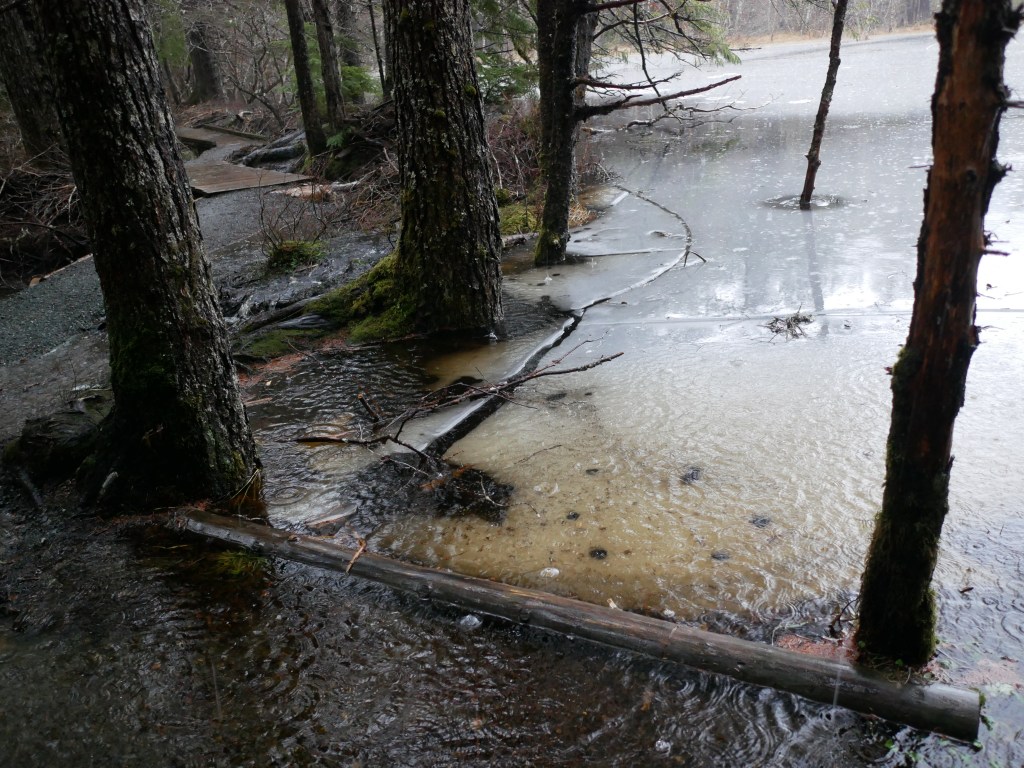 A few thousand feet into the forest, we hit the first problem—ten feet of flooded trail. Aki started to cross it first, slowly planting each step. He seems to think that if he slipped he’d be carried downstream by the little flood. This slowed me down, allowing more water to slip into my boots.
