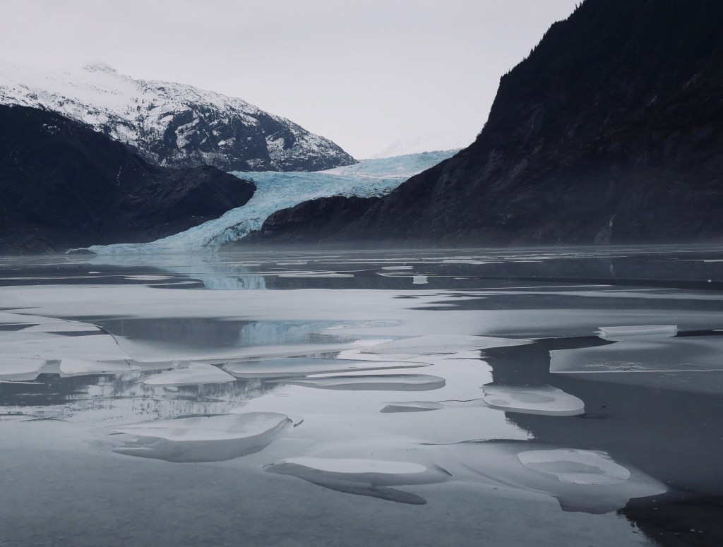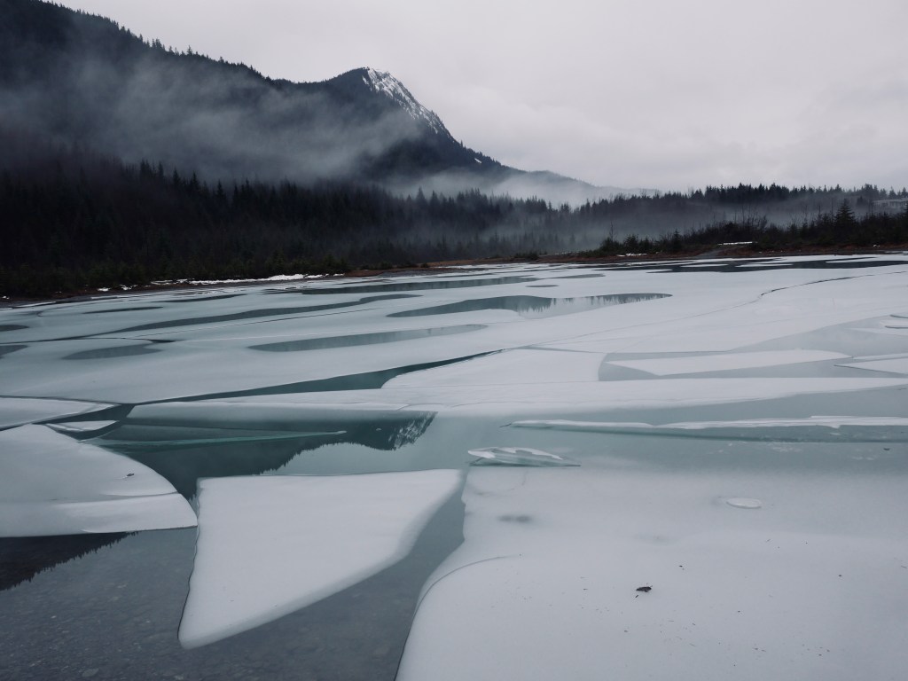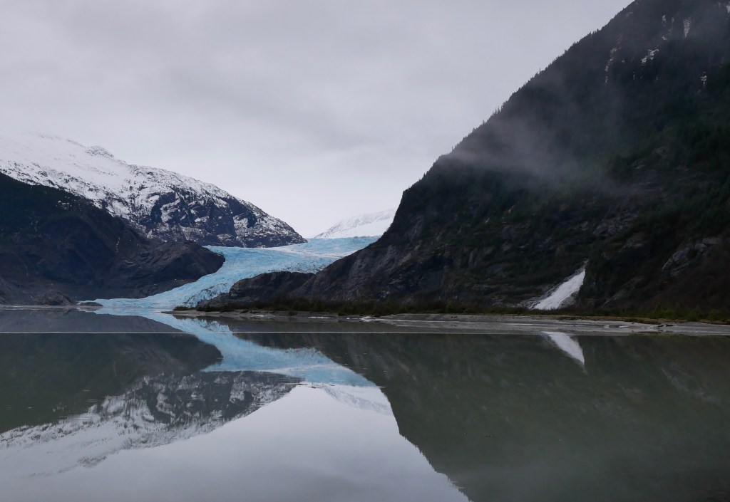 When we left the parked car, Aki’s other human and I were expecting more snow or rain to fall. The just finished storm melted the lake ice, which surprises us. So does the absence of wind that would otherwise prevent the lake surface from reflecting the glacier and its surrounding mountains.