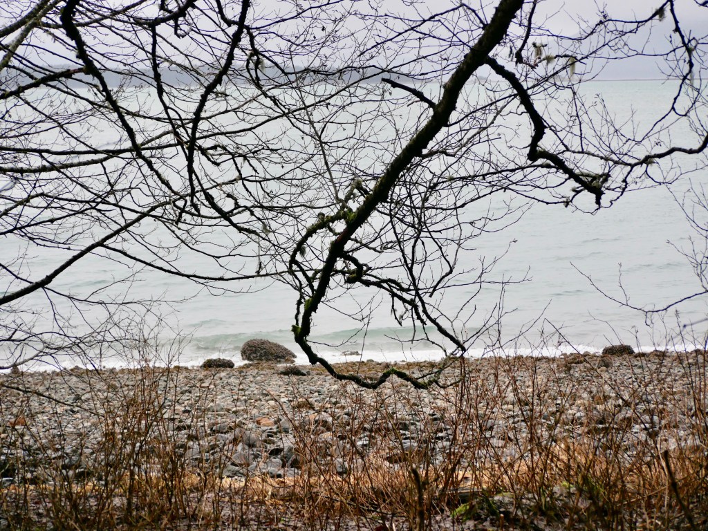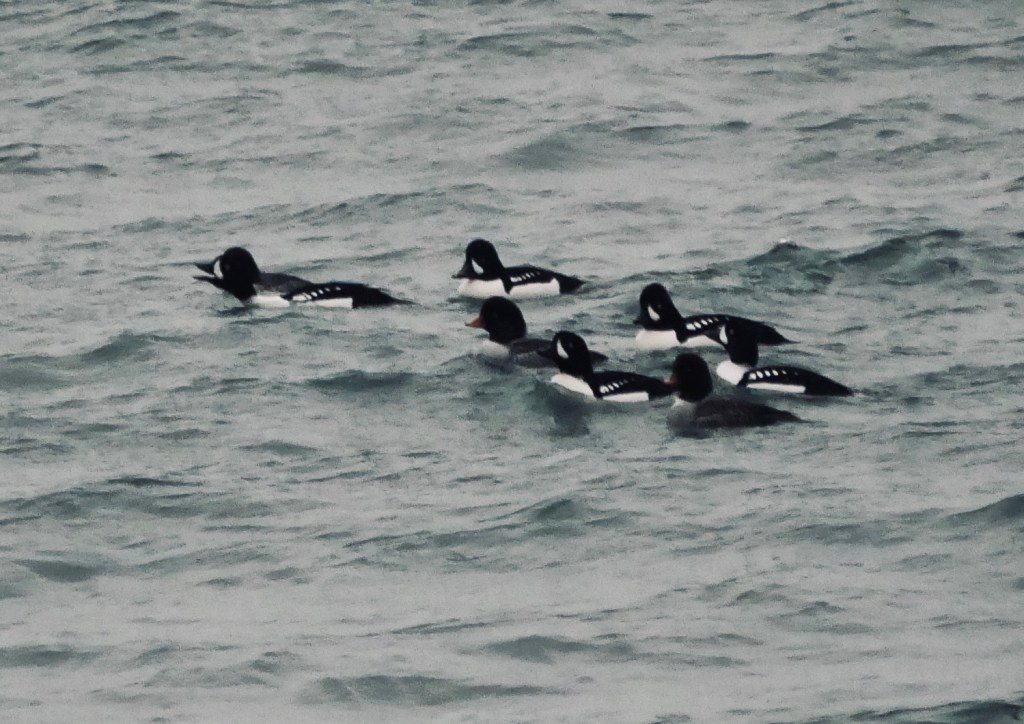 The beach is almost empty of pups and their people. Maybe this is why tight knots of surf scoters and Barrow golden eyes work the surf line. In seconds, one of the groups disappears by diving into the water. Seconds later the ducks pop back up, tiny fish already settling into their stomachs. They the heavy rain returns.