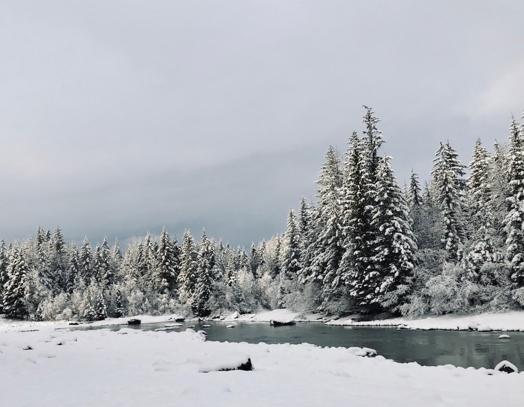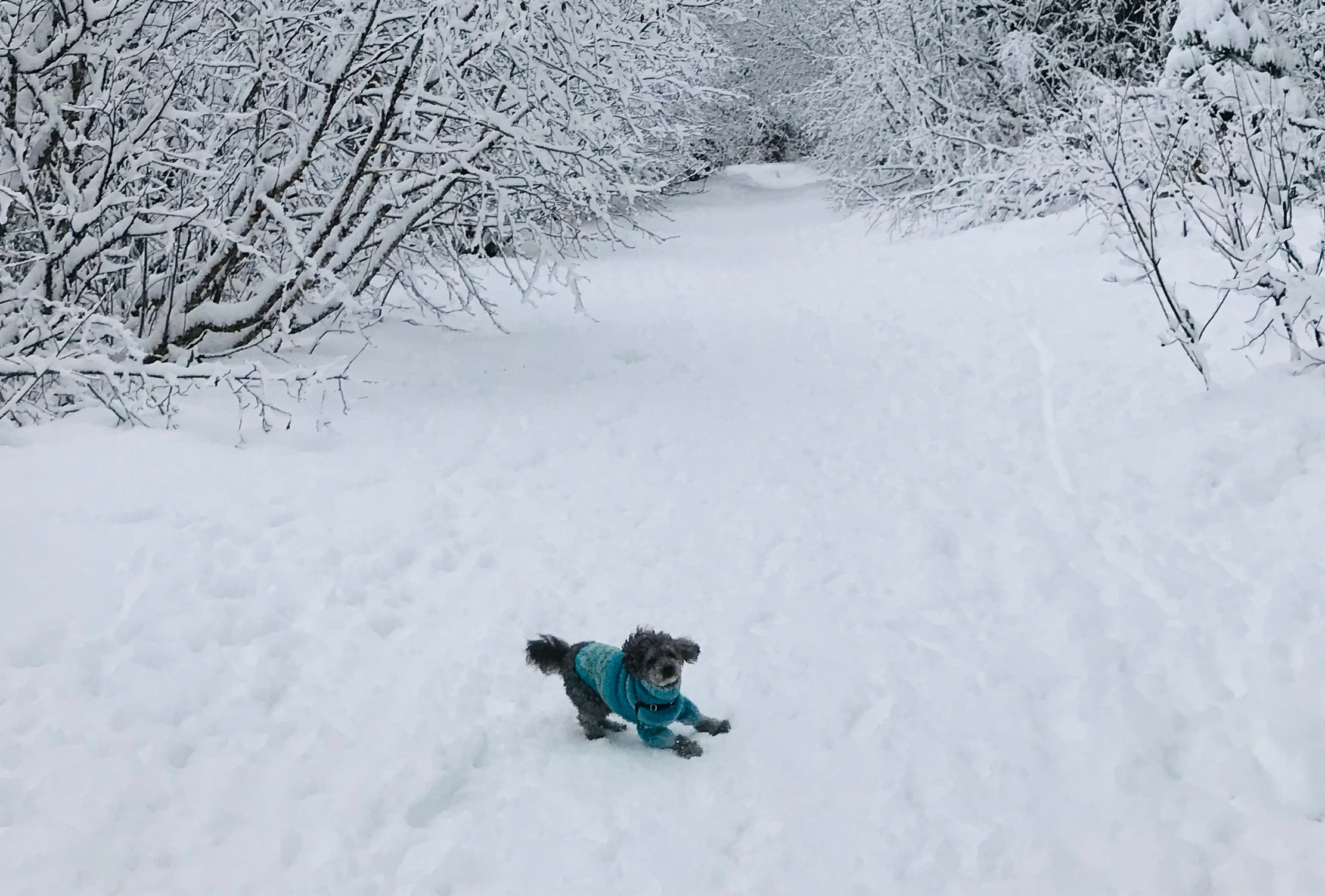 Heavy snow clung to all the trees and bushes lining the trail. The snow pulled down the thinner trunks, forcing us to slip under some of them if we wanted to make it round the lake. If the temperature continues to drop, we will be able to cross the lake ice. Aki doesn’t care. She is on fire today, dashing down the trail then flying back toward us. When not running, she stops to sniff spots under trees where snow can’t reach.