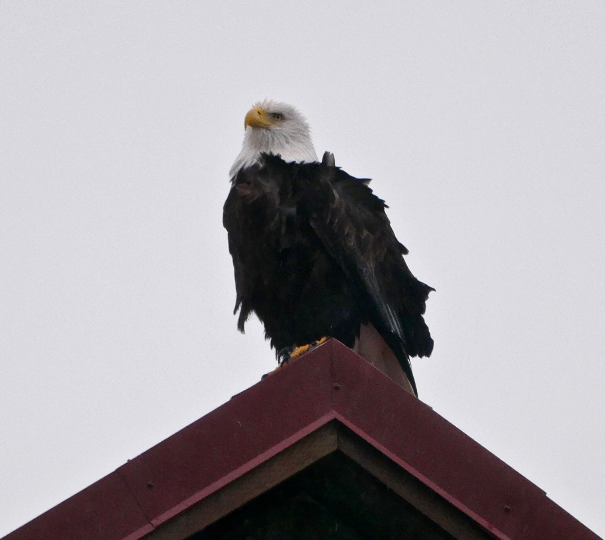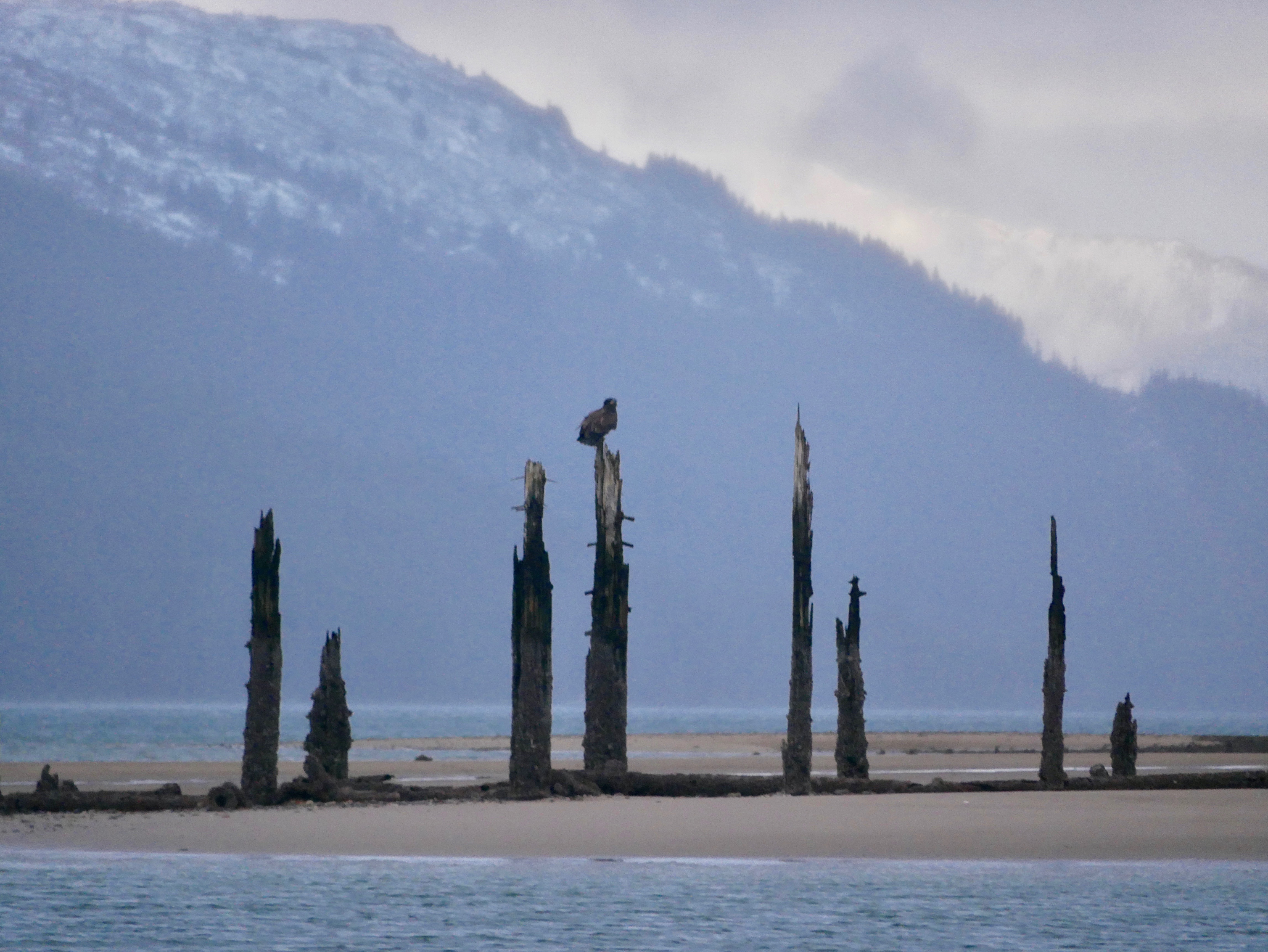I stopped to photograph the eagle because it is rainy, the kind of rain that usually keeps eagles off Sandy Beach, where are heading. We drive over to Treadwell Woods and have the place pretty much to ourselves, at least until we reach the beach and spot a very wet bald eagle. It stands on the roof of a mining vent tower, looking quite bored.