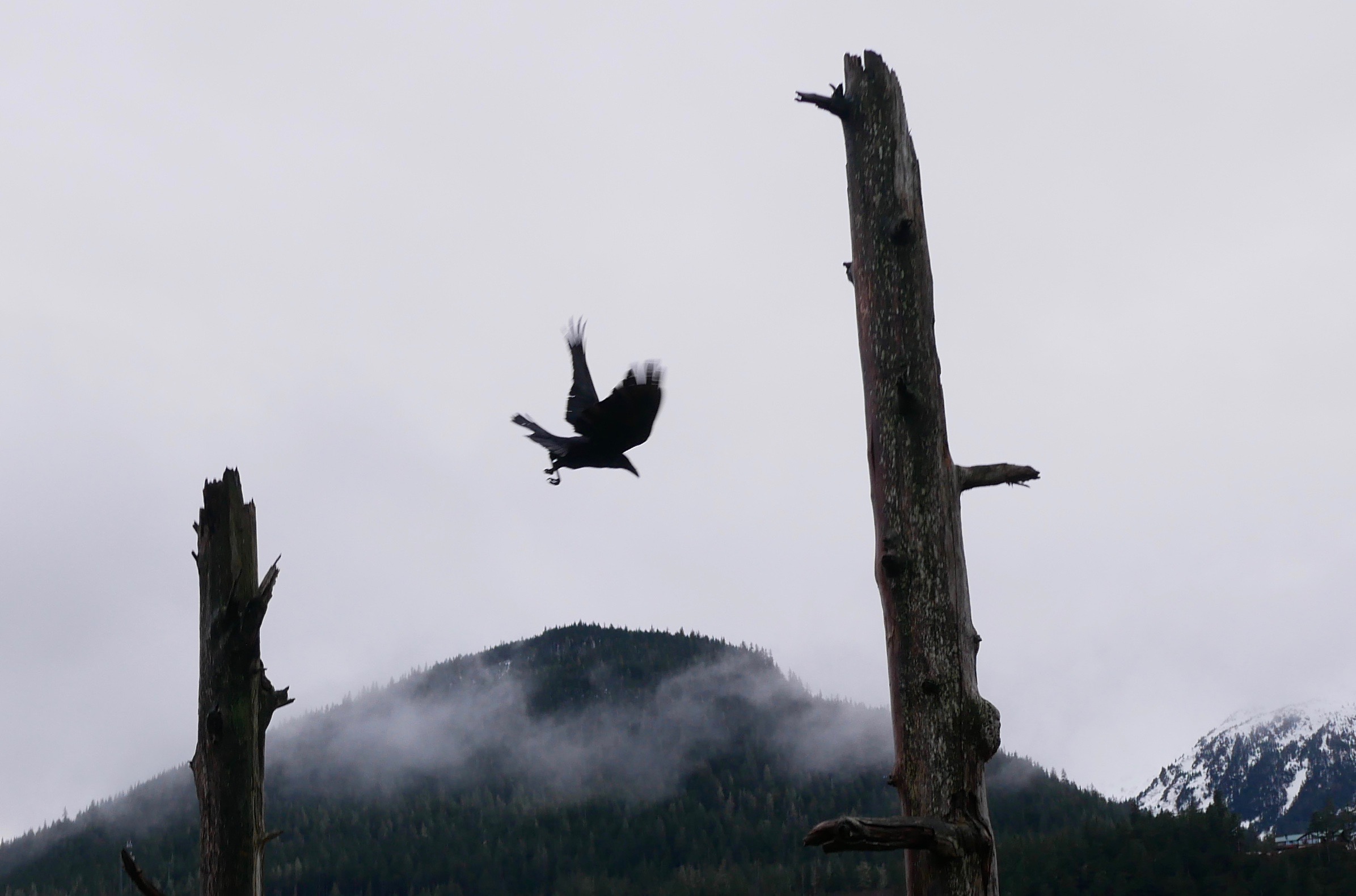 The big iron whale statute flies nose-first out of a tiny people park, looking out of place so near the Douglas Island Bridge, state office buildings, and cheap-by-the-week apartments. After giving the whale a quick glance, Aki and start across a wooden walkway. We are alone except for a small gang of ravens. Most are jumpy. But one, perhaps one of ravens that nests in our neighborhood, doesn’t react negatively as we walk past it. It just turns calmly in our direction and nods.