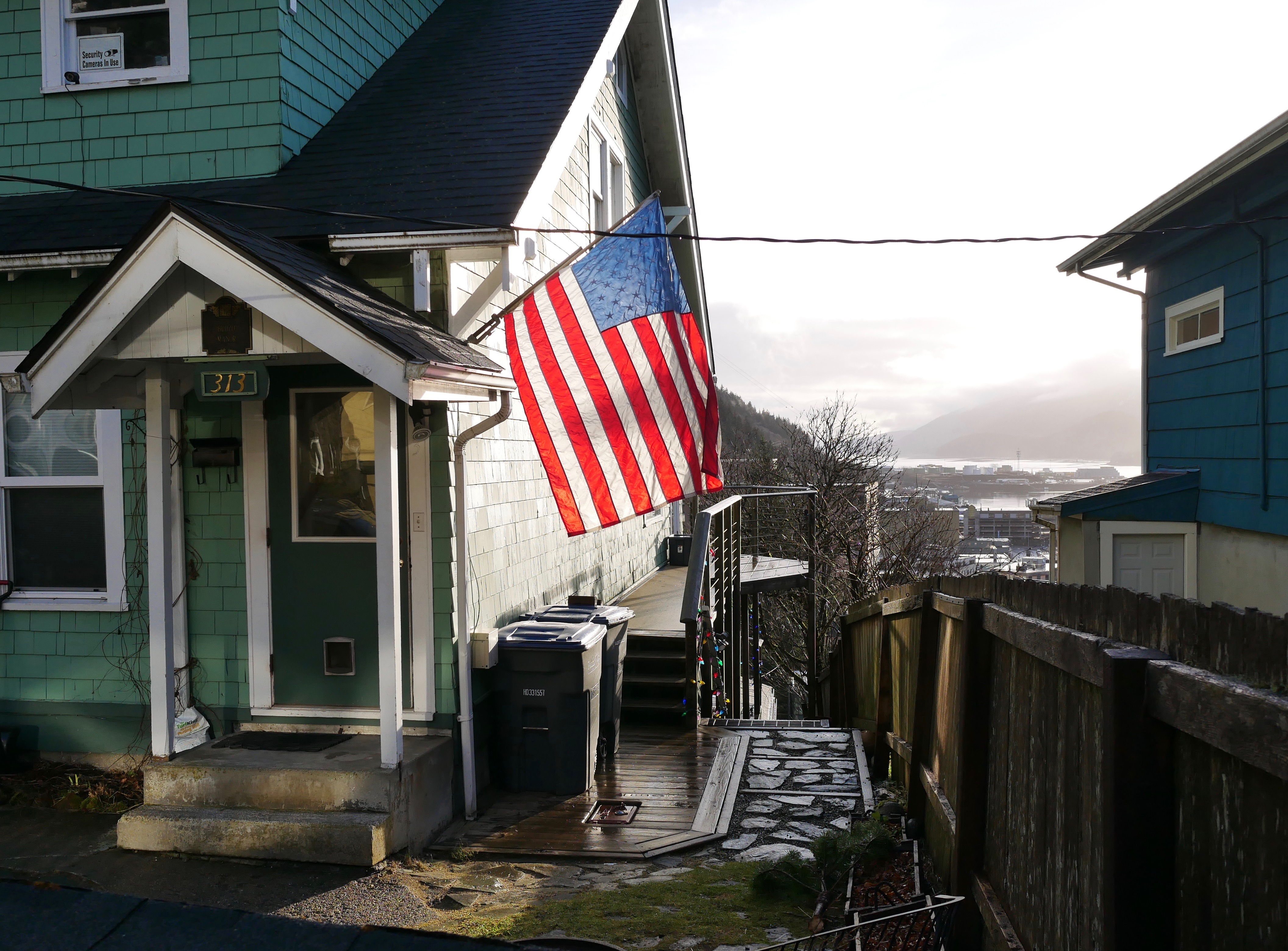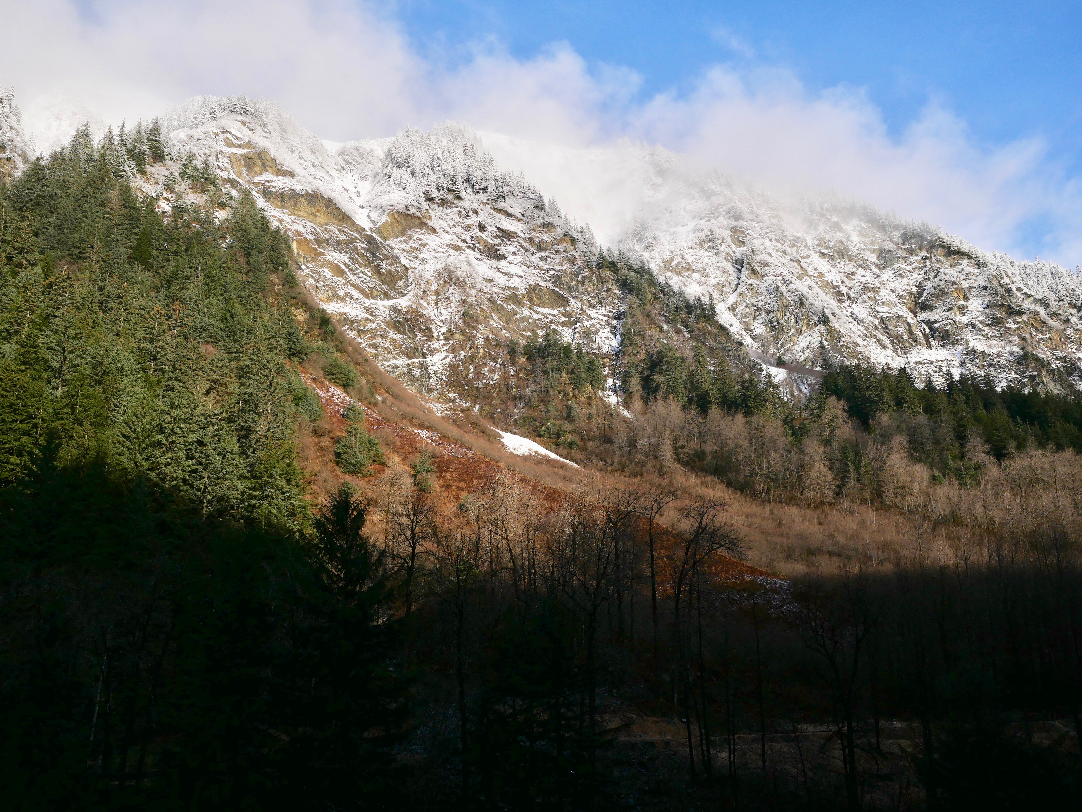 Even though yesterday a sliver of sun lit up a chunk of shrinking blue sky, I expected today to be weighed down by wet, gray clouds. Aki and I left the house as soon as possible to hike up Basin Road so we could see sunlight almost setting fire to the mountain slopes. Mt. Juneau rose out of the shadowy darkness of the Gold Creek valley. My camera was overblown by intense light bouncing off the steep mountain sides. Then clouds returned, eating the mountain light until it disappeared under a veil of grey.