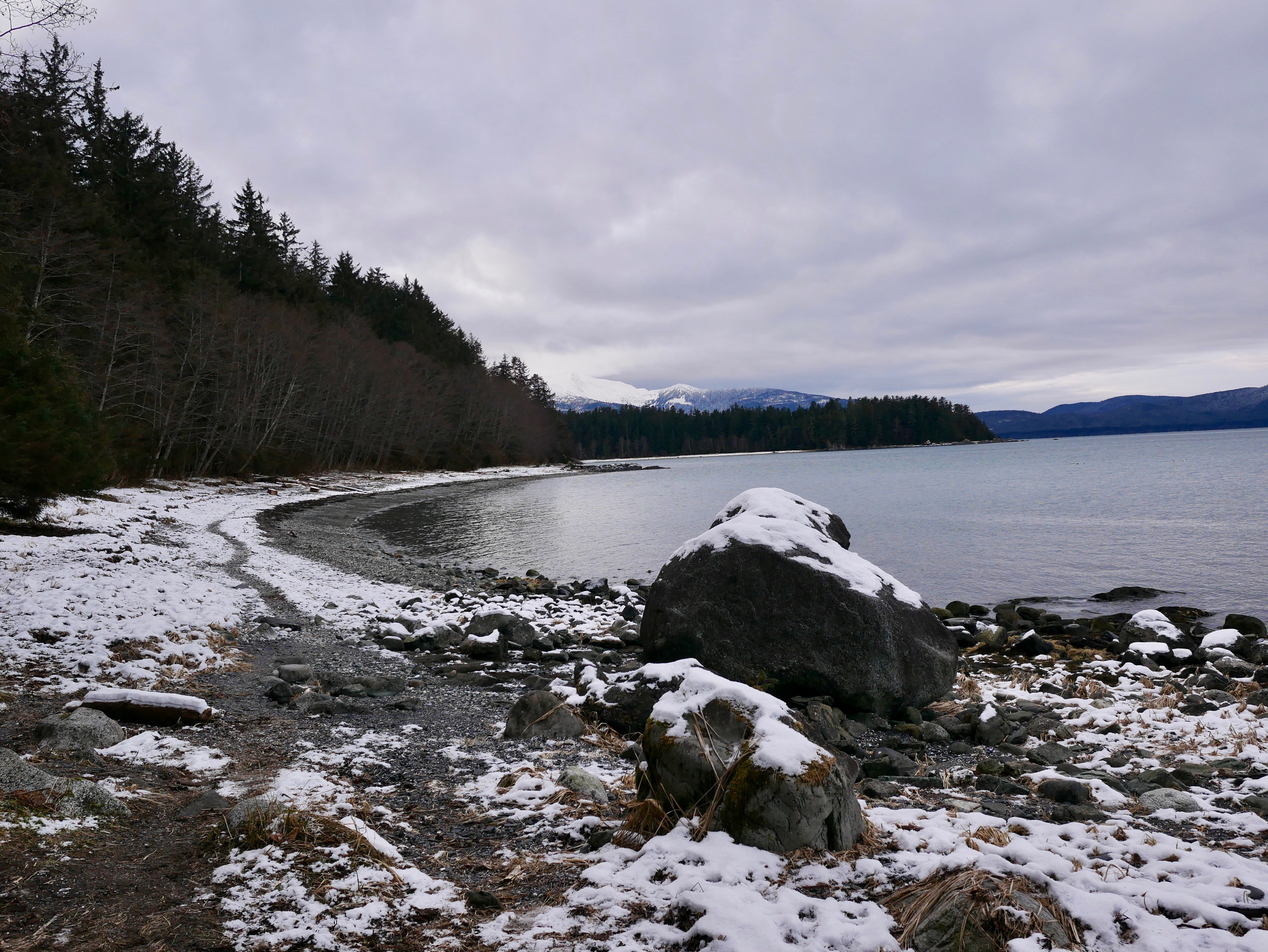 We still go out, driving out North Douglas Island while a slight wind blows. There are few birds, let alone eagles. A few sea lions swim far offshore, to far away to really see. Shafts of light are fading away for a mountain rang across the channel. Patches of brighter light makes the glacier and its mountains sparkle, and fade away.