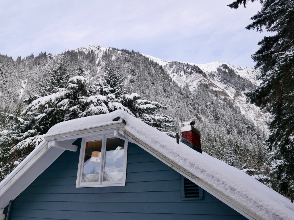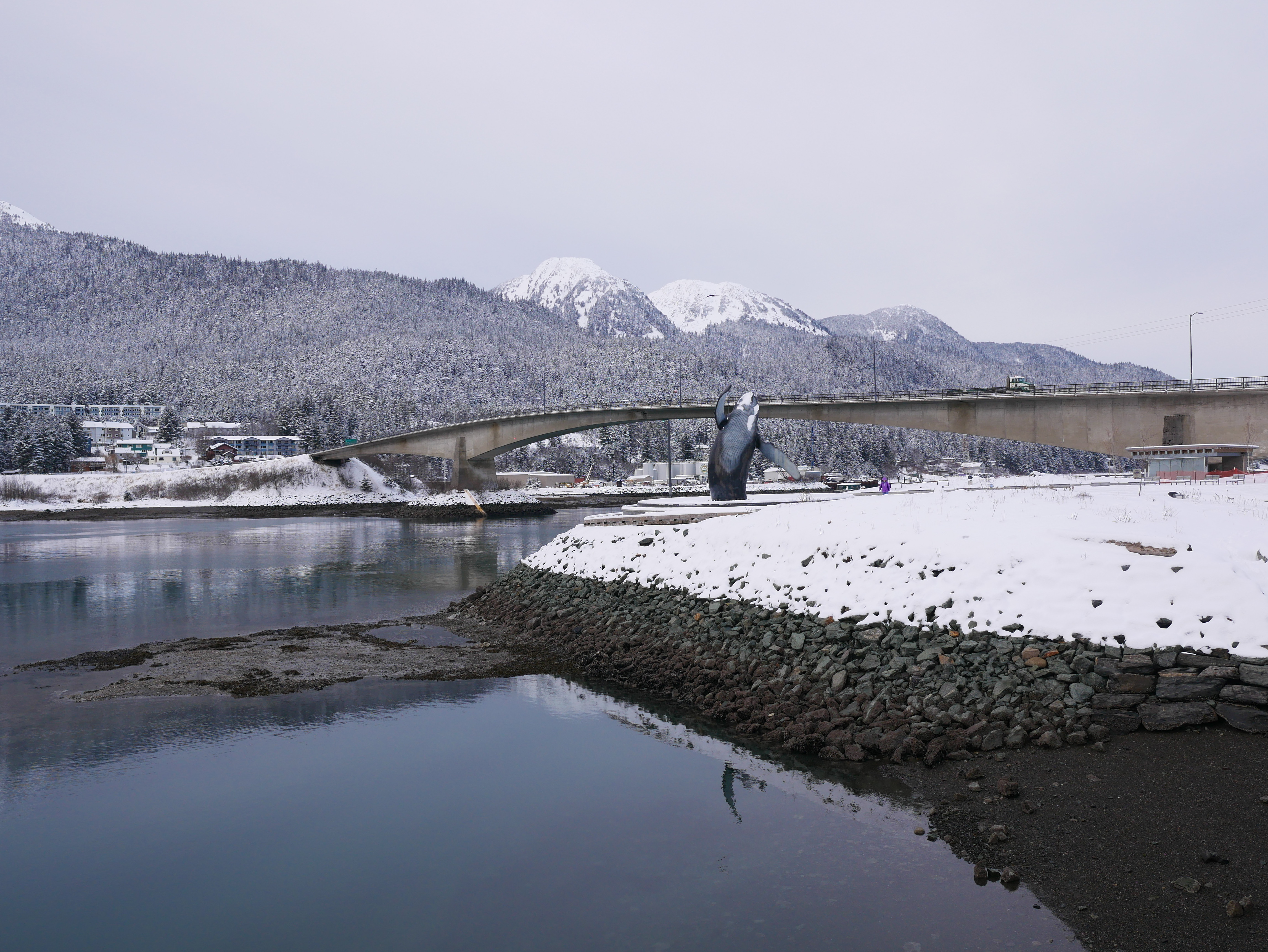 Aki and I have been cross country skiing all week. It’s time for a break. So, we suit up at the front door and walk down the hill to the Douglas Island Bridge. I am glad that I attached some cleats onto my boots. No one has been able to clear the streets and sidewalks of this week’s snowfall.