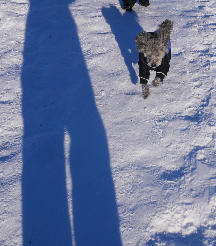 On cold winter days, when ice covered lakes allow us a chance to explore new territory, I usually lead Aki off the usual trails. She starts after me when I walk onto Crystal Lake. Then she stops, bogged down in snow. The old puppy starts shivering. It’s like she will freeze if she can’t keep moving.
