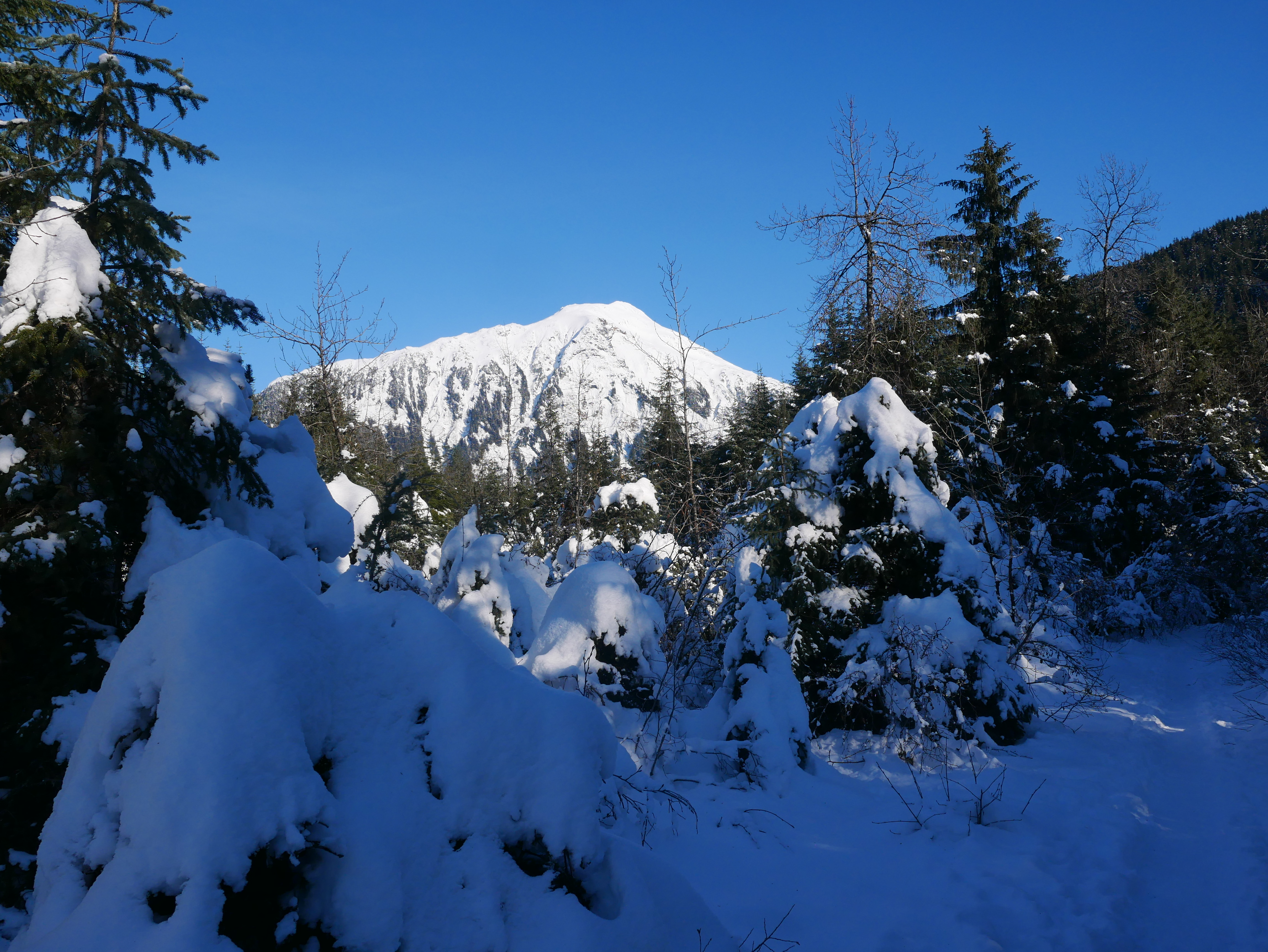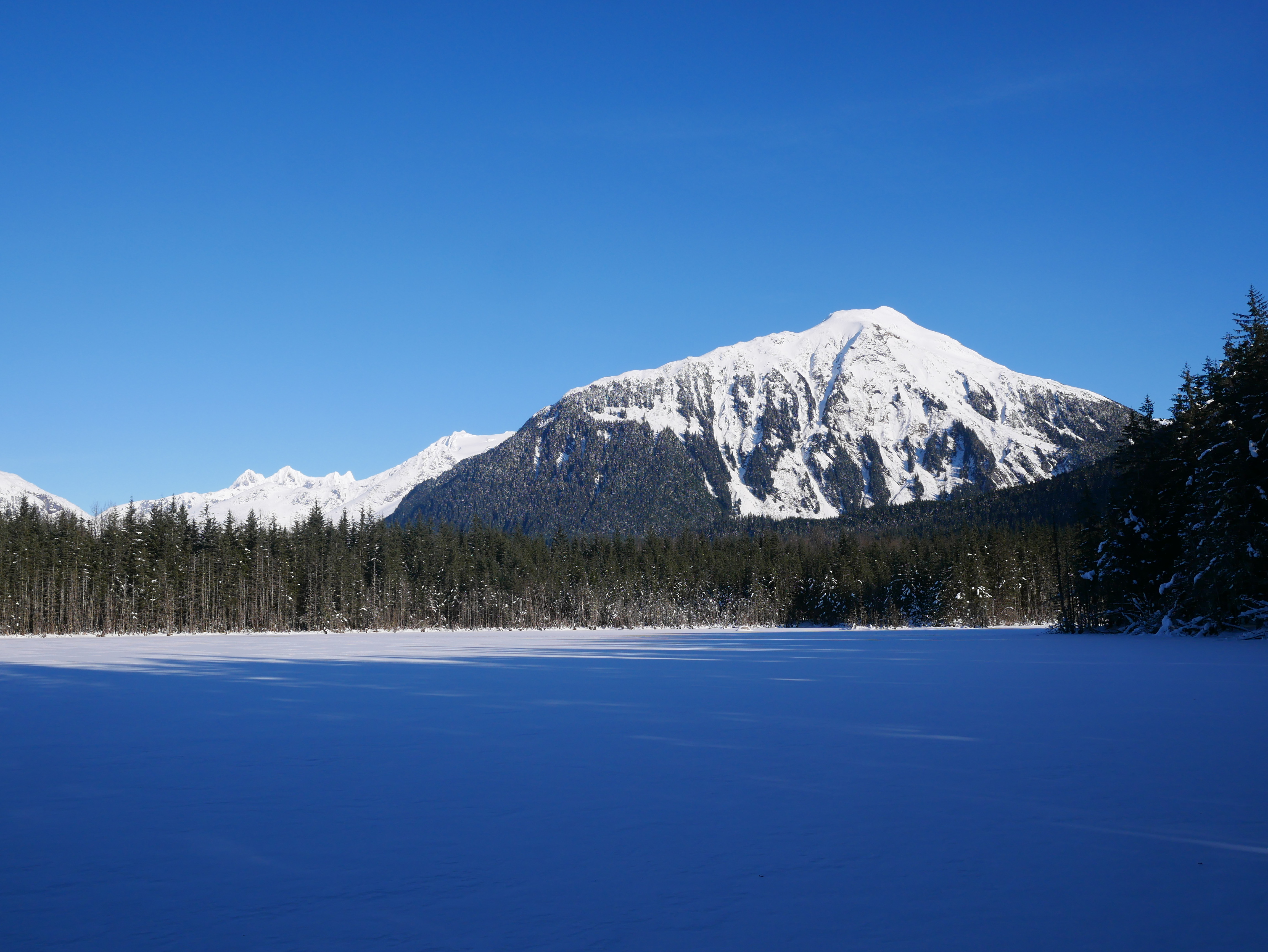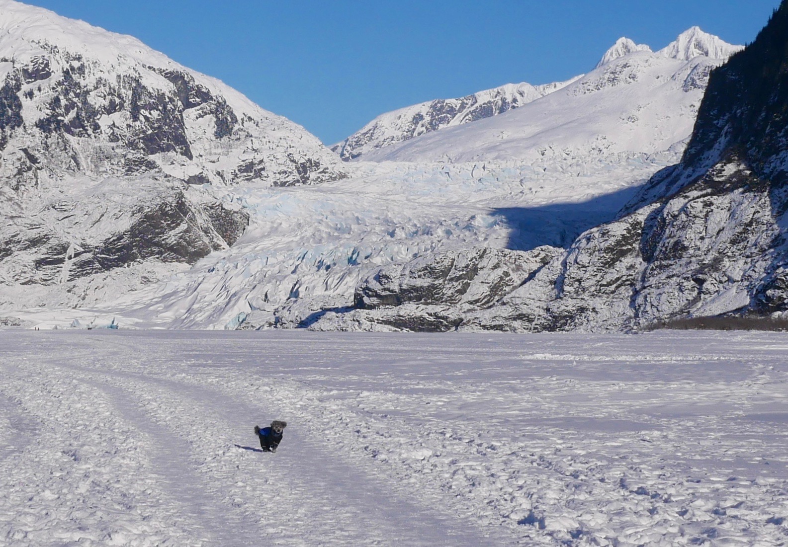 We hadn’t intended to do a sub-zero walk this morning. But no wind discouraged us by stirring the country near the glacier. The minus 3 degree temperature (minus 19 C) seemed quite comfortable. Aki dashed onto the Mendenhall Lake and started on the trail to the glacier. We had heard others had posted pictures of a new hollow in the glacier formed from clear, blue ice. I guess the little poodle mix wanted to go check it out.