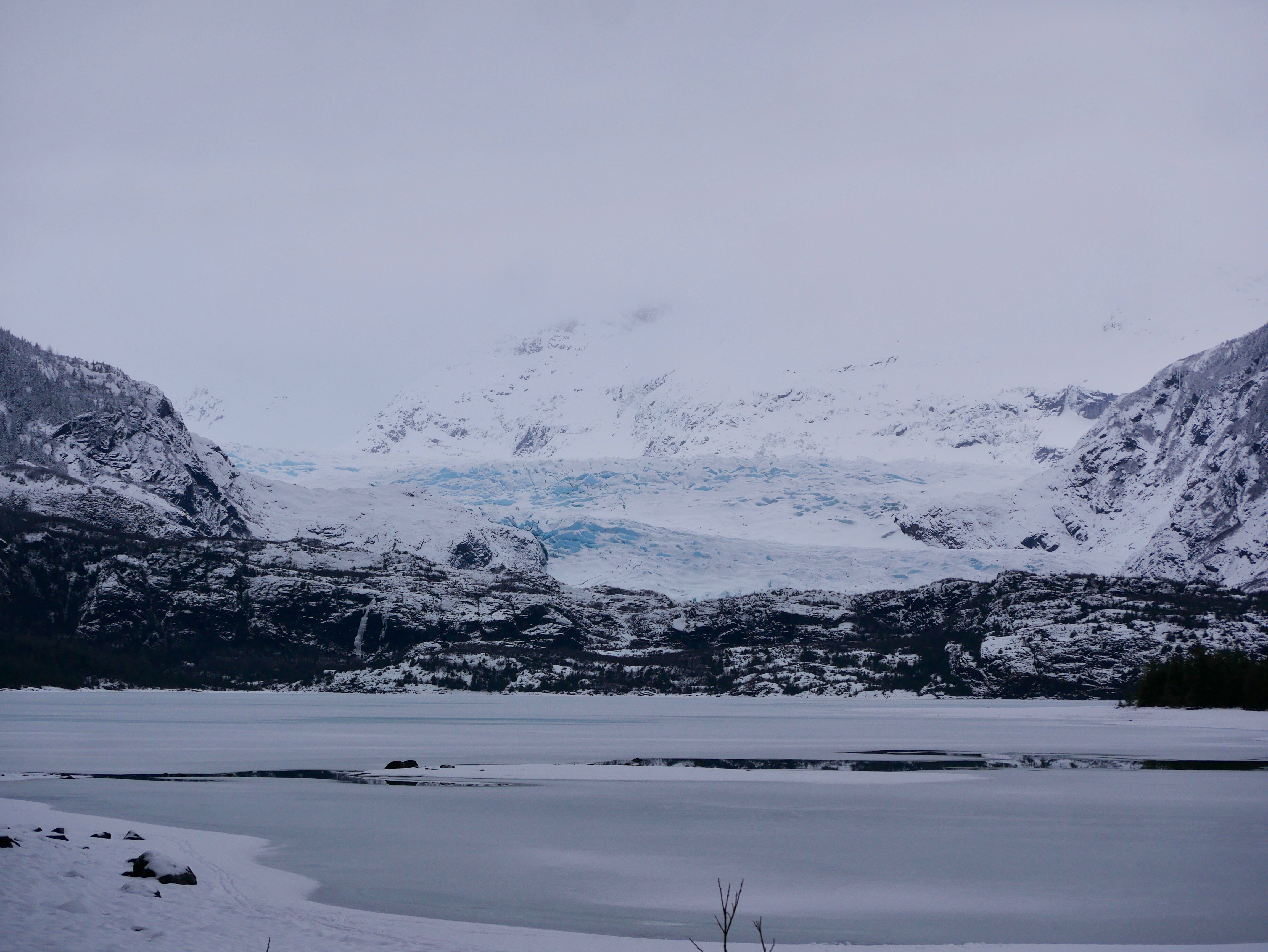 When we get close to the river that drains Mendenhall Lake, Aki and I leave the ski trail and walk over to the water. We do this on every Mendenhall ski on the chance that we will see a family of swans. It doesn’t happen on this visit. I think back to the story in the Juneau Empire describing the capture last month of an injured swan. It happened on this little river stretch. Maybe things will change next month. The injured swan might be reunited here with her family, or the little river will fill up with other transit swans.