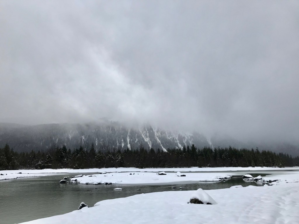 Waking this morning, and hoping to find confirmation of the weather app prediction, I looked out the window at the top of Mt. Juneau, and found it lit by early sun under a blue, cloudless sky. Even though she was sleeping on the family bed, I grabbed Aki’s warm wrap and slid it around her neck and shoulders. She was immediately awake and reading for a hike.