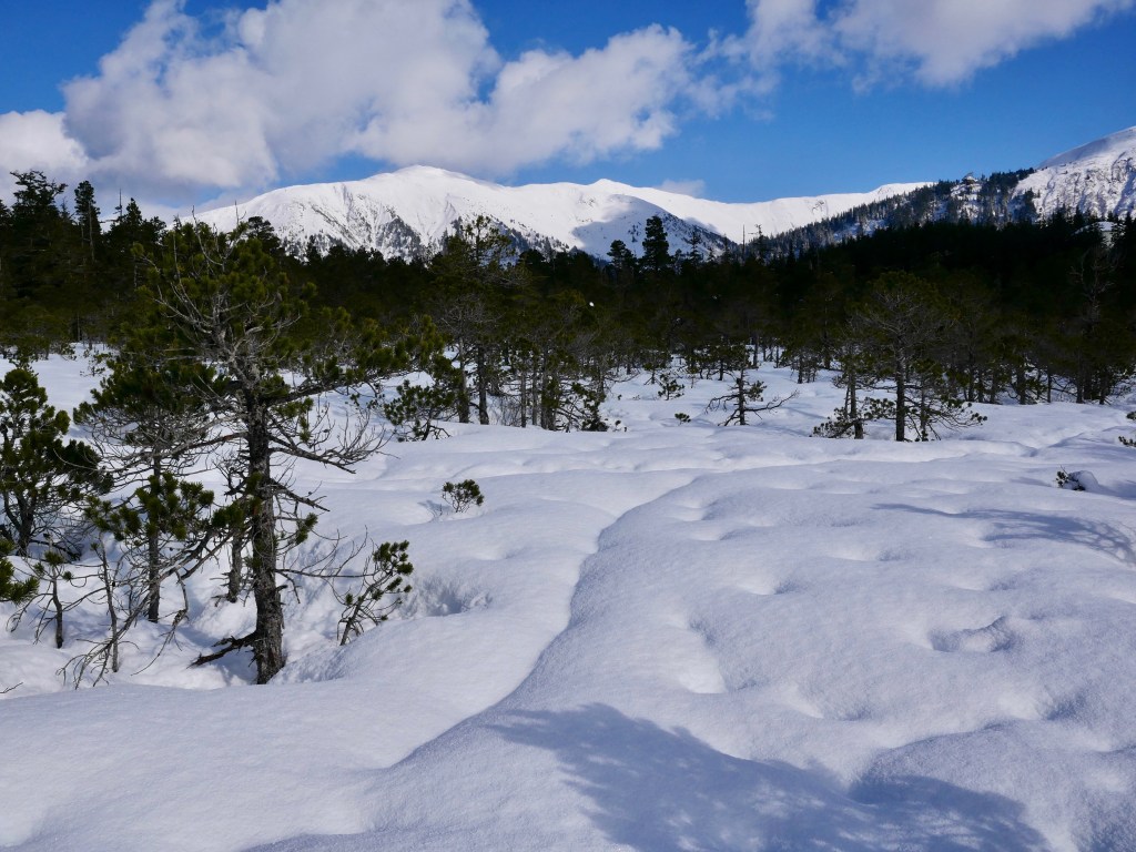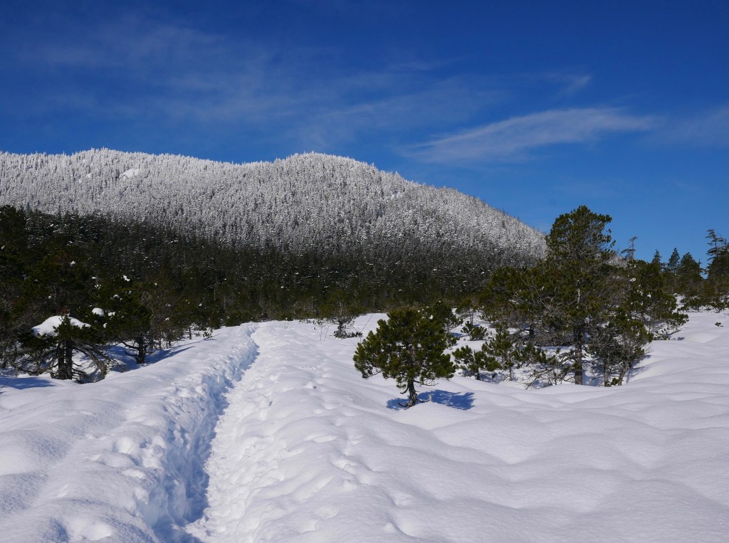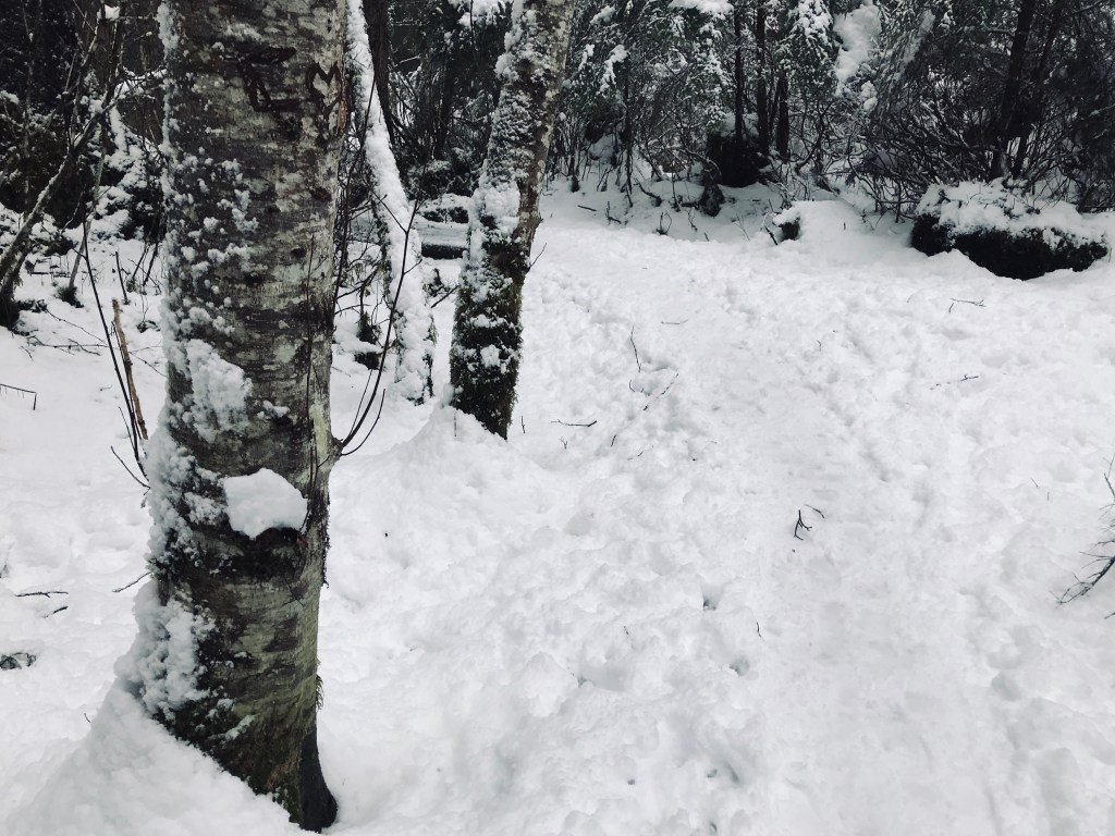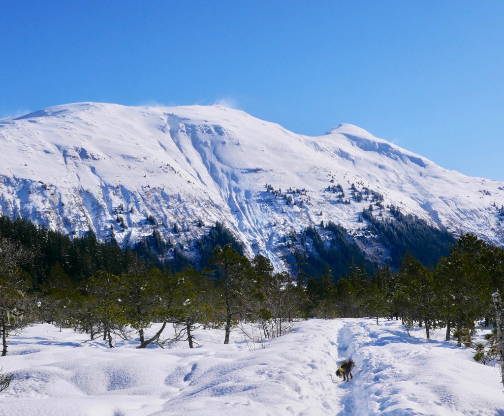 We drove through the empty streets of Downtown Juneau and across the Douglas Island Bridge to the Gastineau Meadows trail head. The tiny parking lot was empty. Aki followed me up the steep approach path and on to the main trail. We saw no one, animal or human, during the hike. I could hear blue jays complaints and complicated speeches of ravens. I sought and then spotted a wood pecker wounding the side of a giant alder tree. As always happened after we reach the open meadow, I was almost overwhelmed by the sight of sunshine on the snow covering the meadows and mountains that surrounded the little dog and I.