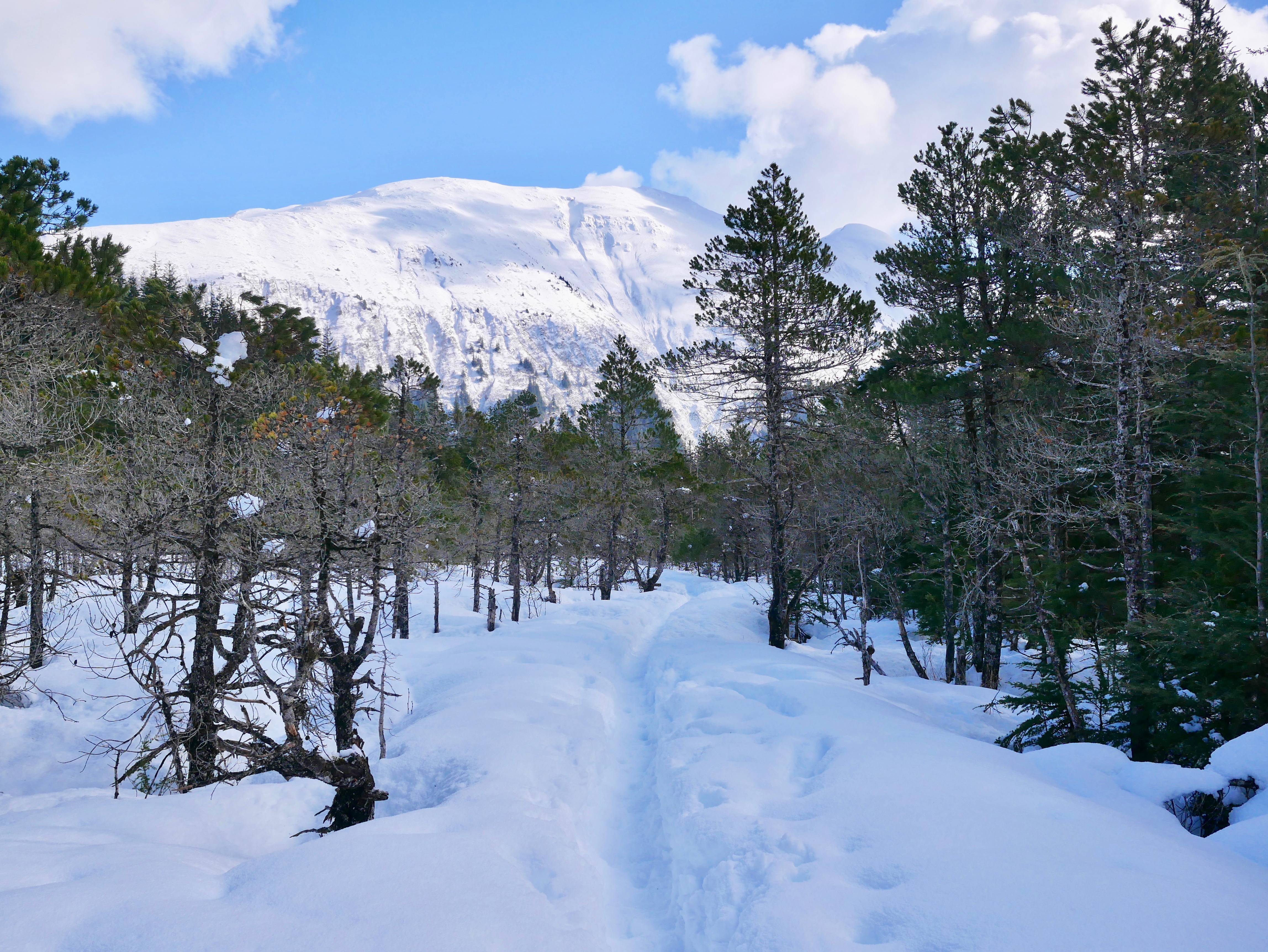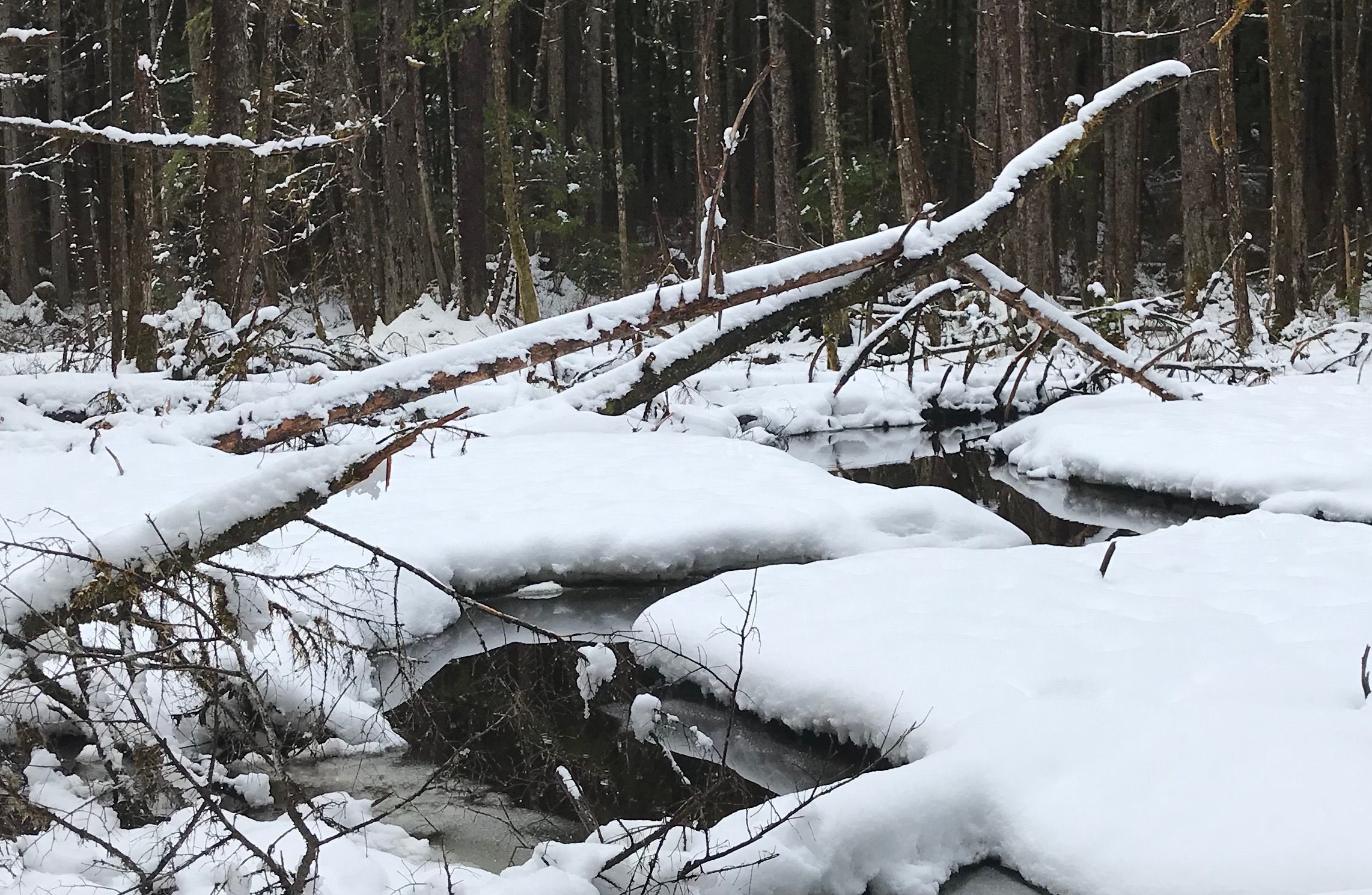 We drove through the empty streets of Downtown Juneau and across the Douglas Island Bridge to the Gastineau Meadows trail head. The tiny parking lot was empty. Aki followed me up the steep approach path and on to the main trail. We saw no one, animal or human, during the hike. I could hear blue jays complaints and complicated speeches of ravens. I sought and then spotted a wood pecker wounding the side of a giant alder tree. As always happened after we reach the open meadow, I was almost overwhelmed by the sight of sunshine on the snow covering the meadows and mountains that surrounded the little dog and I.