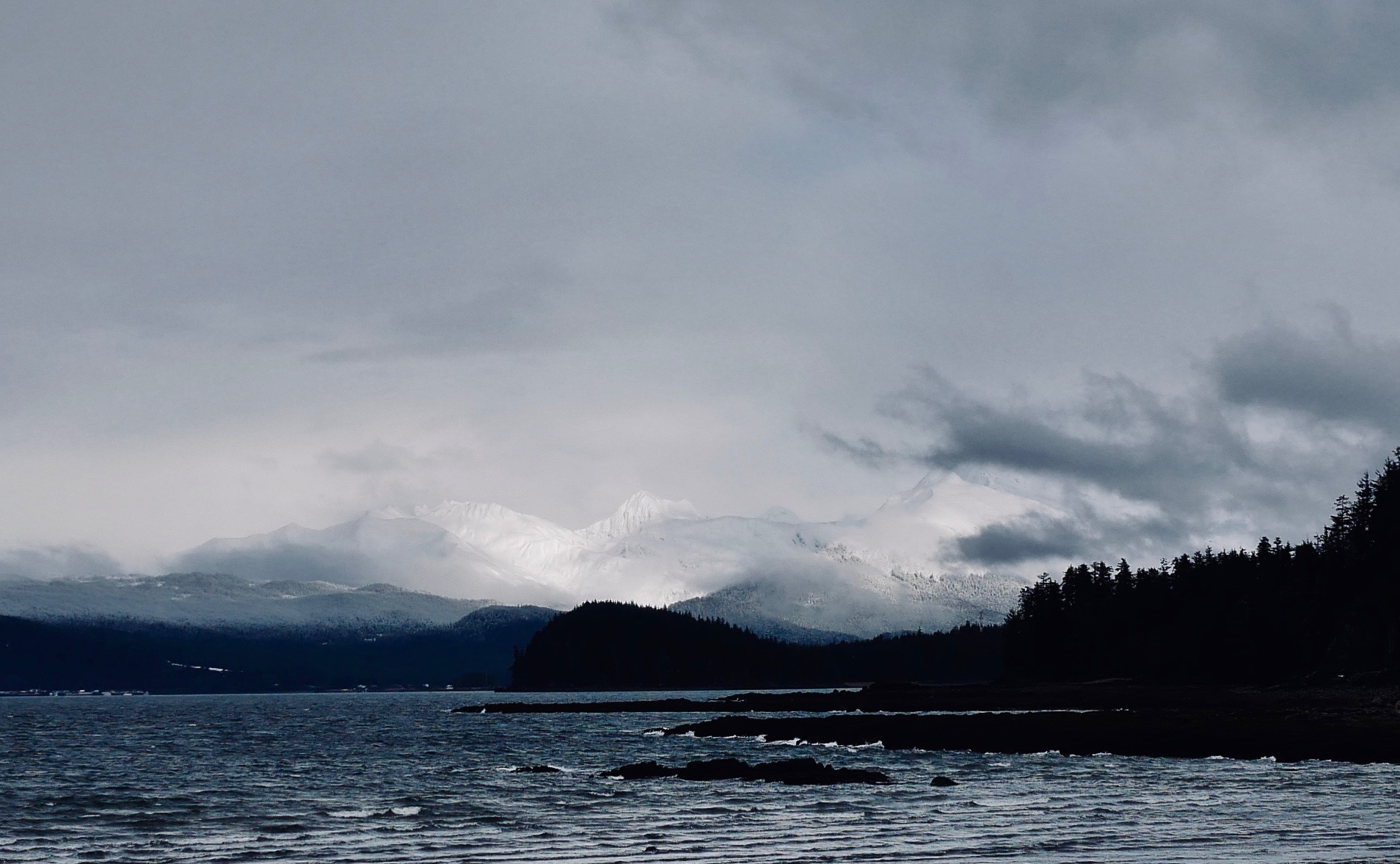 We head out to North Douglas Island to use a very icy trail that leads through an old growth spruce forest to a crisp beach. Aki would love to fly down the trail but decides, instead, to wait for me to as I take photos or search for noisy birds. She wants to set a quick trot down the beach but stops to let me appreciate the sudden appearance of our nearby glacial mountains. Yesterday she refused to go on a proper walk. Maybe, today, she is trying to make amends.