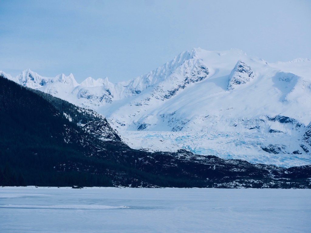 Aki is taking this cross country ski trip seriously. That’s probably because was are being joined by her other human. The little dog watches the road carefully as we drive out to Skater’s Cabin. That’s where we will start skiing around the shore of Mendenhall Lake. It’s suppose to be snowing but none falls on us as we walk to the lake shore. Instead we have to squint because no clouds block the sun.