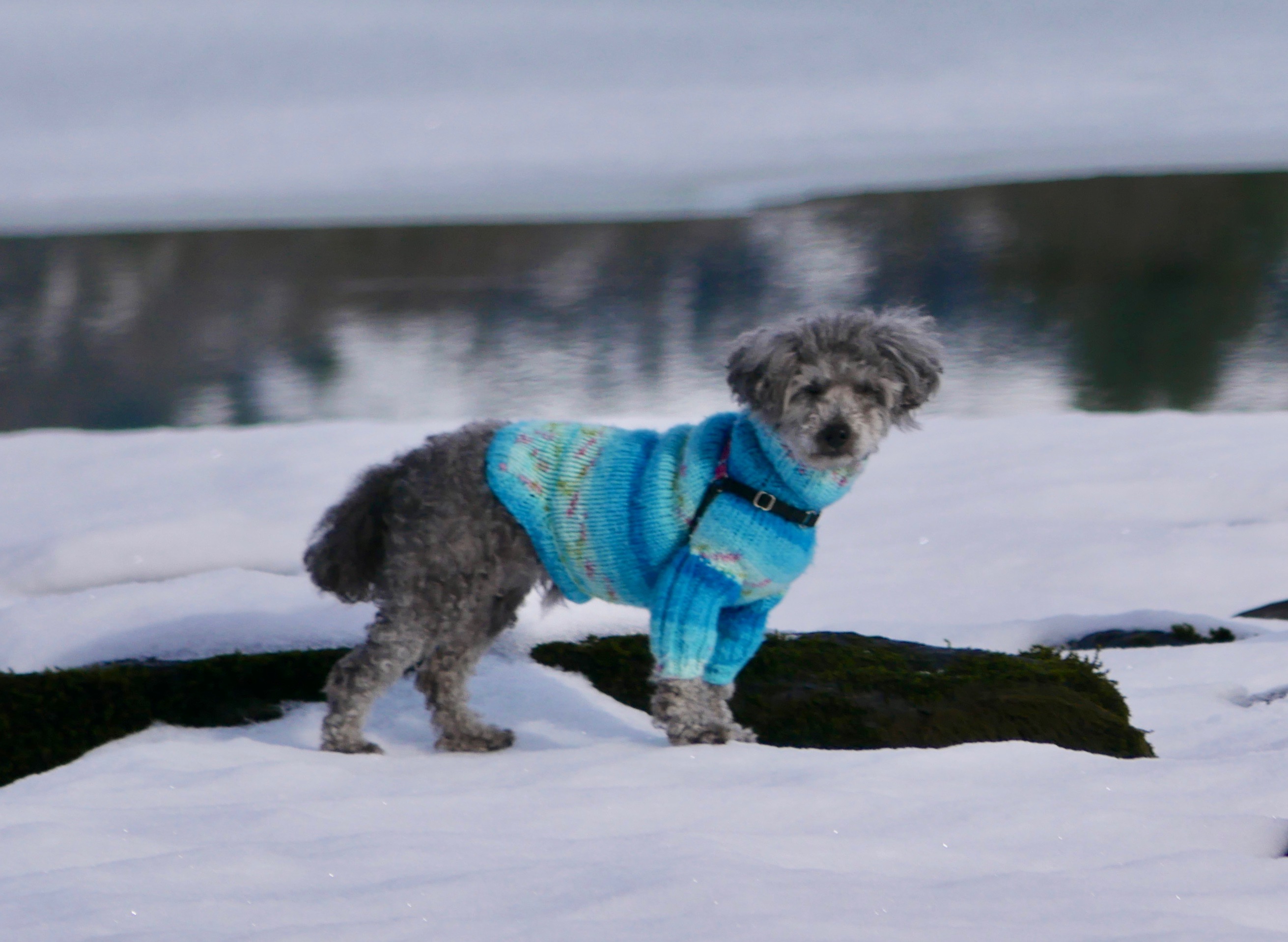 Aki is taking this cross country ski trip seriously. That’s probably because was are being joined by her other human. The little dog watches the road carefully as we drive out to Skater’s Cabin. That’s where we will start skiing around the shore of Mendenhall Lake. It’s suppose to be snowing but none falls on us as we walk to the lake shore. Instead we have to squint because no clouds block the sun.