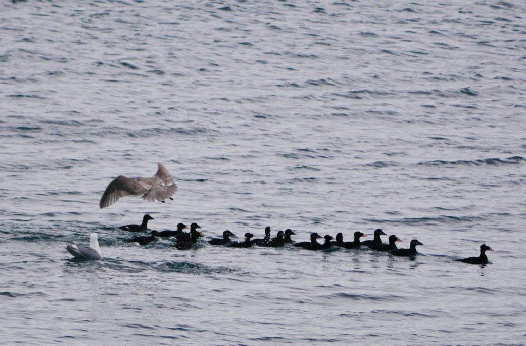 Even though the temperature is well above freezing, We feel a bone-chilling blast of air when we walk on to the bare section of Louisa Peninsula. The base seems empty of birds and the sea lions we often see feeding on the protected side of the peninsula. There are scoters feeding on the protected side of the land, accompanied by two gulls trying for the goodies not captured by the hard-working scoters.