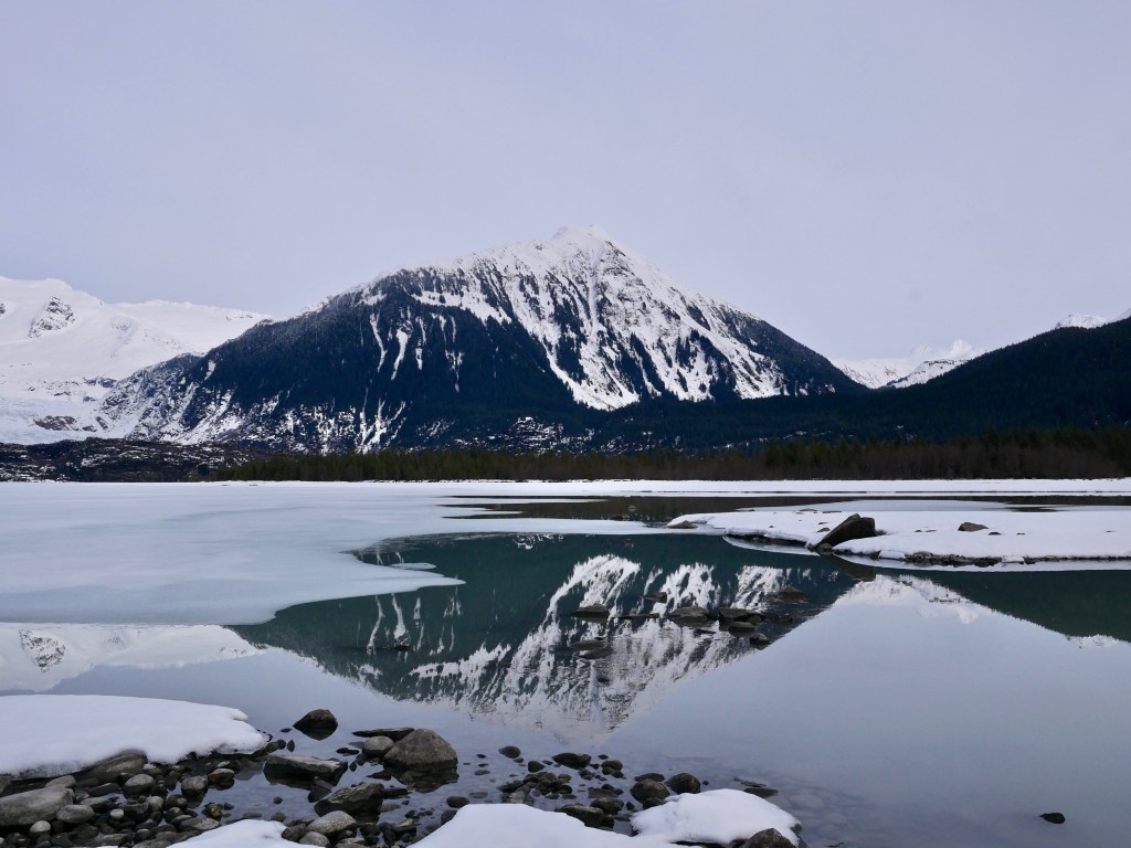Last night well, well-below freezing weather hardened the border ice around the lake. In an hour or so, it will soften in the sun, making it difficult to travel on using the light weight skate skies. But now, the snow still supports us and offers the perfect surface for slashing with skate skis. We make it to the mouth of Mendenhall River in record time.