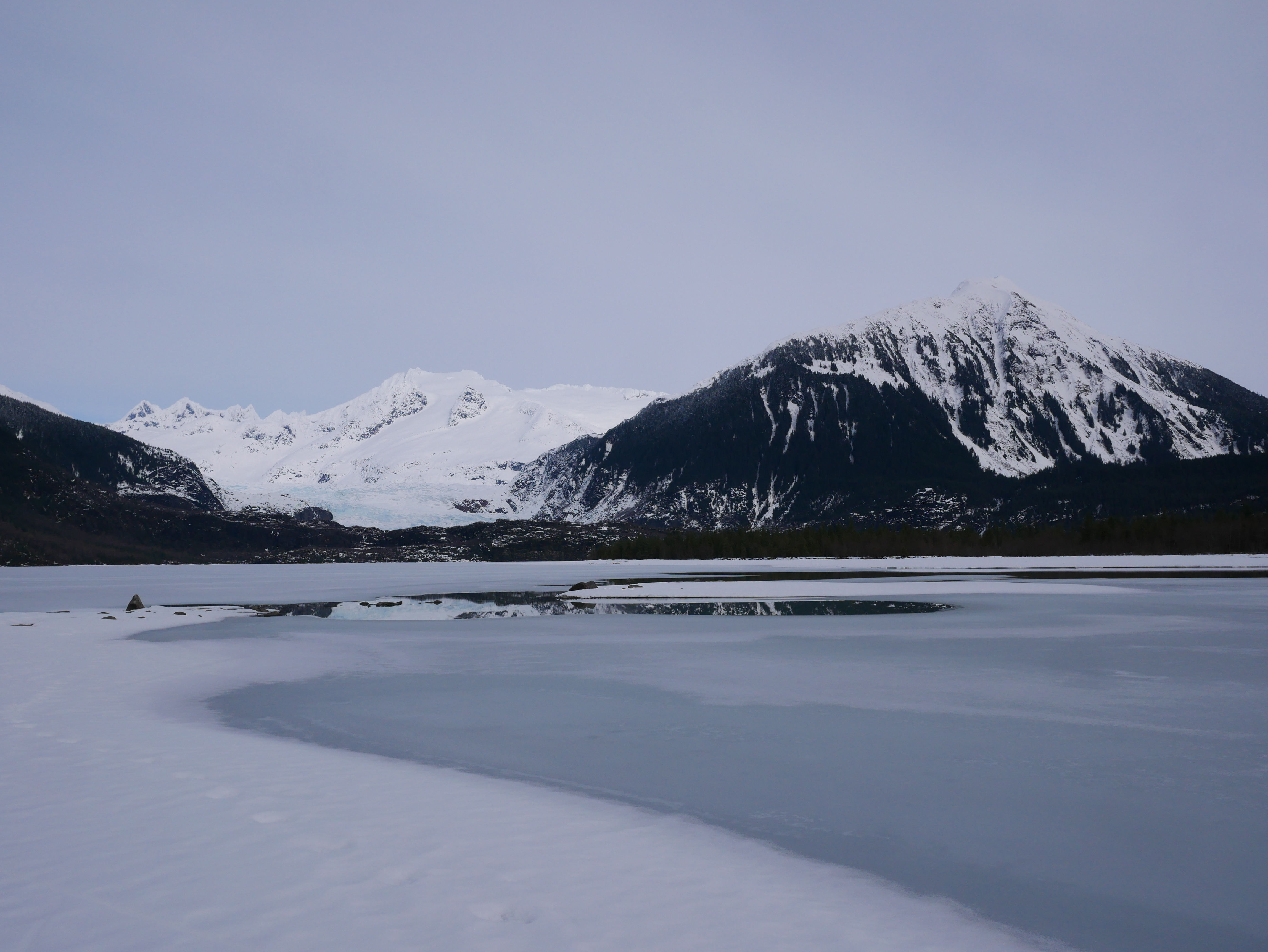 Last night well, well-below freezing weather hardened the border ice around the lake. In an hour or so, it will soften in the sun, making it difficult to travel on using the light weight skate skies. But now, the snow still supports us and offers the perfect surface for slashing with skate skis. We make it to the mouth of Mendenhall River in record time.