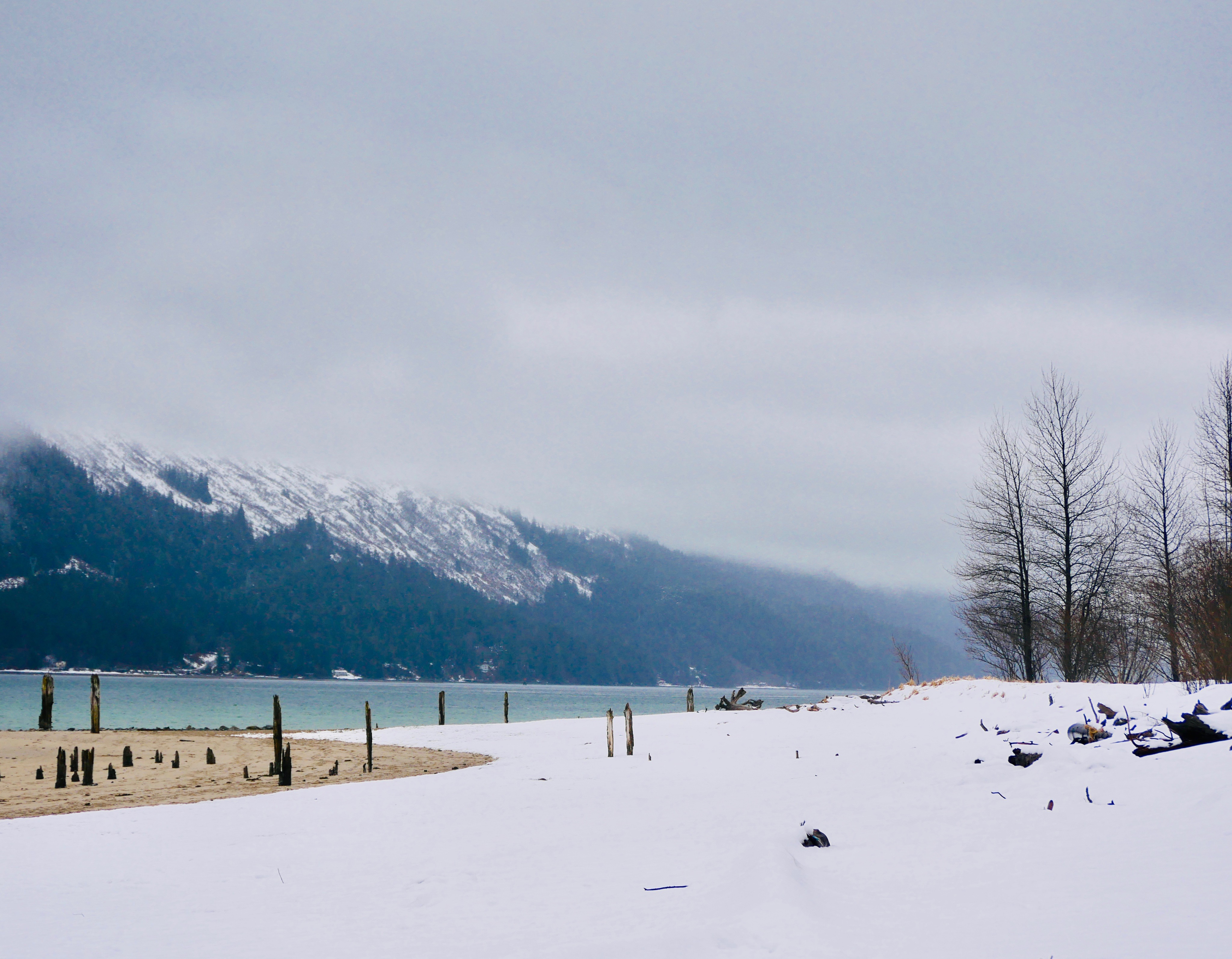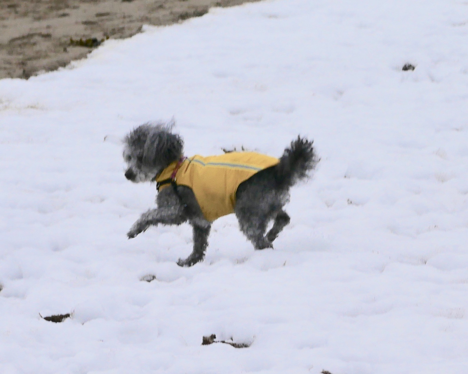 Deep snow covers the trail to Sandy Beach. It’s dense enough to has enough to support Aki’s weigh. But, I have to keep on the narrow trail to avoid wearing myself out on the soft, deep snow that borders it.