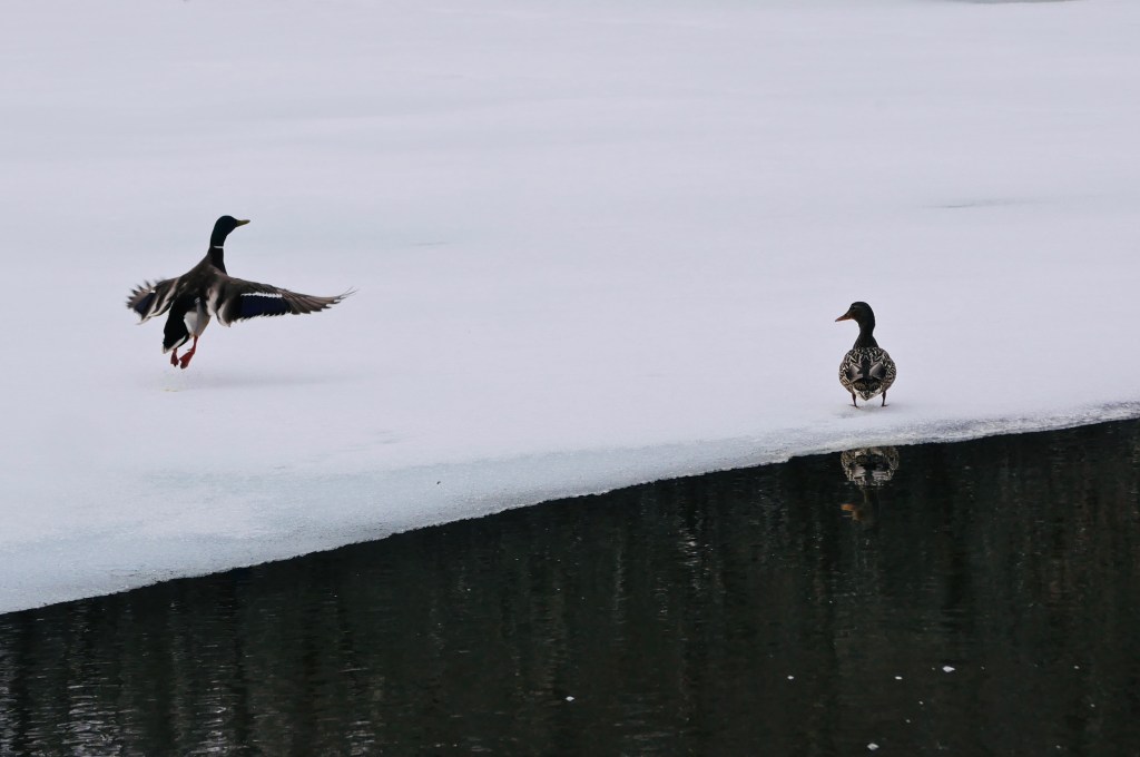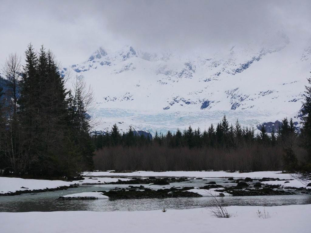After parking near the trail head, we slipped and slid our way along Mendenhall River, happy not to find clouds covering the glacier and surrounding mountains. But a grey mist covered most of the other mountains. We could hear geese and noisy gulls flying overhead, out of sight. We passed areas containing robins and what sounded like swans. But they never broke out of the grey.