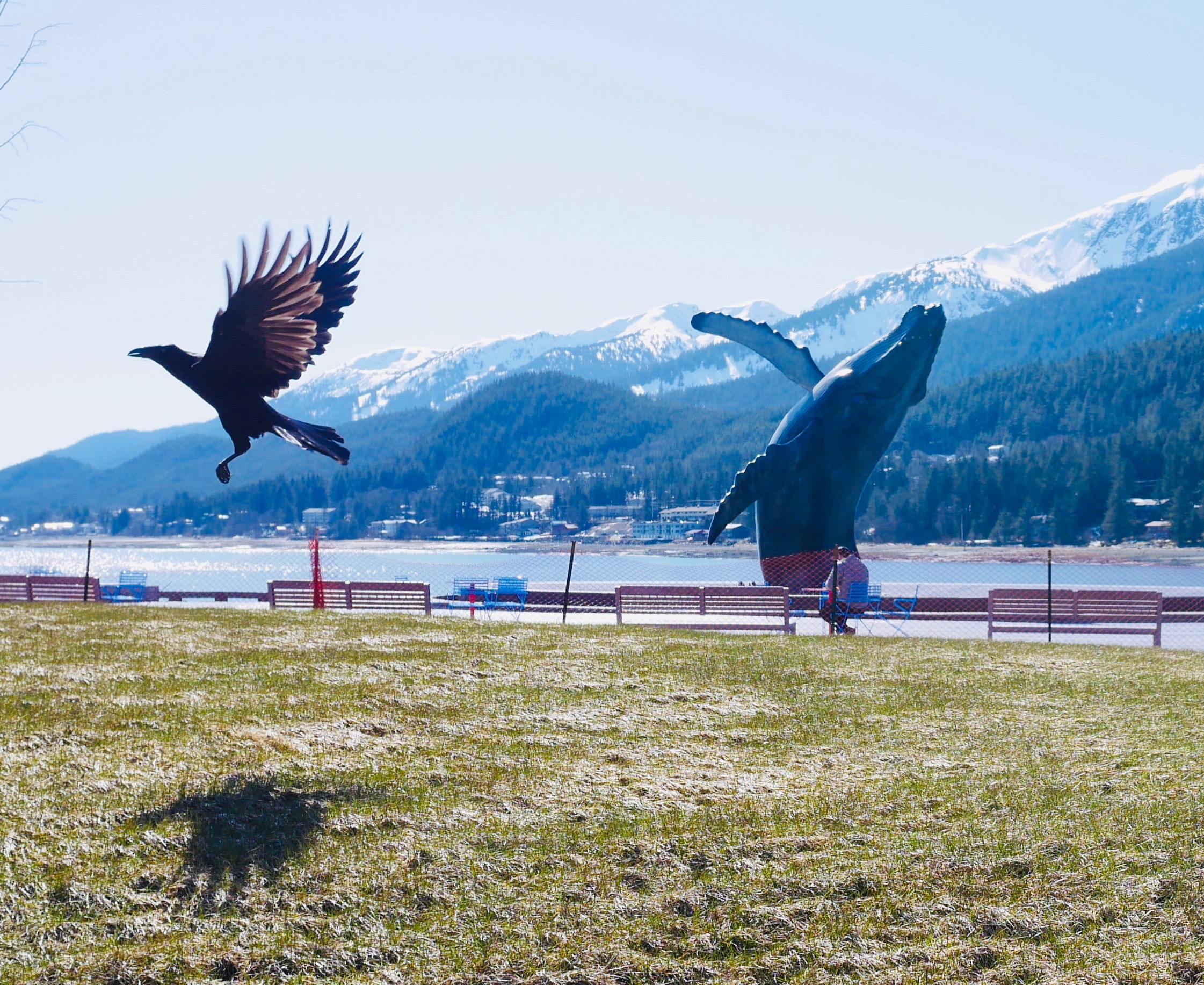 The sun is back and it brought warm skies. Juneauites are walking around with happy faces, like children entering Disneyland. Aki and I drop off of Chicken Ridge and head toward the humpback whale statute. One raven watches us approach, jerking his body side to side as if tossing out a threat. When I come nearer it flies in front of the dog and I, makes a snap turn, and passes behind our backs. After we walk twenty feet away, the raven returns to where we first saw it.