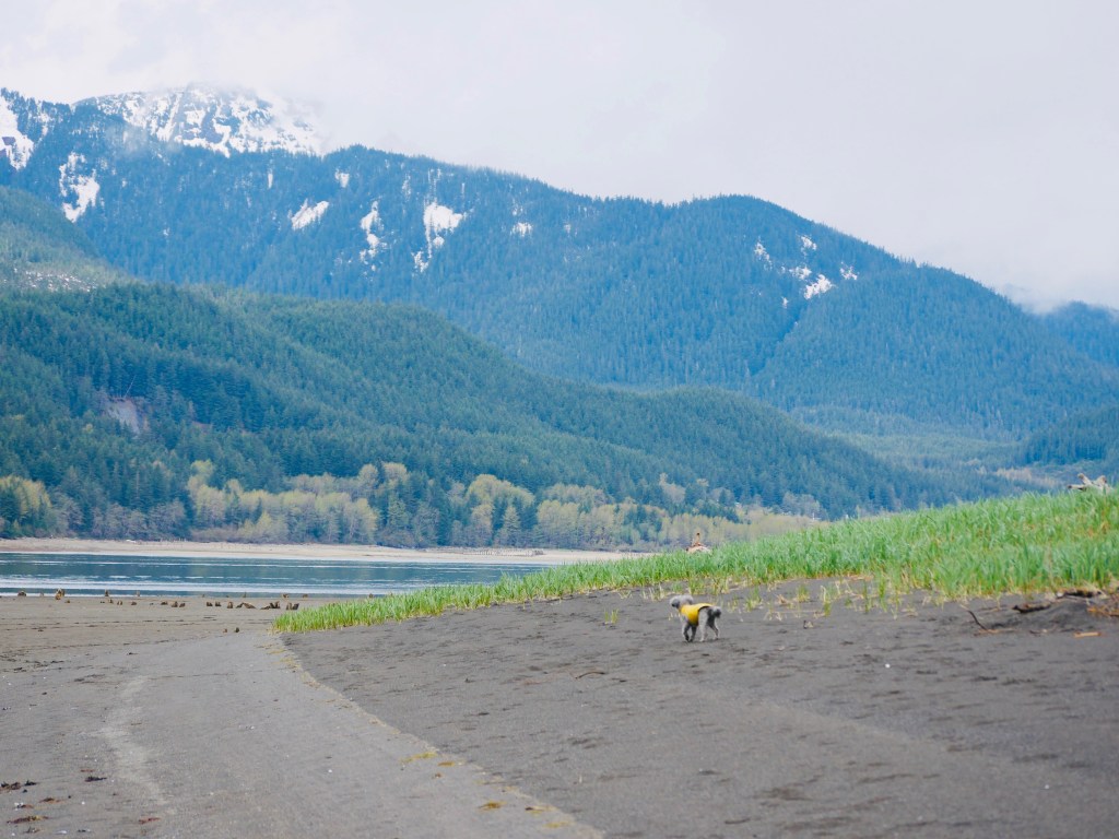 Two bald eagles were occupying a cottonwood tree when Aki and I reached the end of Sheep Creek Beach. I was surprised to see the pair. Breeding pairs are now taking turns protecting their nest. A week or two ago, I watched an eagle dive bomb a raven trying to snatch an egg from the eagle’s nest. Raven must have left at least one egg there when it flew off. One of the eagle parents was tucked in the nest, over its eggs a week later when I passed by again.