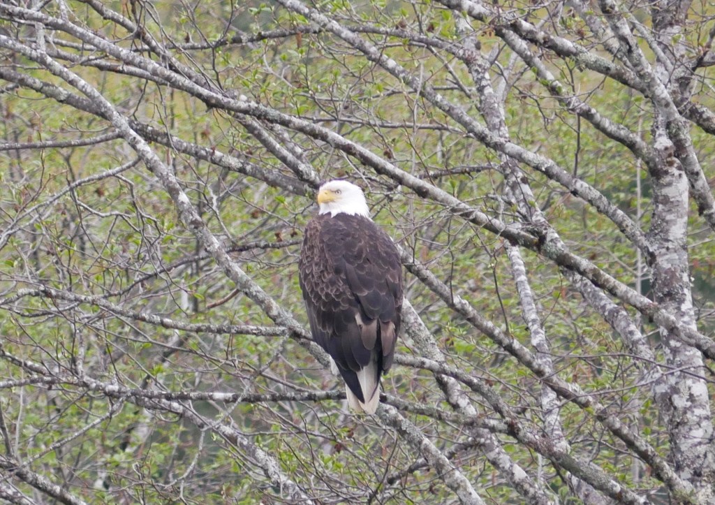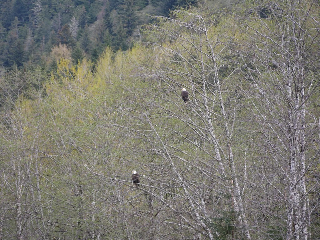 The nesting eagle flashed me a fierce sign. Was it warning that she would rip out my eyes if I tried to climb up her nest tree? The pair of eagles that Aki and I watched this morning were sending out their bored “you don’t deserve our attention” look. Maybe that’s why they let me walk within a few hundred feet before returning their attention to a nearby pen of young salmon that will soon be released into the sea.