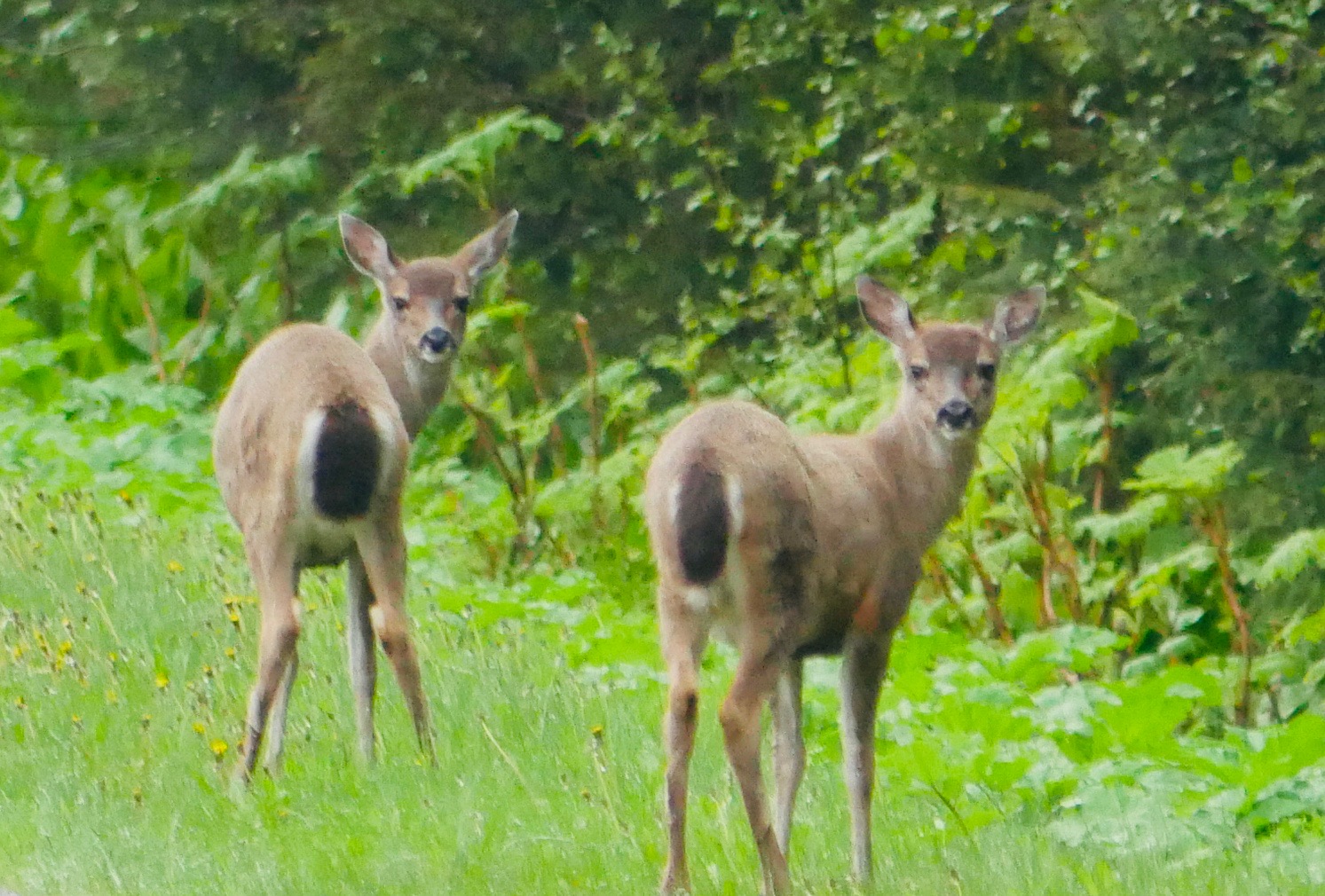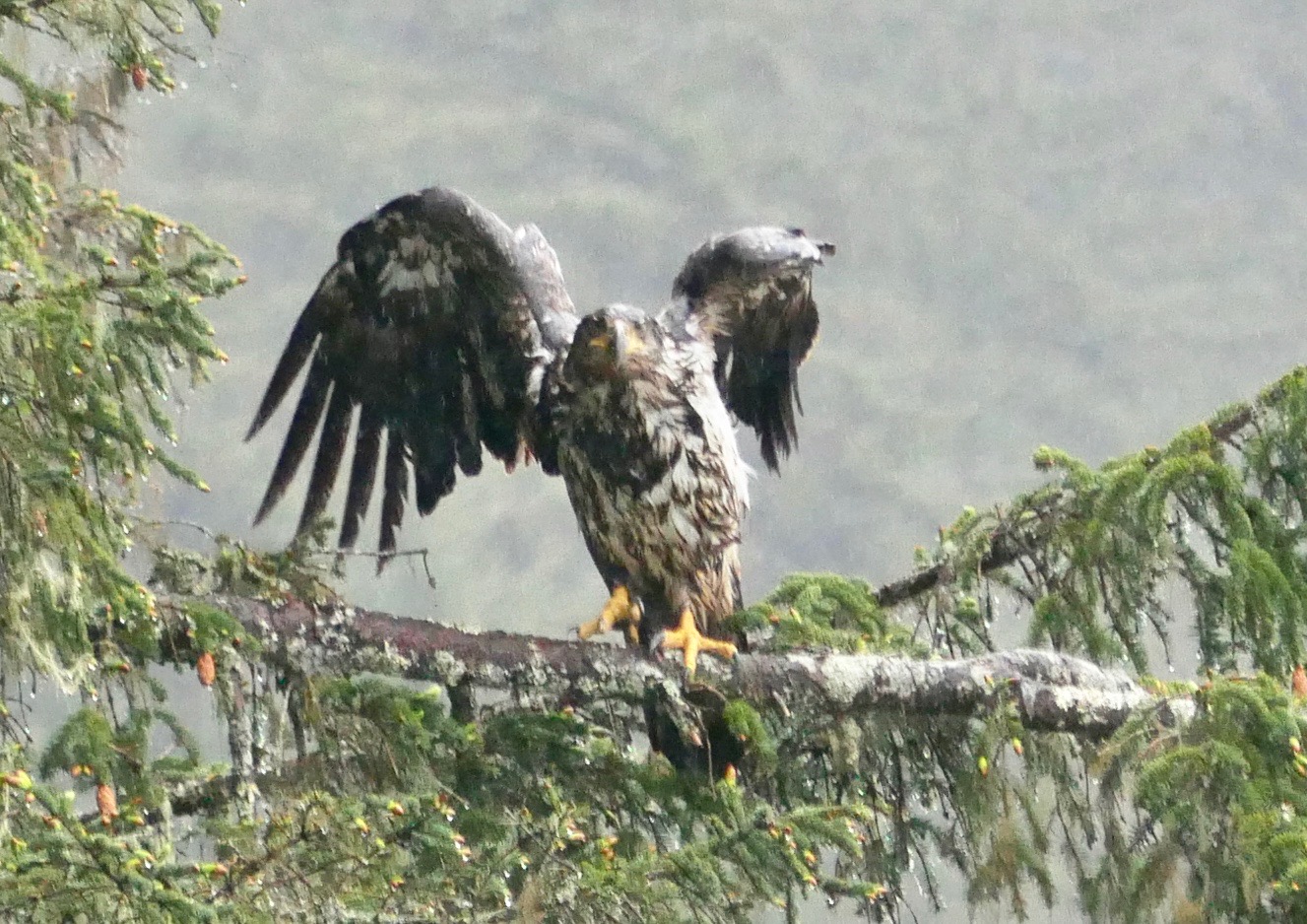 Low clouds and rain softened the view of Admiralty Island and the channel between us and it. But I could still see an immature bald eagle standing unprotected from the storm. Later, we saw three female deer hammering tall grass at the edge of a different meadow. Like the eagle, they ignored me, like they tried to ignore the rain.