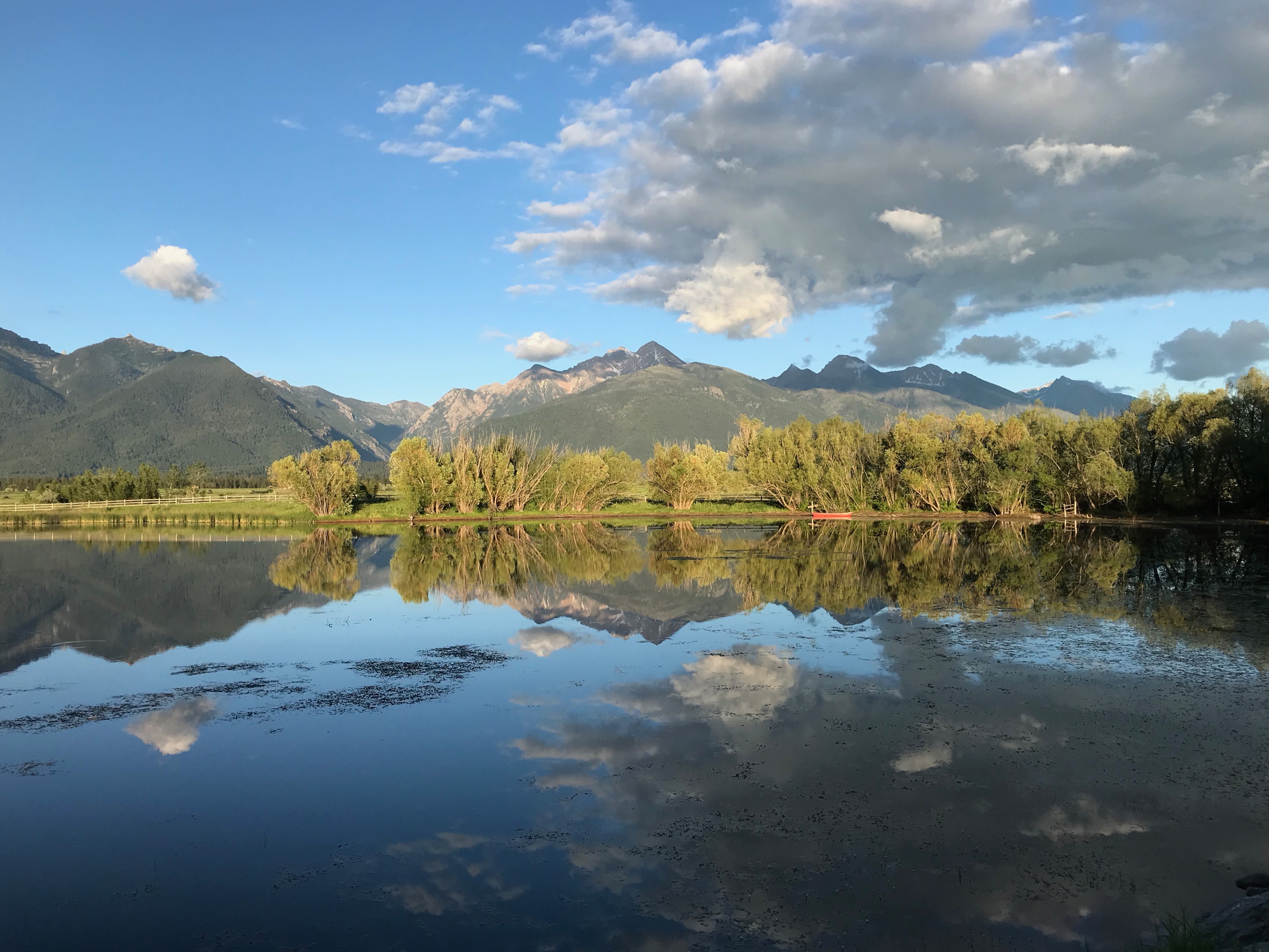 Aki and I have split up, at least for a week. She is home in Alaska, enjoying a small stretch of sunny weather. Every morning she is probably curls up on a bright section of front room carpet, feasting on invading sunshine. I’m in Montana, spending time with the relatives. It rained harm this morning, but stopped before dinner time. Now, when we are close to sunset on a spot near the Flathead Indian Reservation, the sun is producing powerful reflections of the surrounding mountains on a small lake. Two swans feasted on the lake waters then took off to look for a quiet place to spend the night.