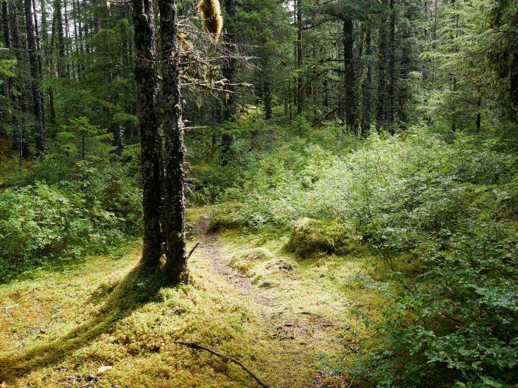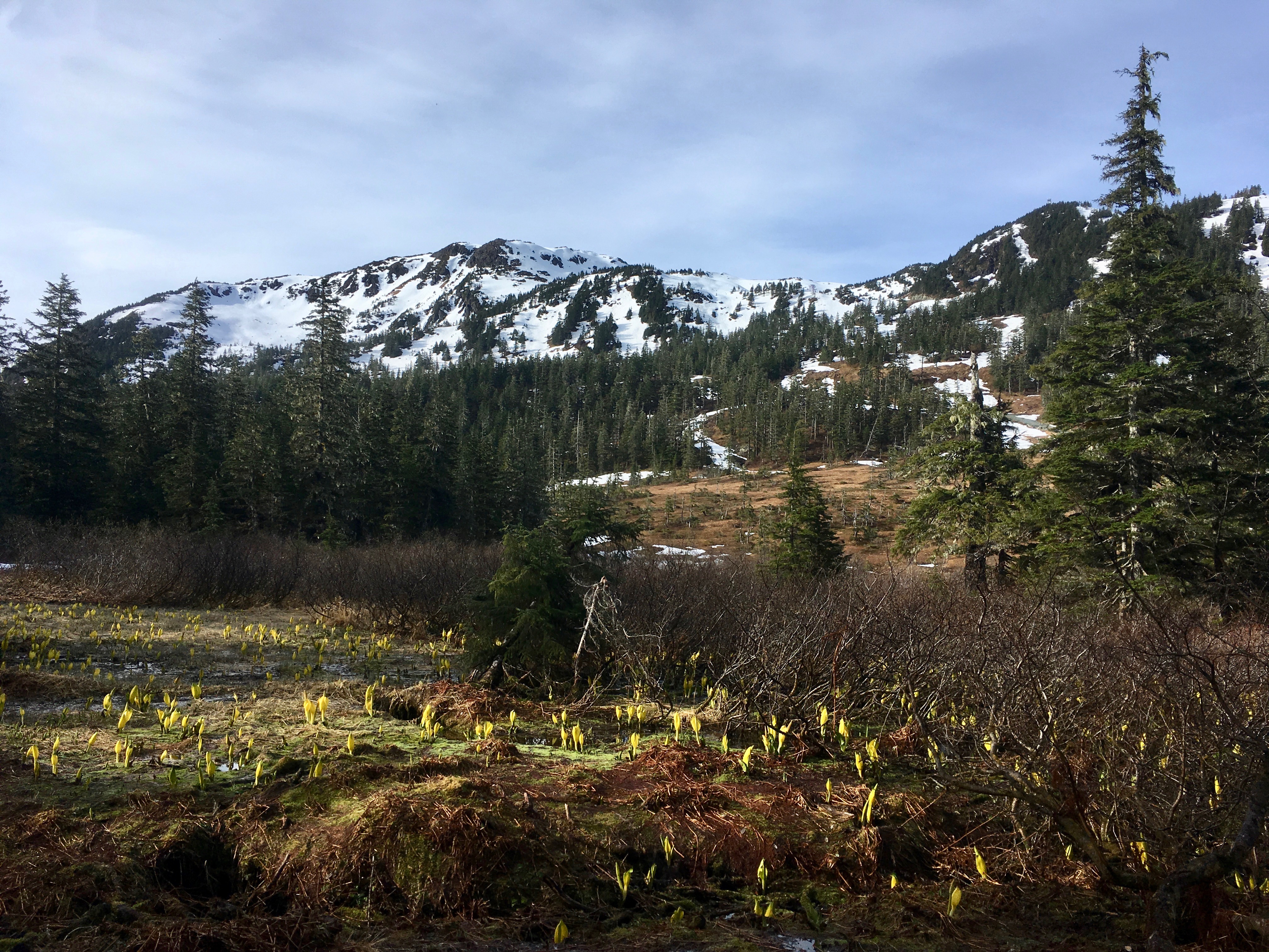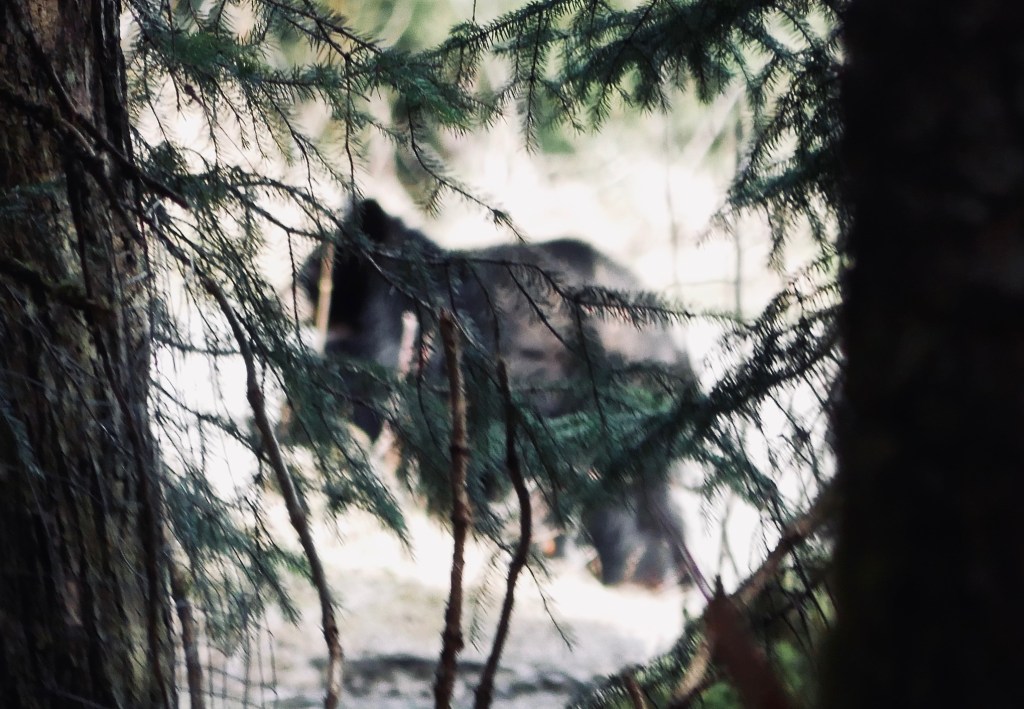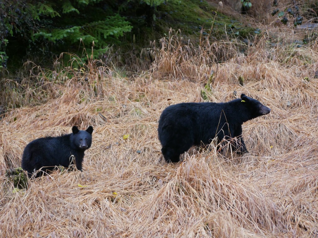 This morning, we won’t see a bear trundling down the trail. We will have to step around half-eaten dog salmon carcasses on a gravel bar but no bear will show itself near the salmon stream. Later we will watch a single black bear digging up chocolate lily roots in a meadow. One time, the bear will lift is head to look at me as it munches on a root. Then, it will turn its back and attack another root.