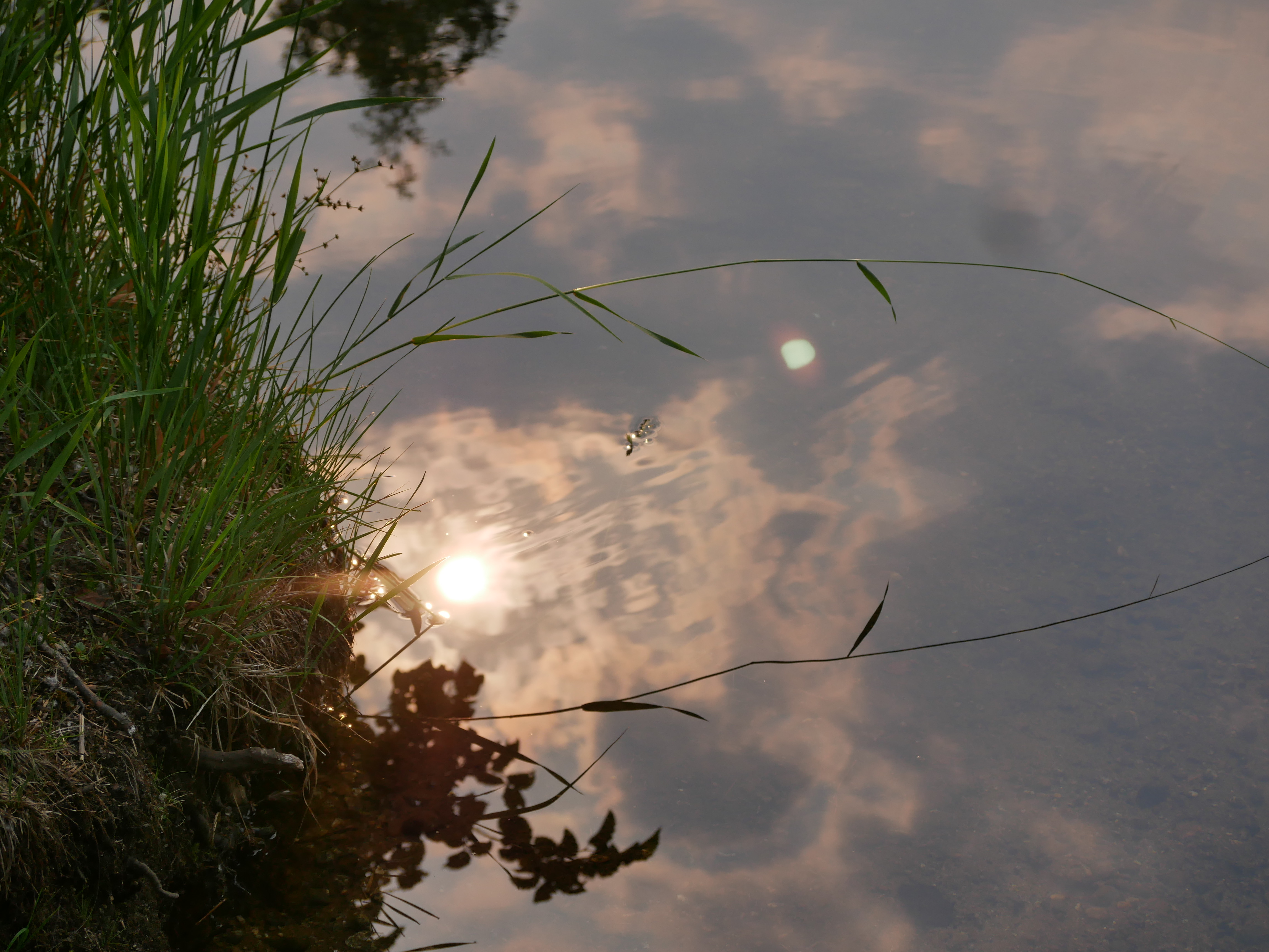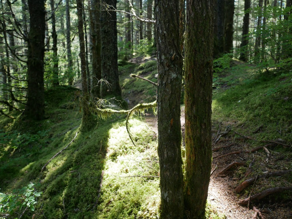 The sun shines on this damp forest as Aki muddies her paws on the rain soaked trail. Streaks of light turn fall-yellow leaves almost transparent. We can hear the Eagle River moving at near flood stage after a long stretch of heavy rain. We can feel a light wind that sends fragile leaves twirling. After our summer of storms, there is no place I’d rather be than in this riverine forest.