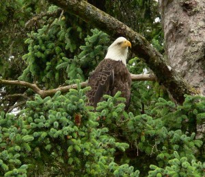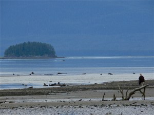 Aki’s nails beat a faint tattoo on the trail boards. When we pass a little cataract of moving water, the sound seems deafening. We return to quiet when we leave the boardwalk to walk on the soft forest floor. That’s why the sudden burst of eagle bickering is so jarring. While we approach the beach, one bald eagle chases another, driving its victim into a spruce tree. I can’t find either eagle after we emerge from the woods.
