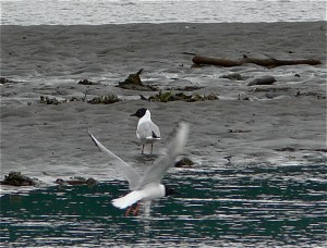 A single parent merganser family cruises off shore, making no noise. The resident crows and a flock of Bonaparte gulls remain silent until I walk in their direction. They take to the air, moan a bit, then fly noiselessly away. Later we see eagles sulking quietly on the beach.