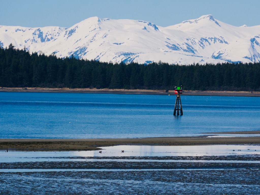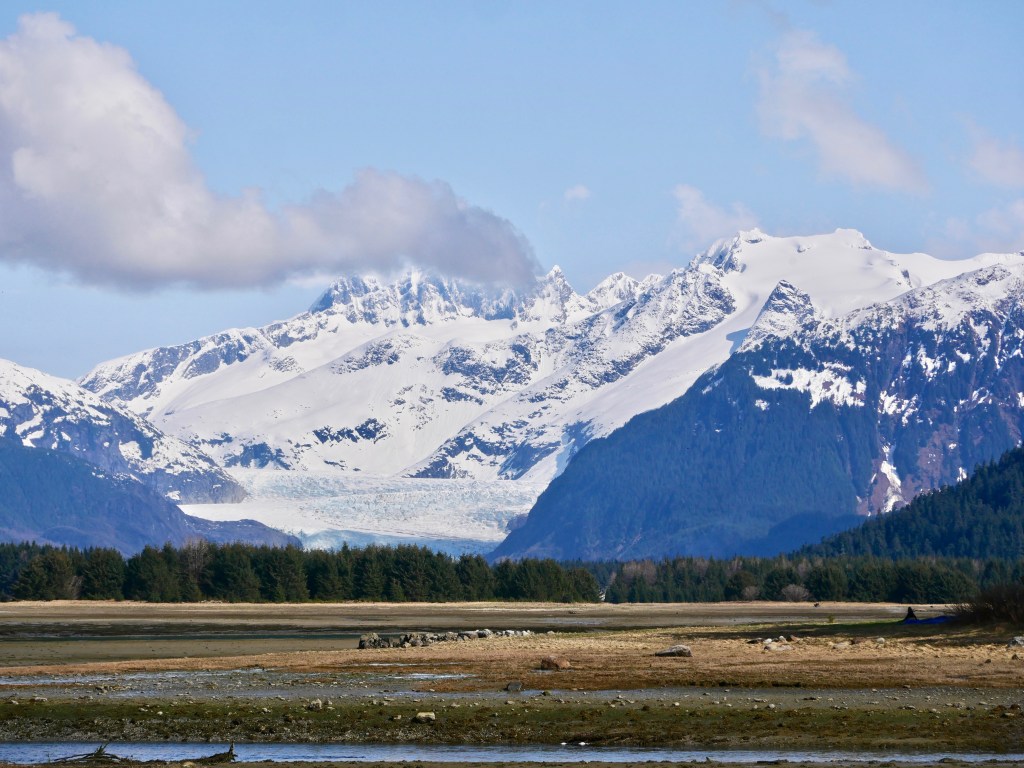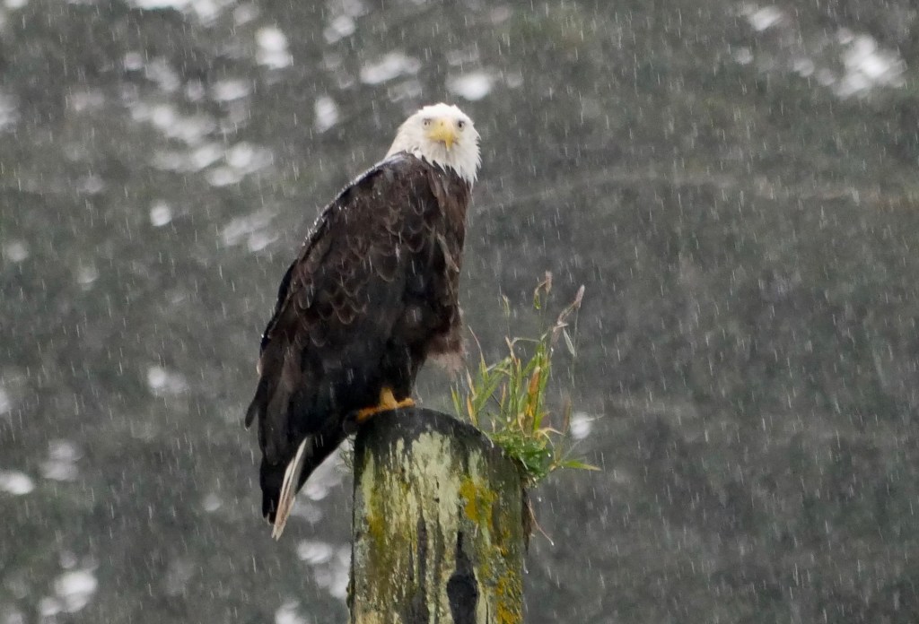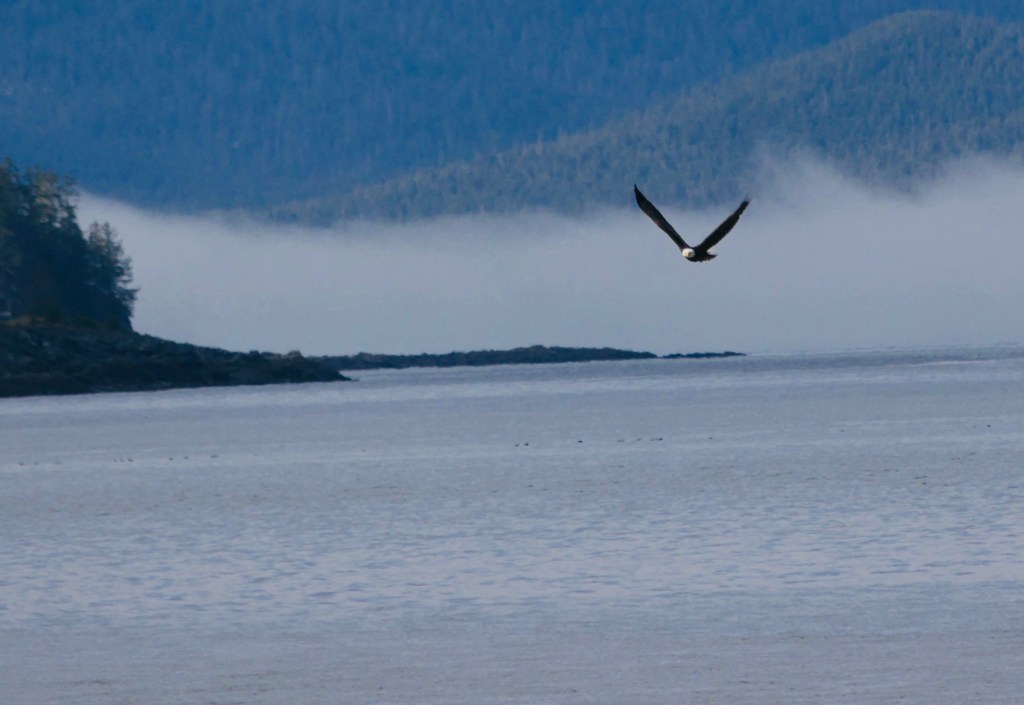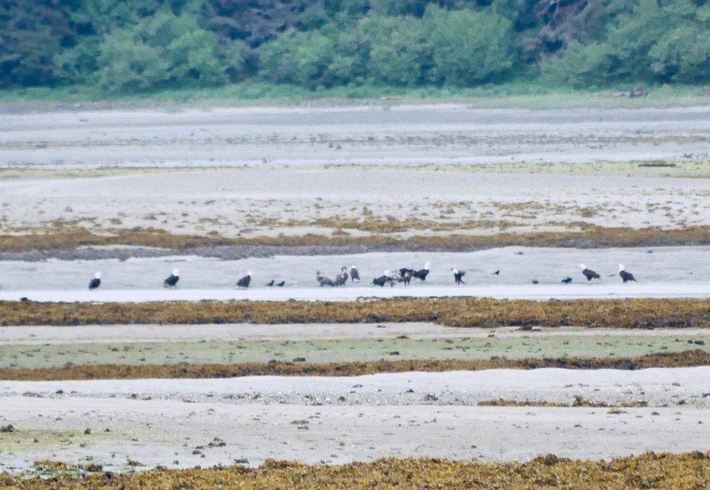 The tide was completely out when we reached the Fish Creek Delta. It was a minus three foot tide, one of the lowest of the year. A dozen bald eagles had assembled close together in a shallow water section of the Mendenhall River. Every once in a while they would burst into the air and then drop back to the river shallows.
