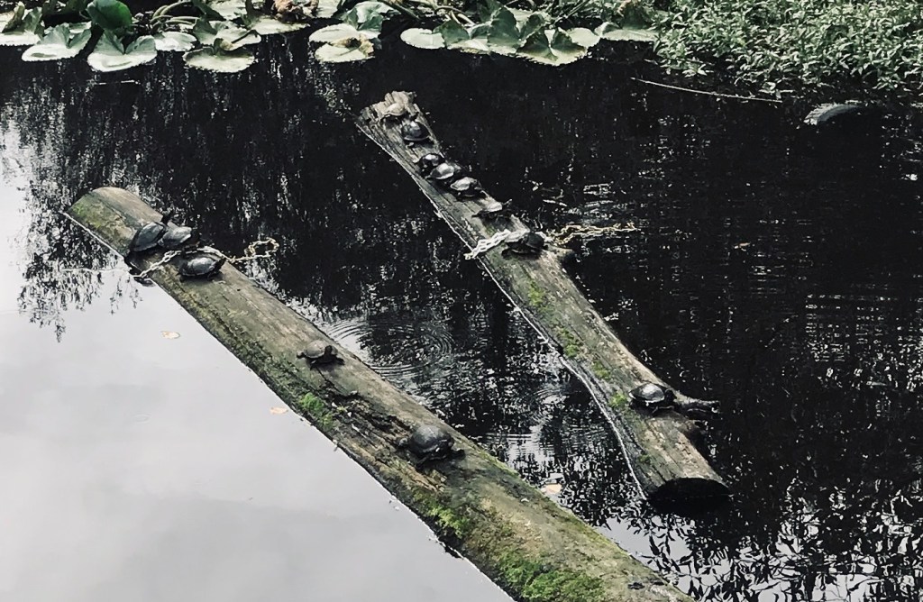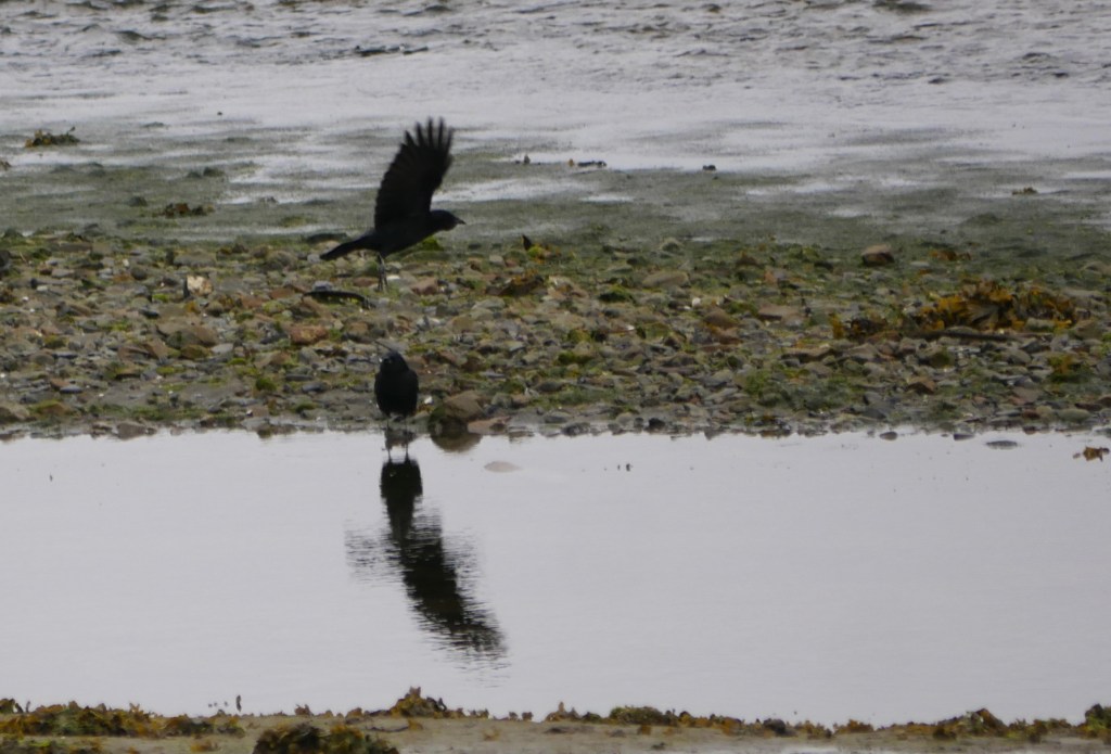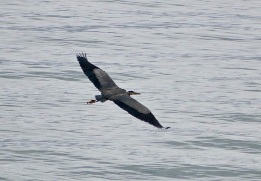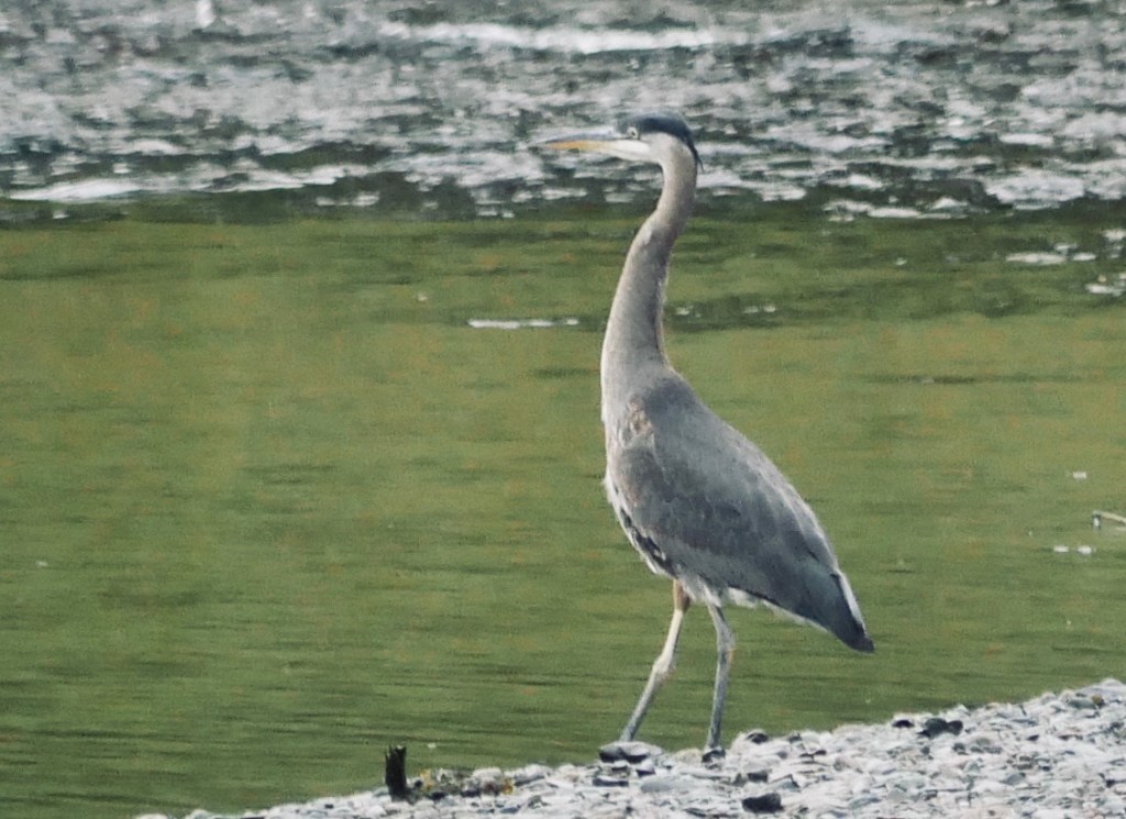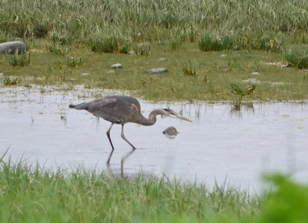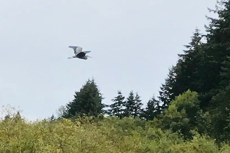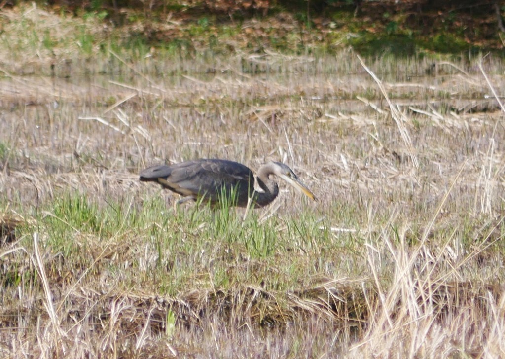 Rather than search for food exposed on the wetlands by the retreating tide, three adult heron were feeding up river, very near our trail. They must be hunting productive water because they didn’t notice us until were thirty feet away. Then, one panicked into flight and landed at the edge of a small stream fifty feet away. The other herons soon joined her. They spread out until each was a dozen feet from the other two. Then, they returned their attention to the hunt.