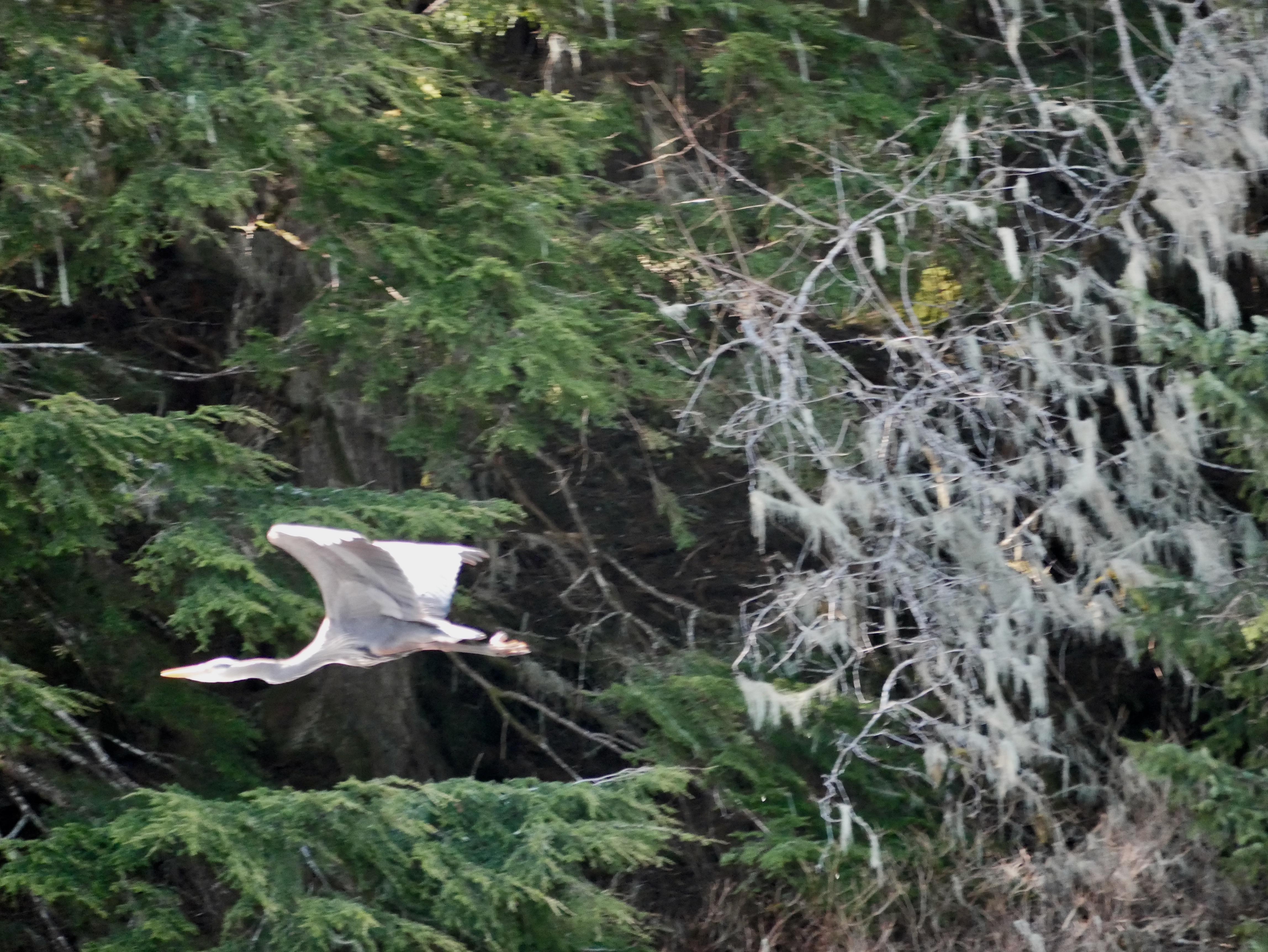 Rather than search for food exposed on the wetlands by the retreating tide, three adult heron were feeding up river, very near our trail. They must be hunting productive water because they didn’t notice us until were thirty feet away. Then, one panicked into flight and landed at the edge of a small stream fifty feet away. The other herons soon joined her. They spread out until each was a dozen feet from the other two. Then, they returned their attention to the hunt.