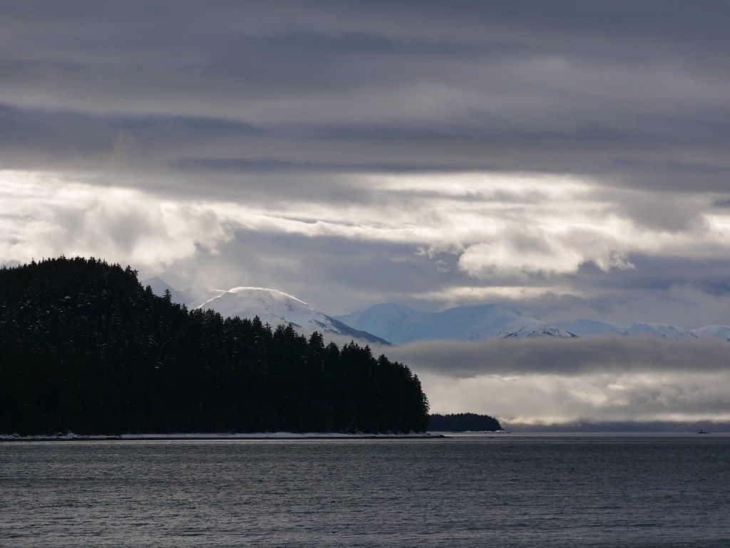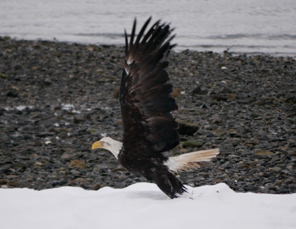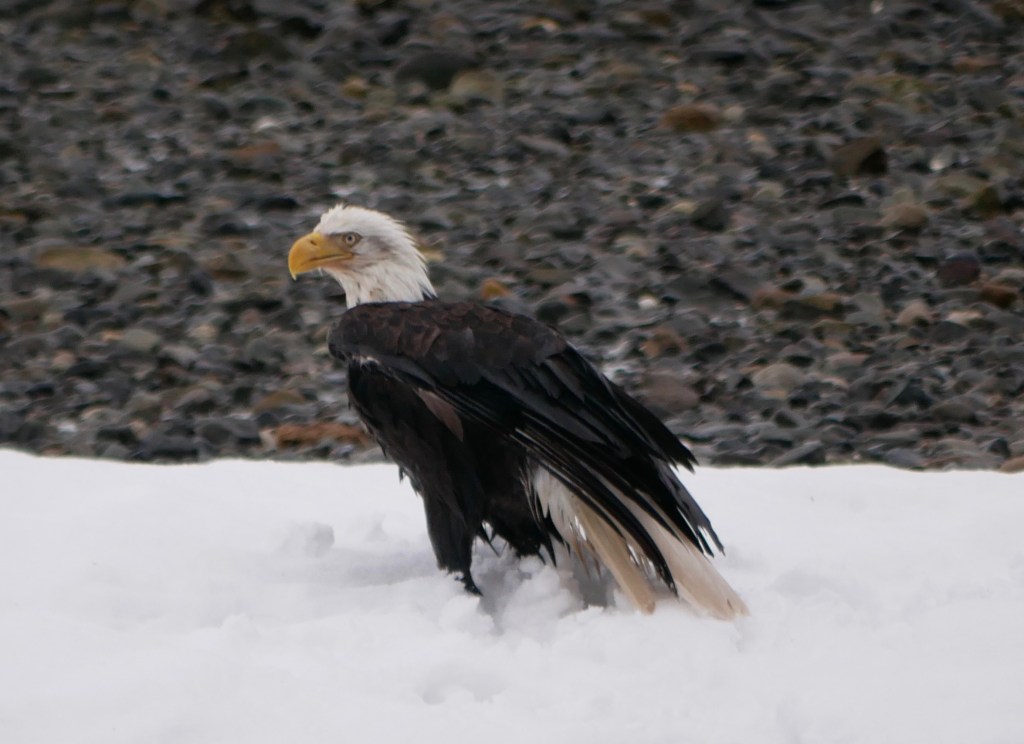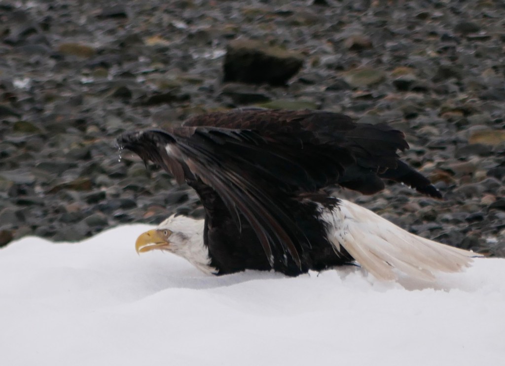We hike down to the beach as the temperature begins to fall. Mallards, gulls, and harlequin ducks are gathered together on the shore. While the gulls stay put, the ducks drop into the ocean and swim just offshore, keeping pace as Aki and I move over the snow covered ground. In a few minutes they do reverse turns and head back to their beach hangouts. I guess the birds now consider us trustworthy neighbors.