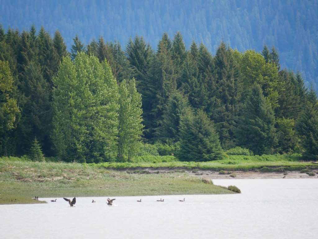 It’s June, a month for lots of bird action on Mendenhall River wetlands, at least in an ordinary year. It’s also the season for wild flowers. Wide swaths of shooting stars form magenta islands on the sea of green grass that borders the river. Buttercups and purple lupine flowers look like they are competing with each other for growth space.