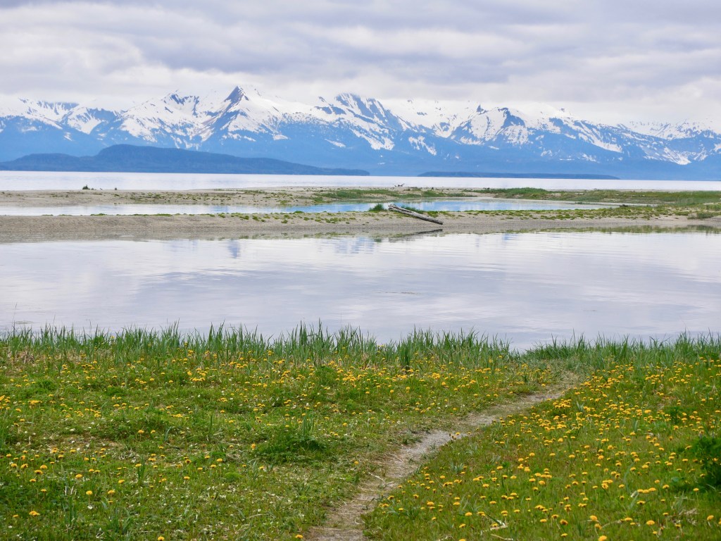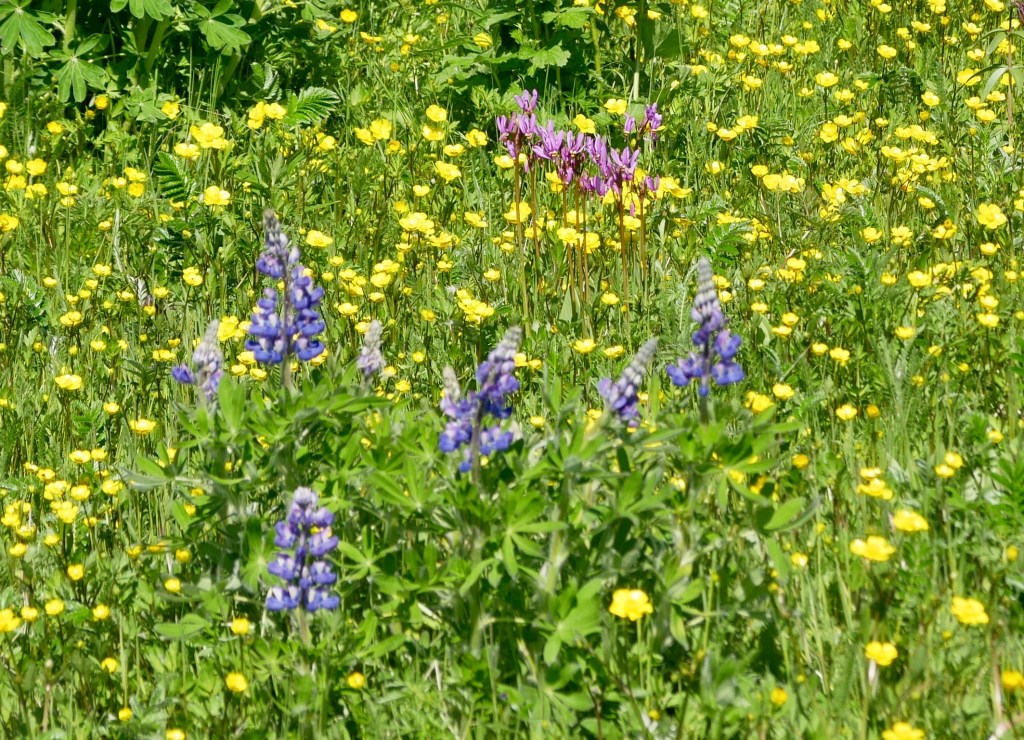 It’s June, a month for lots of bird action on Mendenhall River wetlands, at least in an ordinary year. It’s also the season for wild flowers. Wide swaths of shooting stars form magenta islands on the sea of green grass that borders the river. Buttercups and purple lupine flowers look like they are competing with each other for growth space.