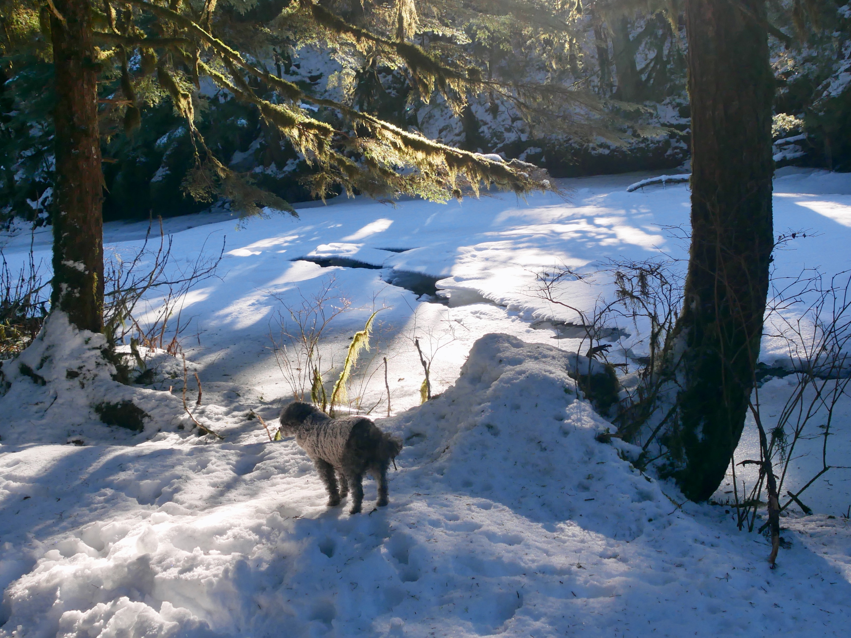 Aki turned 14 last Fall. If she were a more normal dog, she would act like she was almost 100 years old. Most folks think she is still puppy. All I know is that she hasn’t started to slow down yet. Today, her other human and I are crossing Mendenhall Lake using cross country skis. The little dog trots just behind me, her little tail beating back and forth like a metronome.