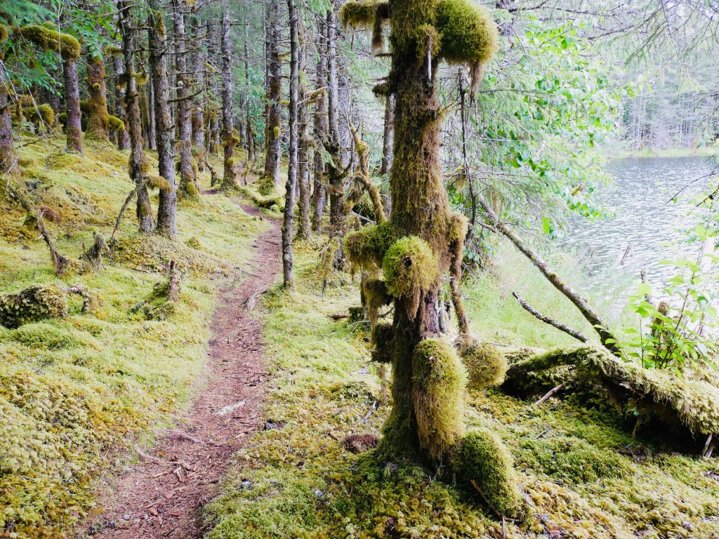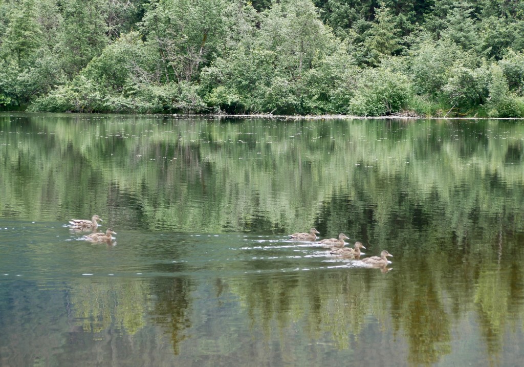 Aki, our other human and I drive out to the glacier in hopes that the snow covering the lake’s beaches hasn’t softened to mush. We find it perfect for skiing. Recognizing that we have finally gotten a break, we use our cross country skis to work along the beach and bays. No people, birds, or bears share the lake ice with us. In no time we make it to the Mendenhall River and ski down it to where it almost touches the campground ski trail. We will use that trail to return to the car. I am once again disappointed not to see the swans that normally feed in the river this time of year. Perhaps, they are waiting for Spring to finally appear.