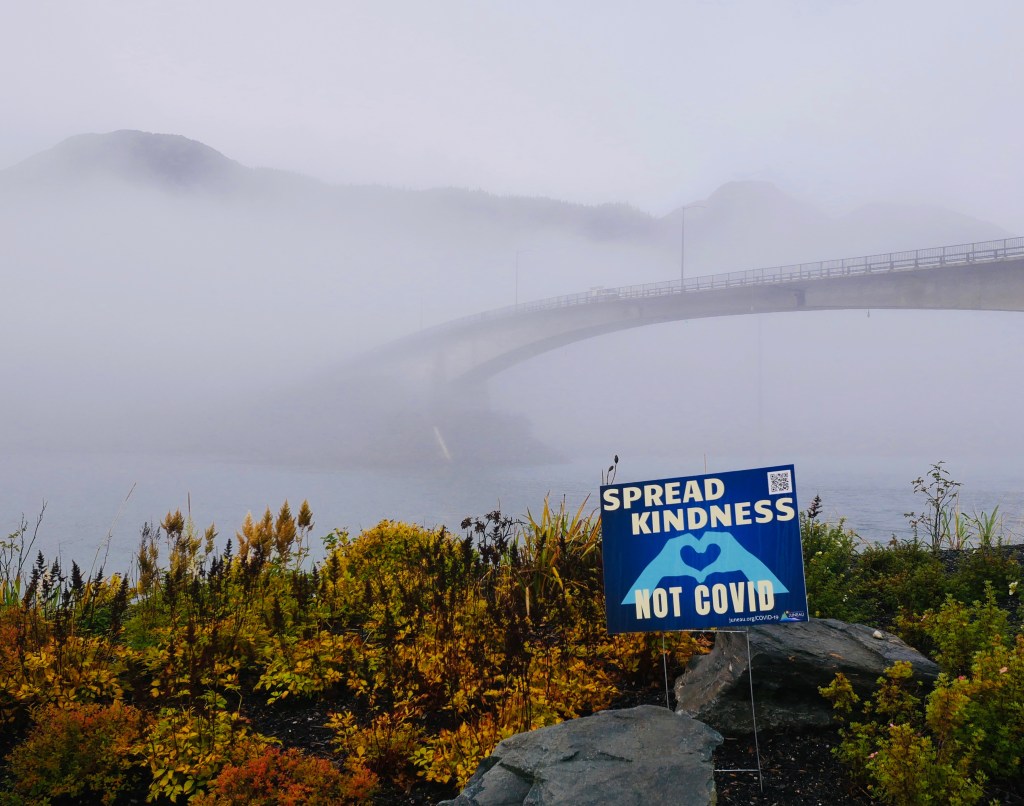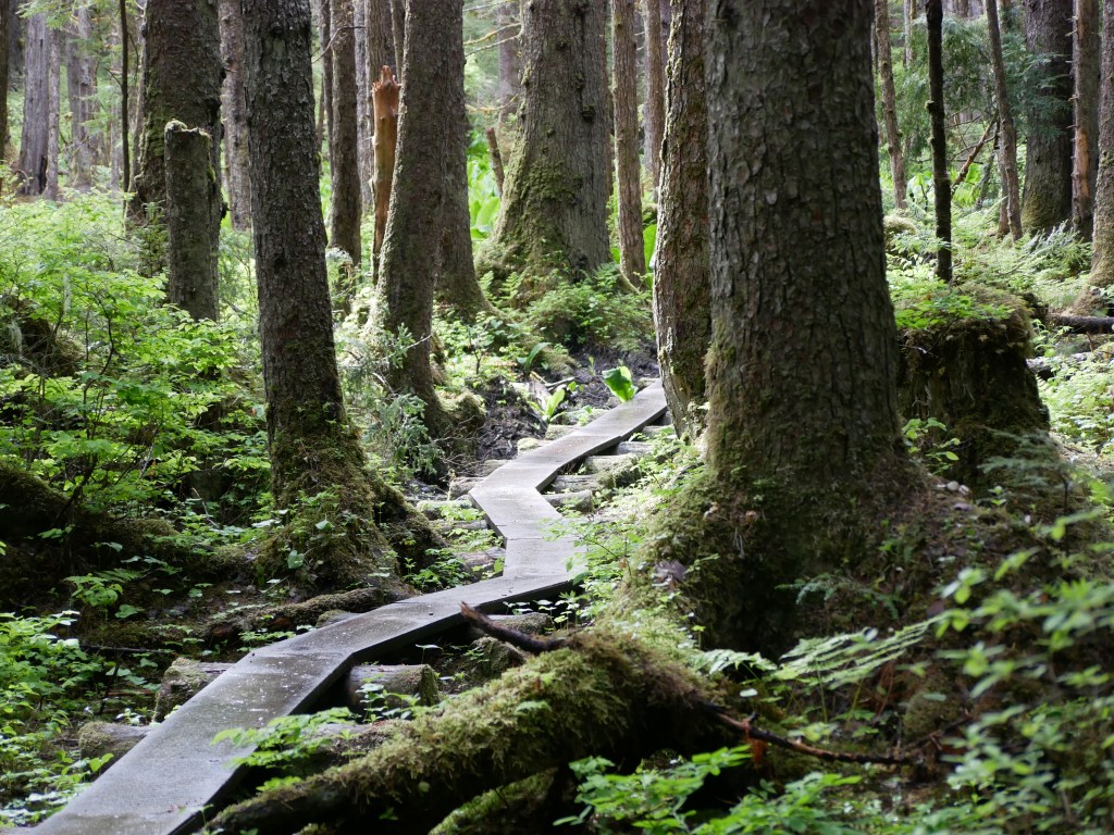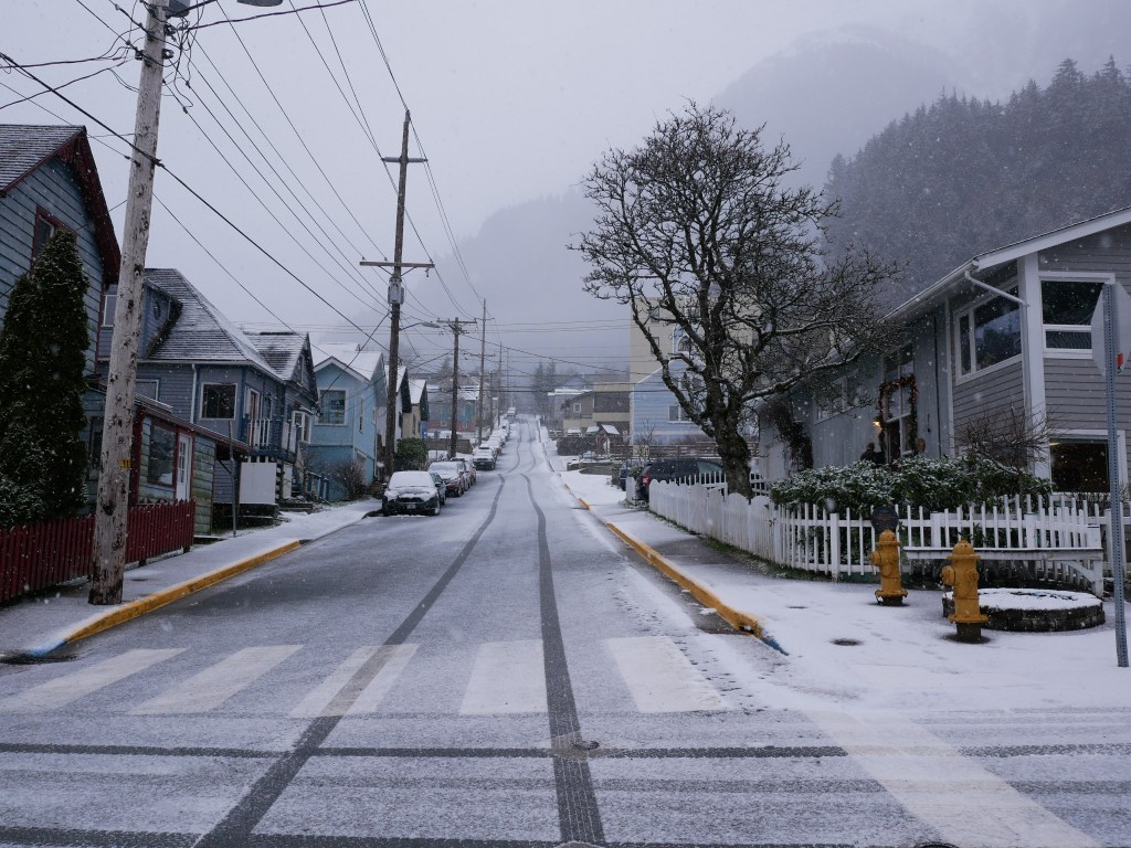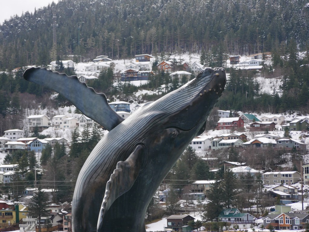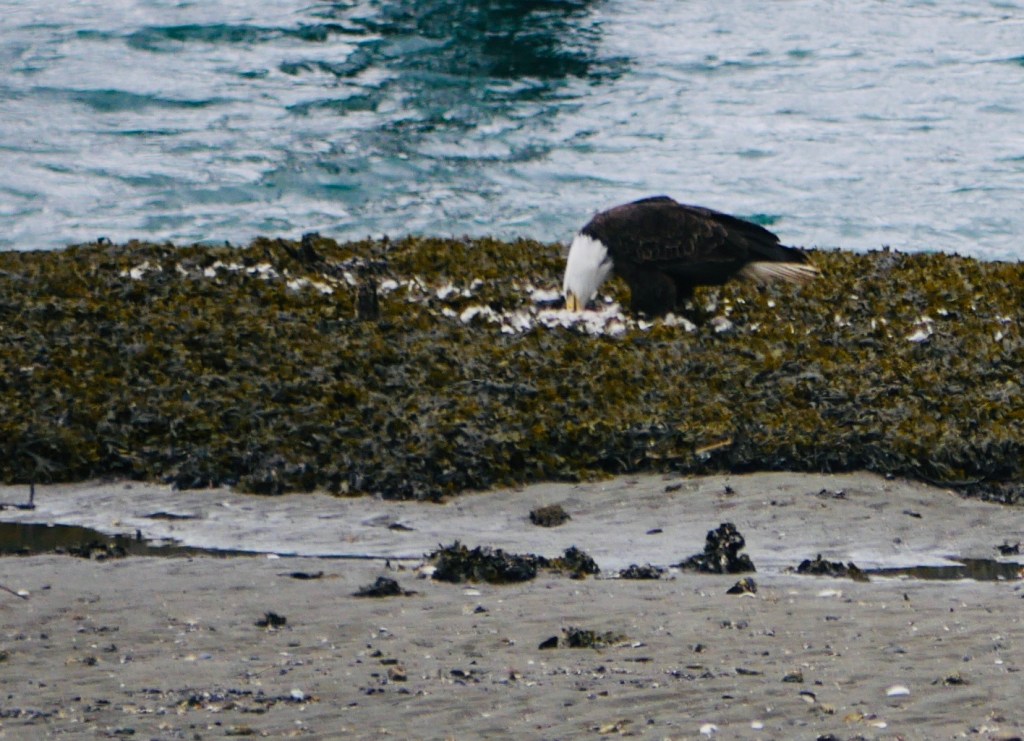 We walked down Goldbelt Street and onto the flats, stopping often to allow her to scent and pee. Thick, wet clouds swallowed up the sun by the time we reached the humpback whale statute. Just off shore two bald eagles leaned against each other on the top of a Coast Guard channel marker. A bunch of ravens watched them from the beach. Suddenly, one of the eagles flew over to the beach and started ripping flesh from a gull’s carcass. Just before Aki and I moved on, a raven landed near the eagle and started encouraging it to share some of the meal.