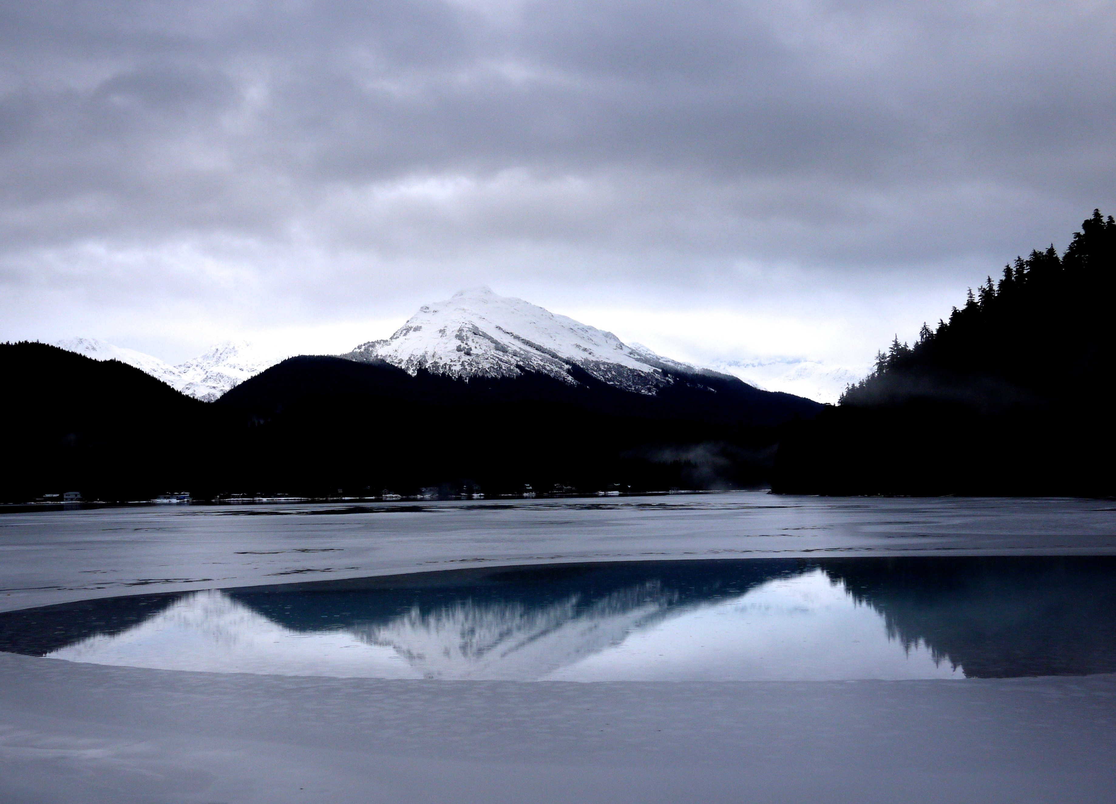 I honor Santa Lucia during this icy walk on around Auk Lake. It’s high noon on a day with no hope of sun. No blond haired virgin with a candle wreath in her hair greets us with strong Swedish coffee and a tray of saffron buns. She must not have the ice cleats needed to navigate the trail. I honor the patron saint of light by gazing into a reflection of Mt. McGinnis in a shallow pool of melt water that spreads over the lake ice. “Here,” the reflection promises, “is a taste of the long light of June.”