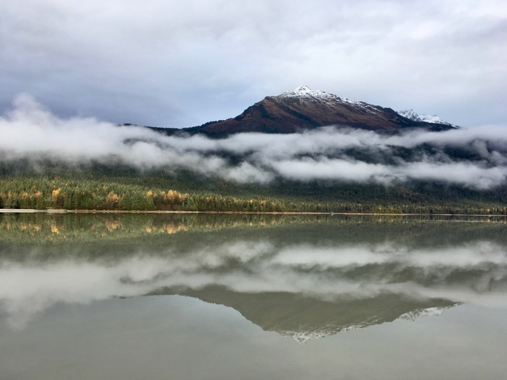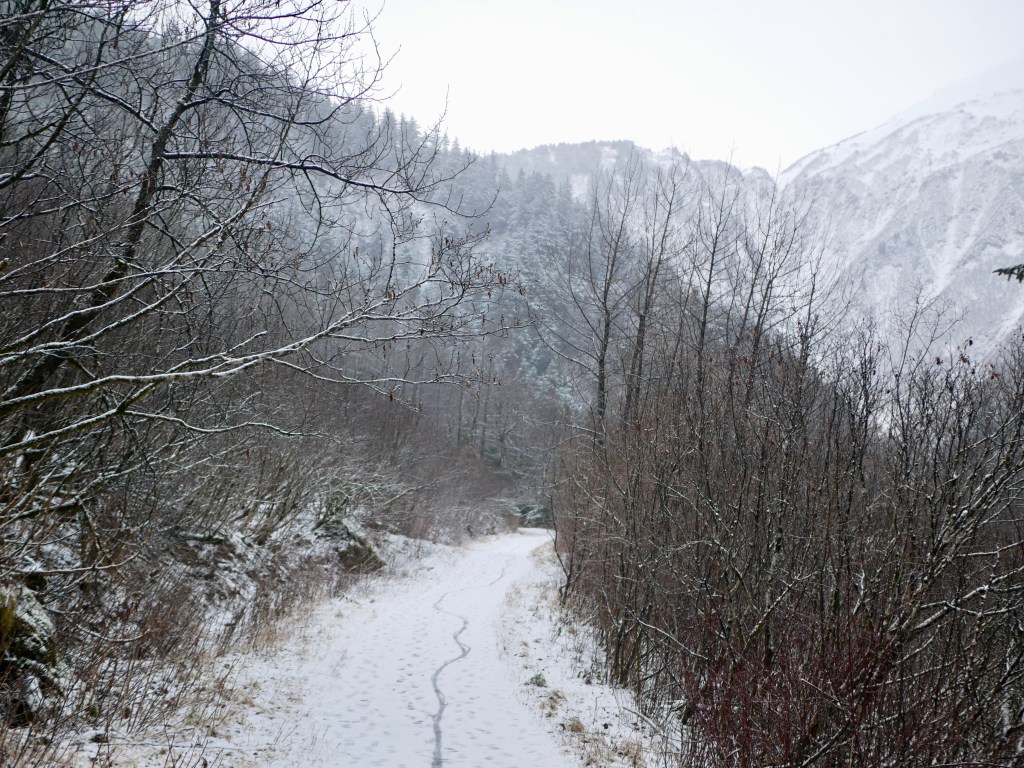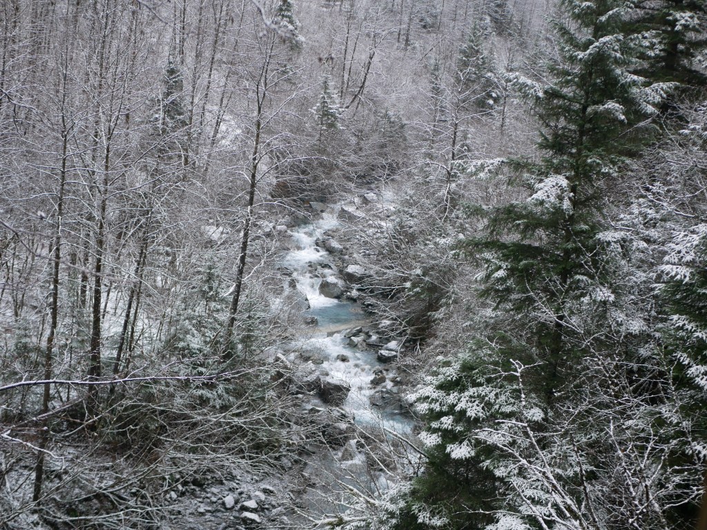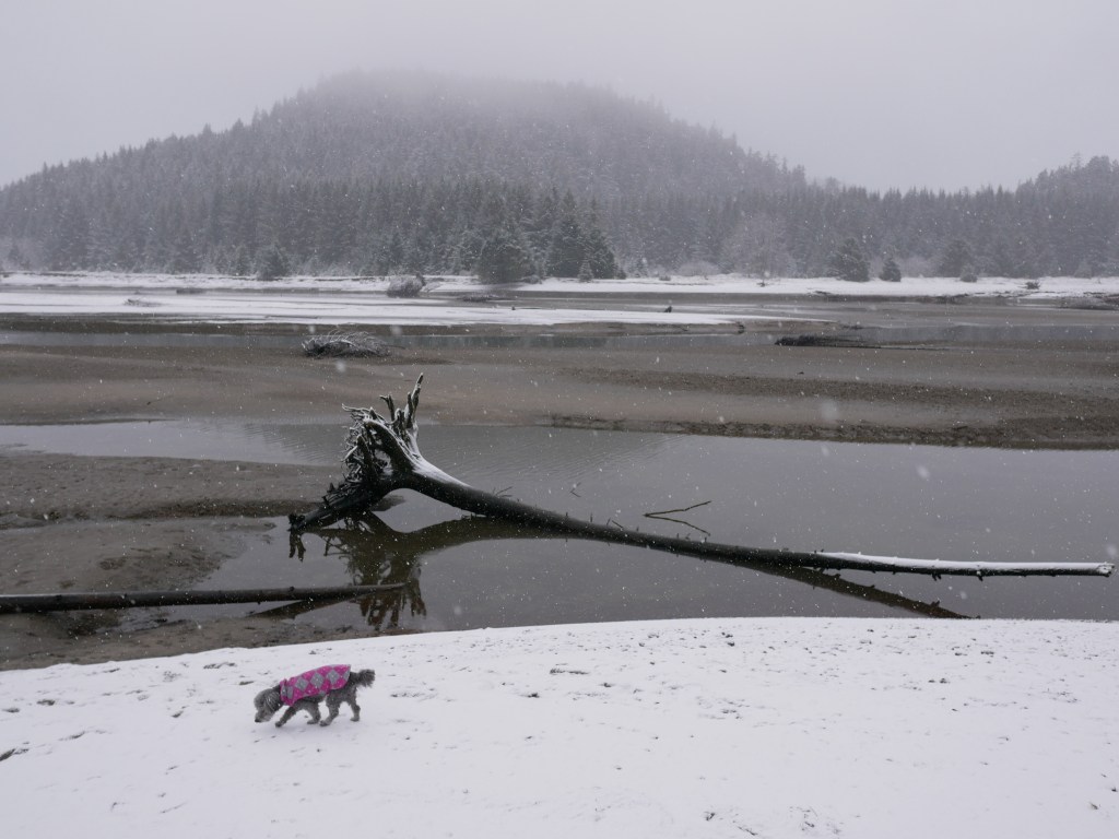 But this morning, a snow storm dropped on us, hiding mountains and even the little islands that fill Lynn Canal. Aki is still excited to climb in the car. It takes twenty, maybe thirty miles to reach the river. We see few cars on the ride. We are the first one to arrive at the river’s parking lot.