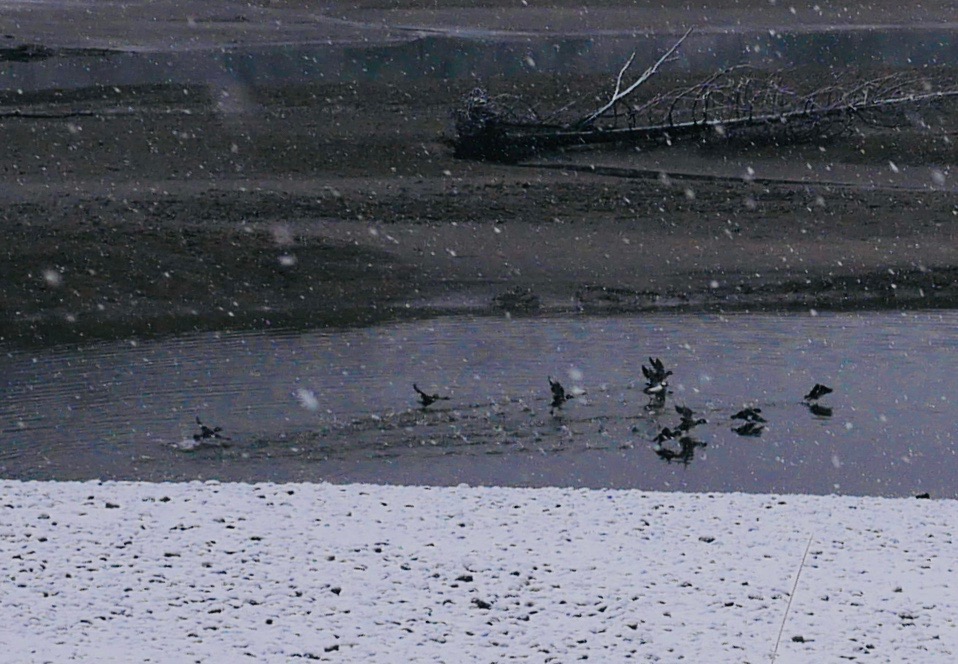 Aki is slow at first, to follow me down the trail. I wonder if she wants to wait for other dogs to arrive. Now that she is 14 years old, she has greeted many of hiking dogs. There is none to greet her as we move down river. The little dog cheers up when we reach the mouth of the river and watch a small catch of ducks burst into flight.