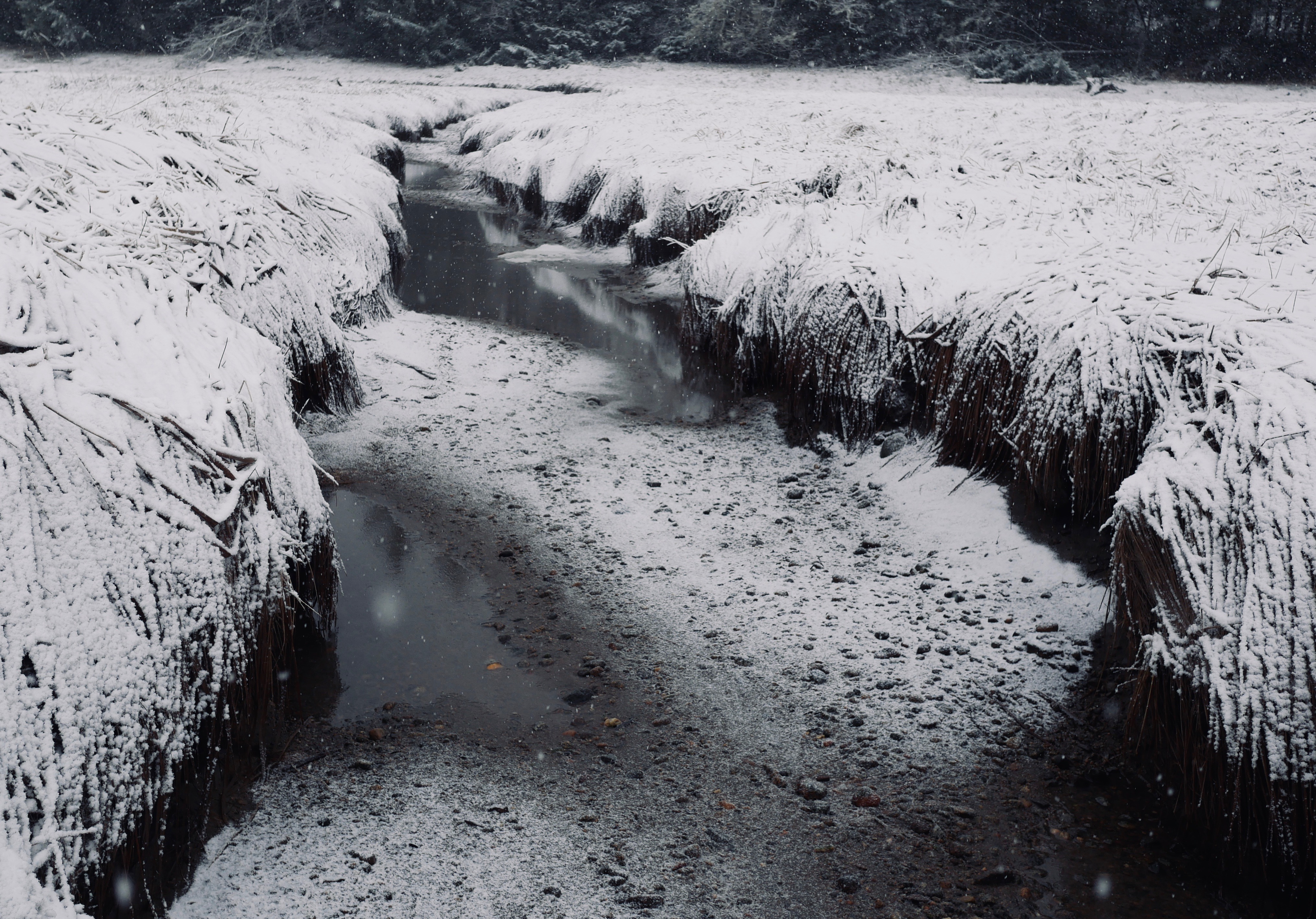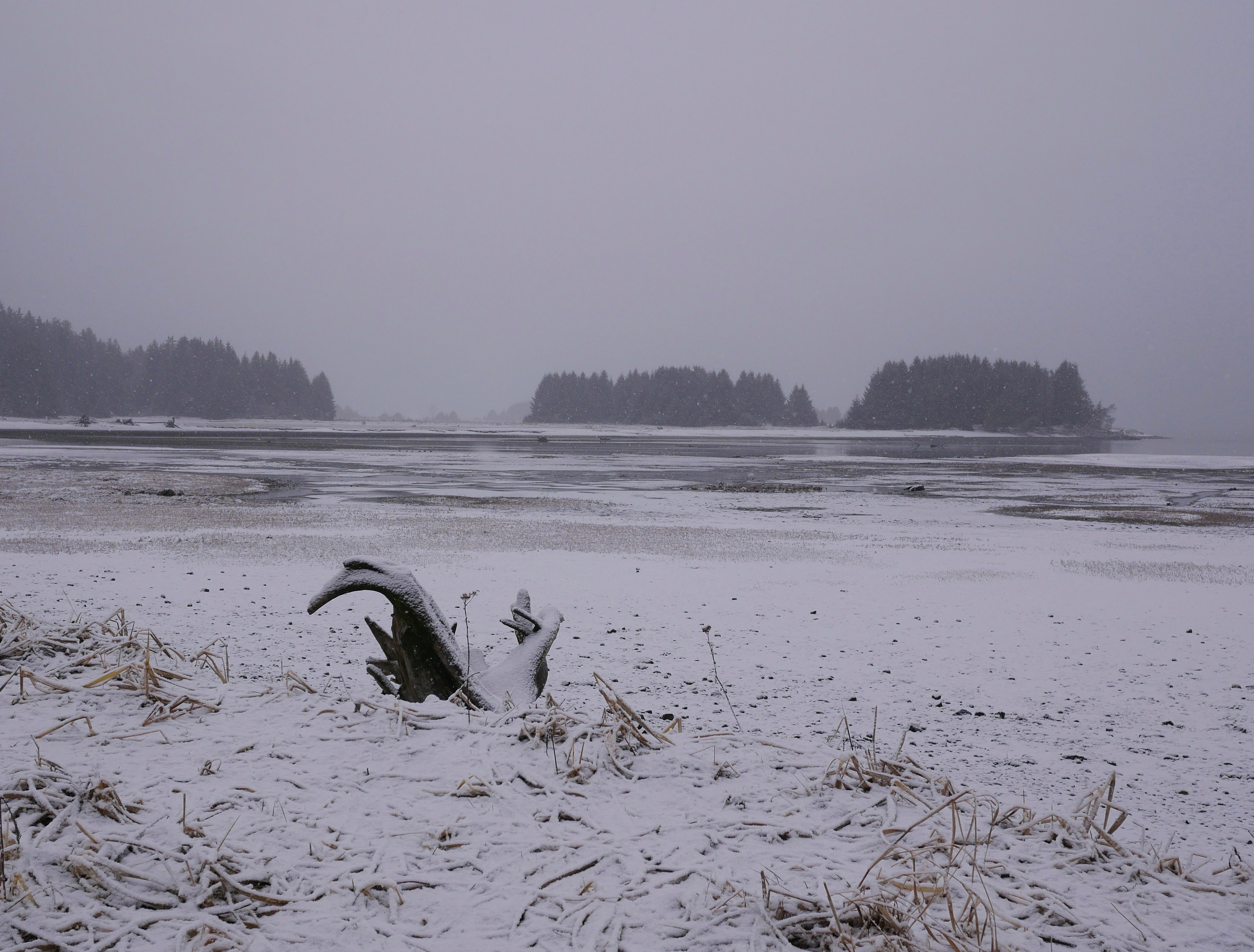 But this morning, a snow storm dropped on us, hiding mountains and even the little islands that fill Lynn Canal. Aki is still excited to climb in the car. It takes twenty, maybe thirty miles to reach the river. We see few cars on the ride. We are the first one to arrive at the river’s parking lot.