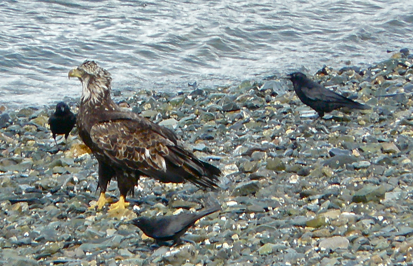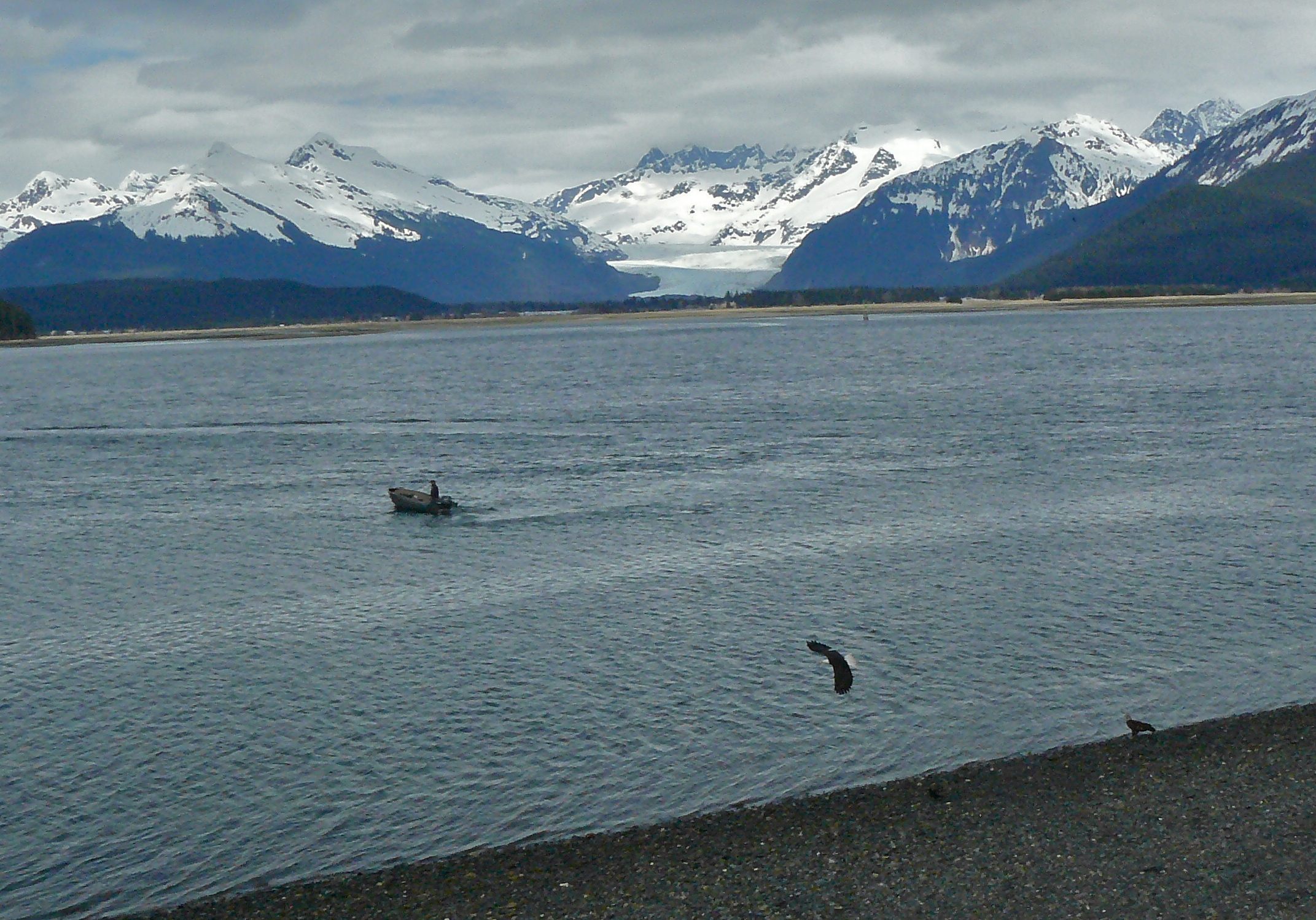 Rounding a point we find a gang of gulls and two ravens. The gulls ride waves just offshore while the ravens huddle nearby. They and all the beach are in a gloom made darker by the bright whiteness of the glacier and its consort mountains now standing in full sun. This is one of the few places the birds find food during the winter famine.