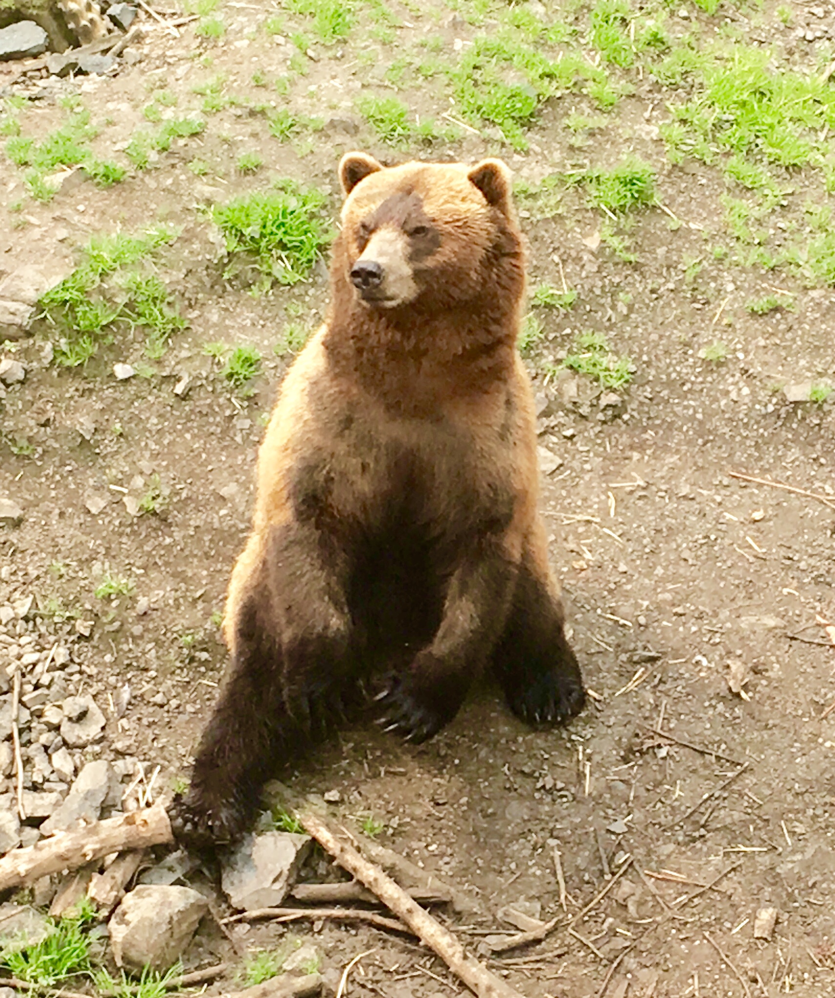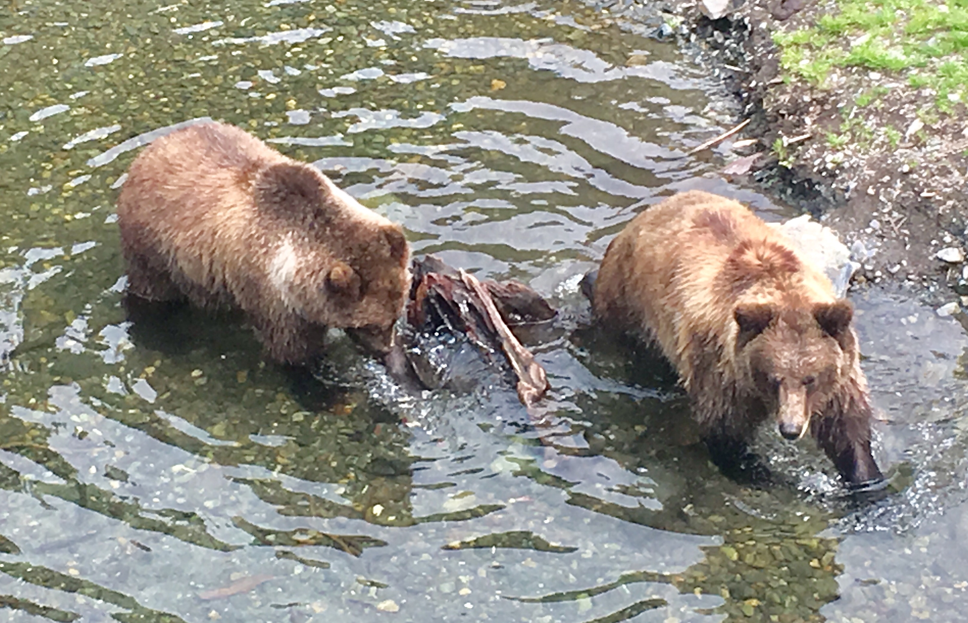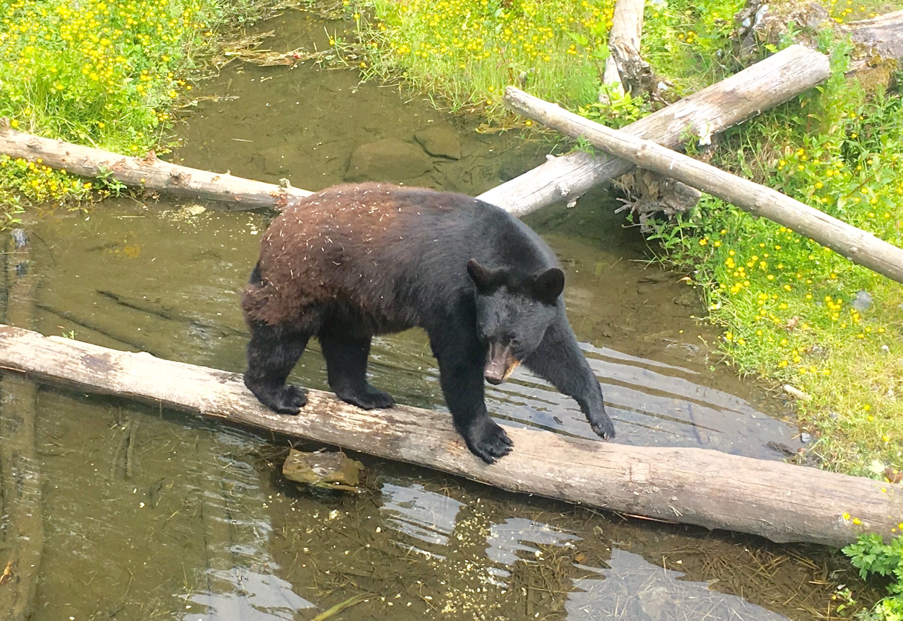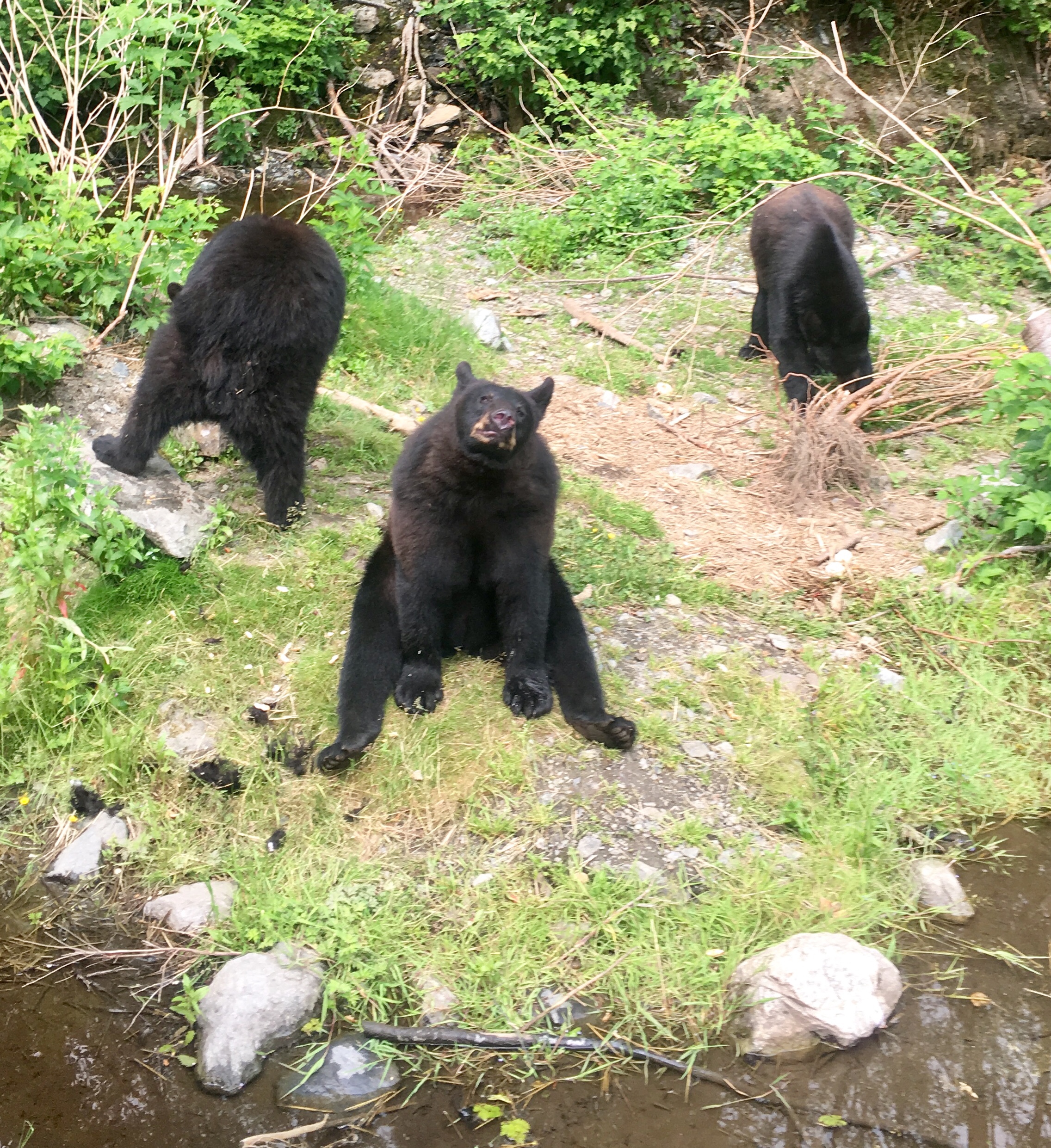 Before the hike, I visited the Fortress of the Bears. Aki stayed in the car. The fortress founder has filled the scoured out mixing tanks of a defunct pulp mill with orphaned black and brown bears. Except for a clownish black bear, the critters in the fortress have retained their natural dignity. From a safe view point above the tanks, you can watch the bears feed and wrestle with driftwood logs. Ravens and eagles skulk in the trees that line the tank enclosures. I enjoy the views but was thankful not to share them with the little poodle-mix.