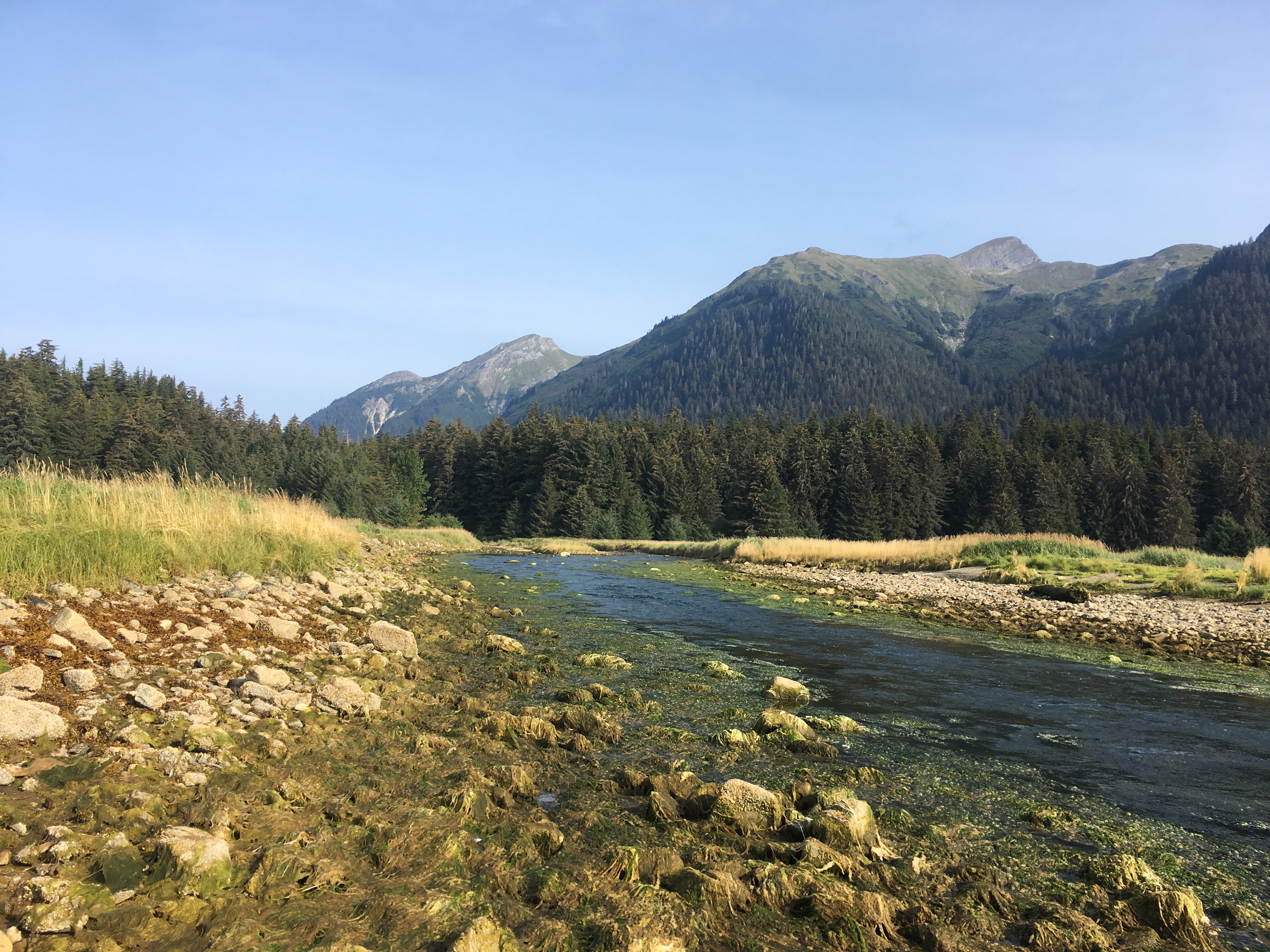 Three eagles circled above the creek but I could not figure out what they were hunting. Until we reached the creek mouth, the only other evidence of life would be a three-toed woodpecker prospecting for bugs in the bark of an alder.