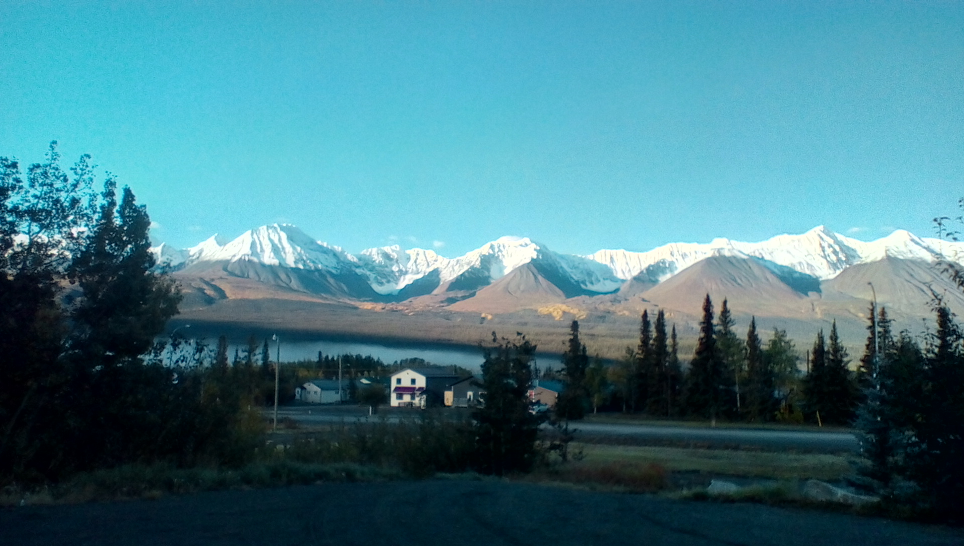 Fog covered the Alsek River this morning at Haines Junction. But even before sunrise we could see the St. Elias Mountains. They stood like an eroded wall between the Yukon Territory and the Pacific. Their lower flanks were exposed yesterday evening when thick shafts of sunlight powered through to illuminate the thinning cloud cover. I almost expected saints to descend from Heaven.